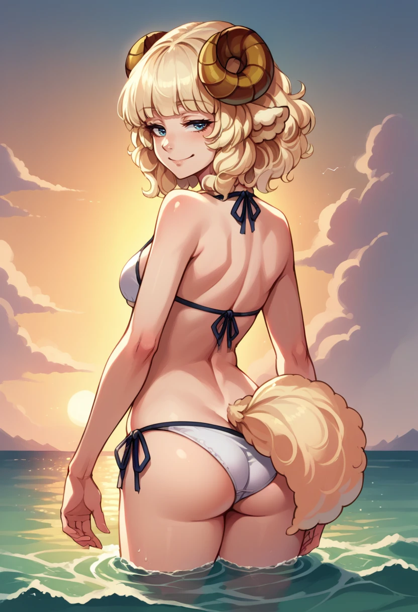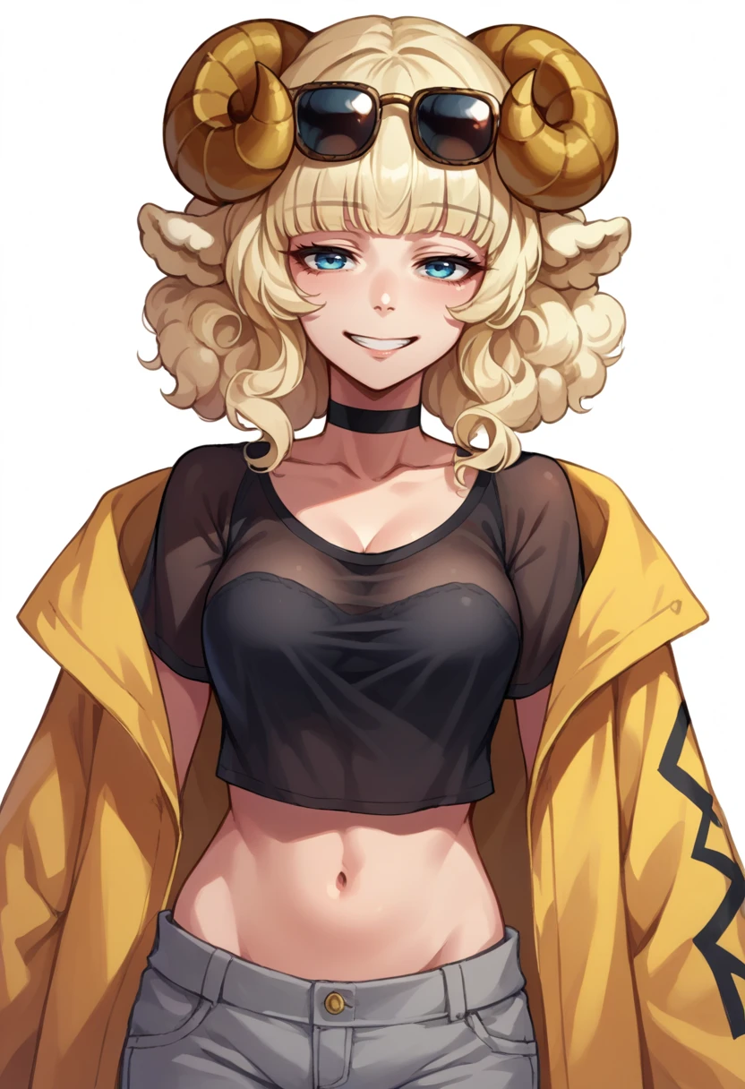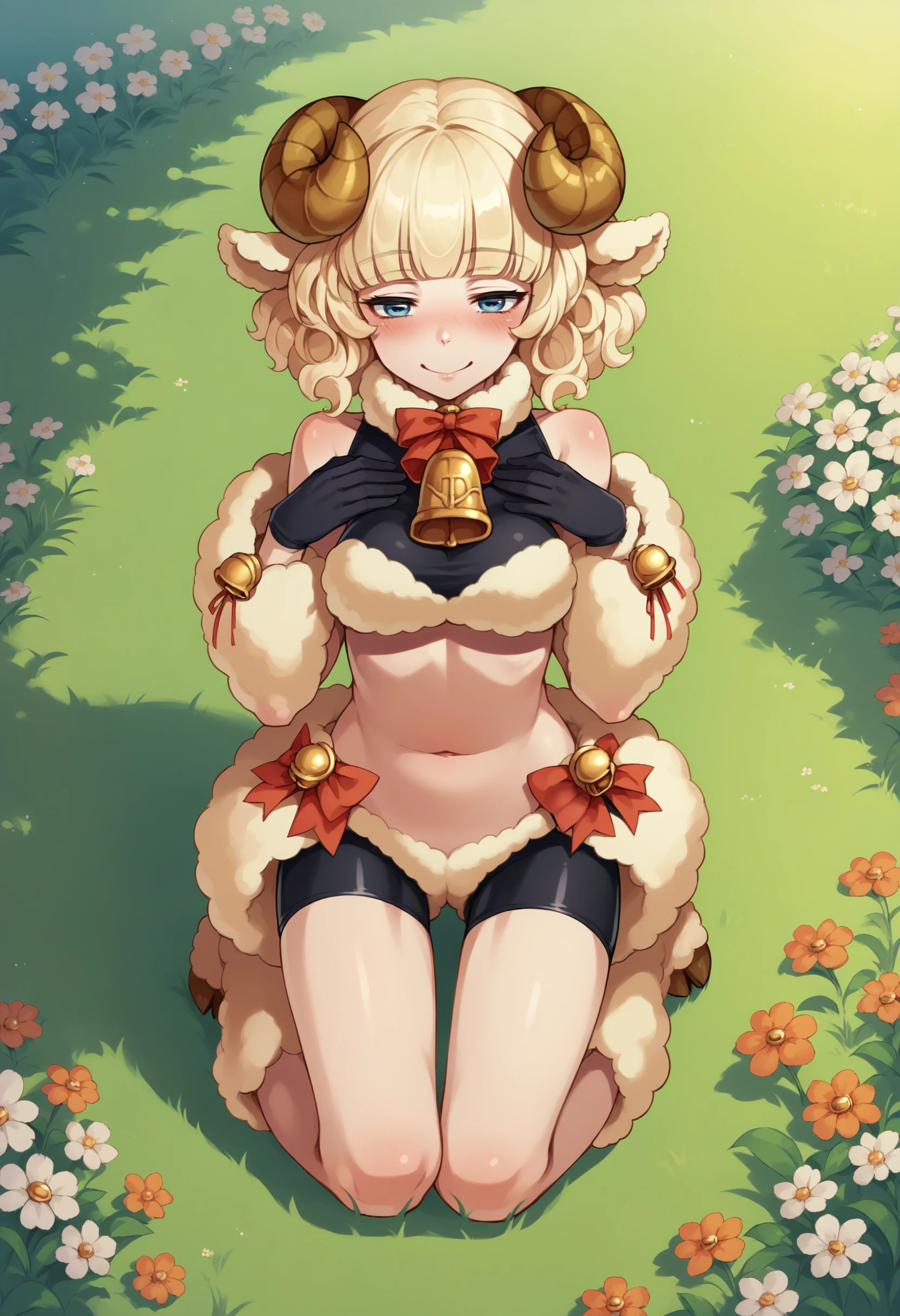 Weresheep, blonde hair, blue eyes, horns, sheep ears, hooves, fur-trim, neck bell, crop top, black gloves, bike shorts, leg warmersLet me know if you have any issues.