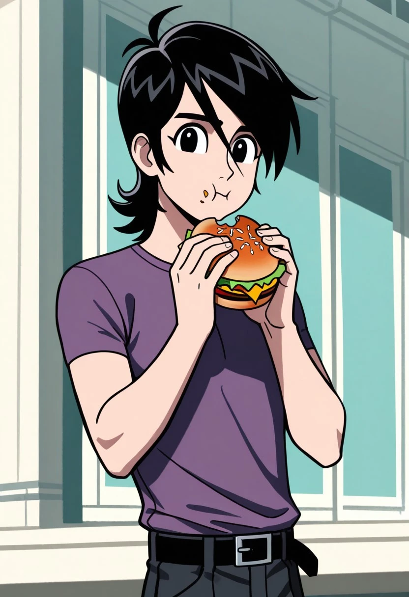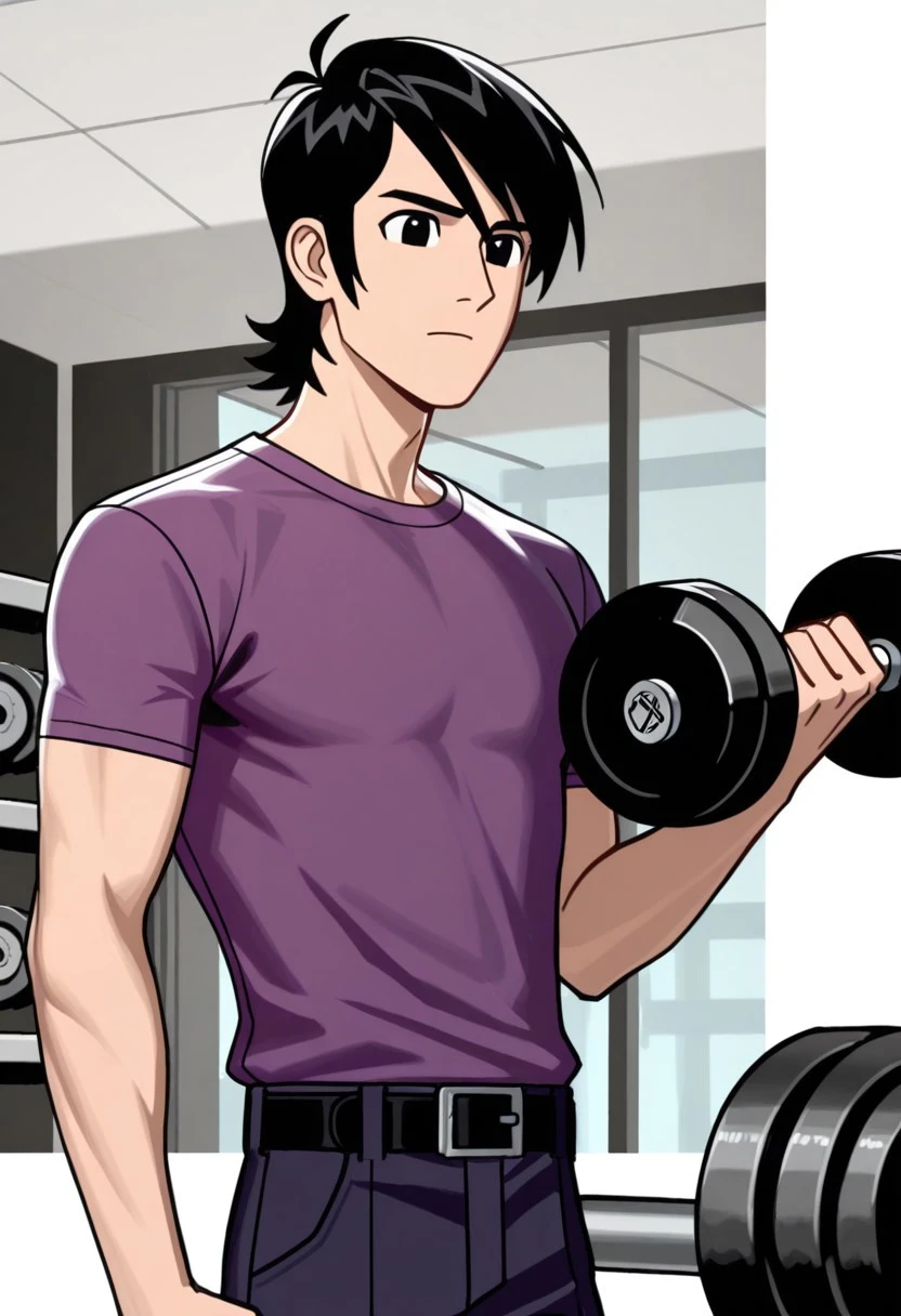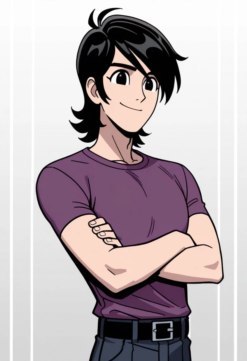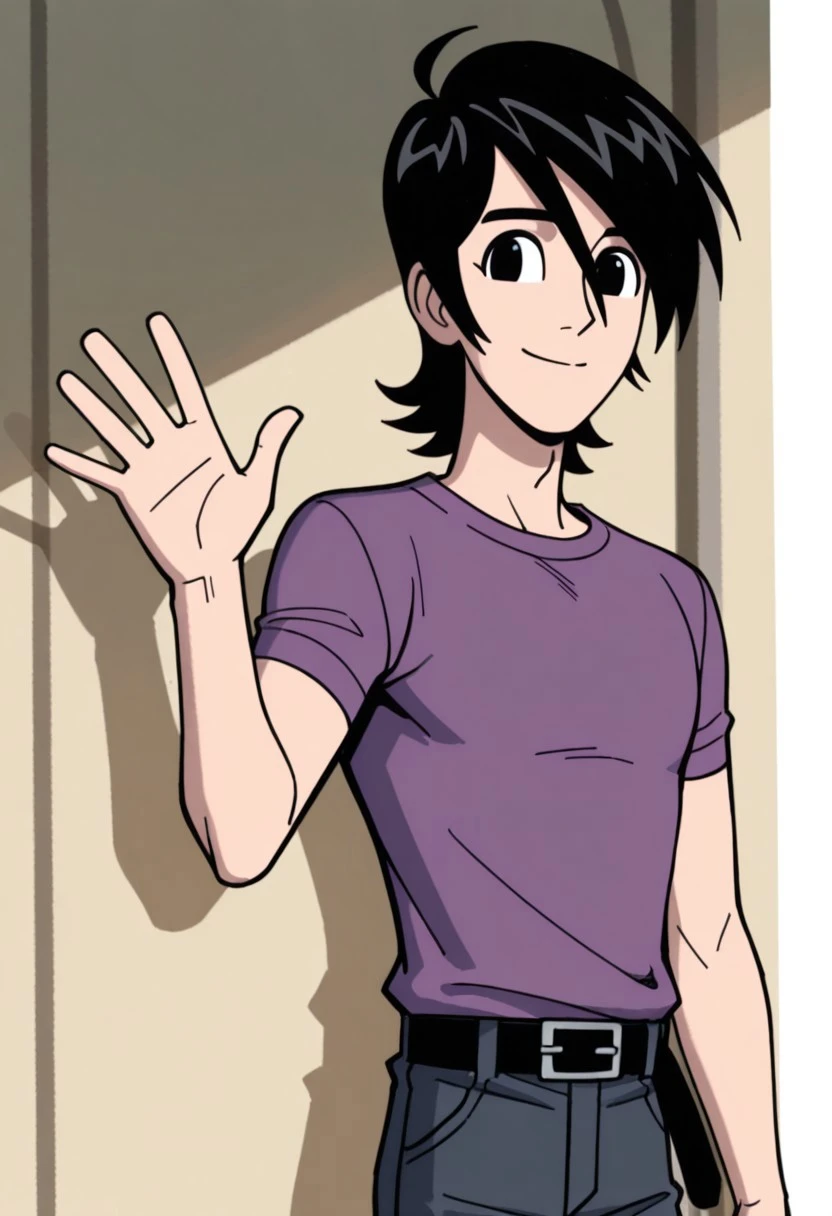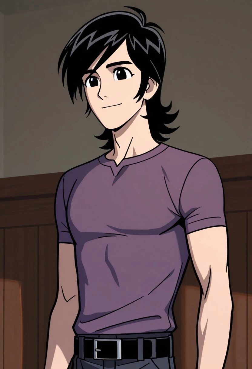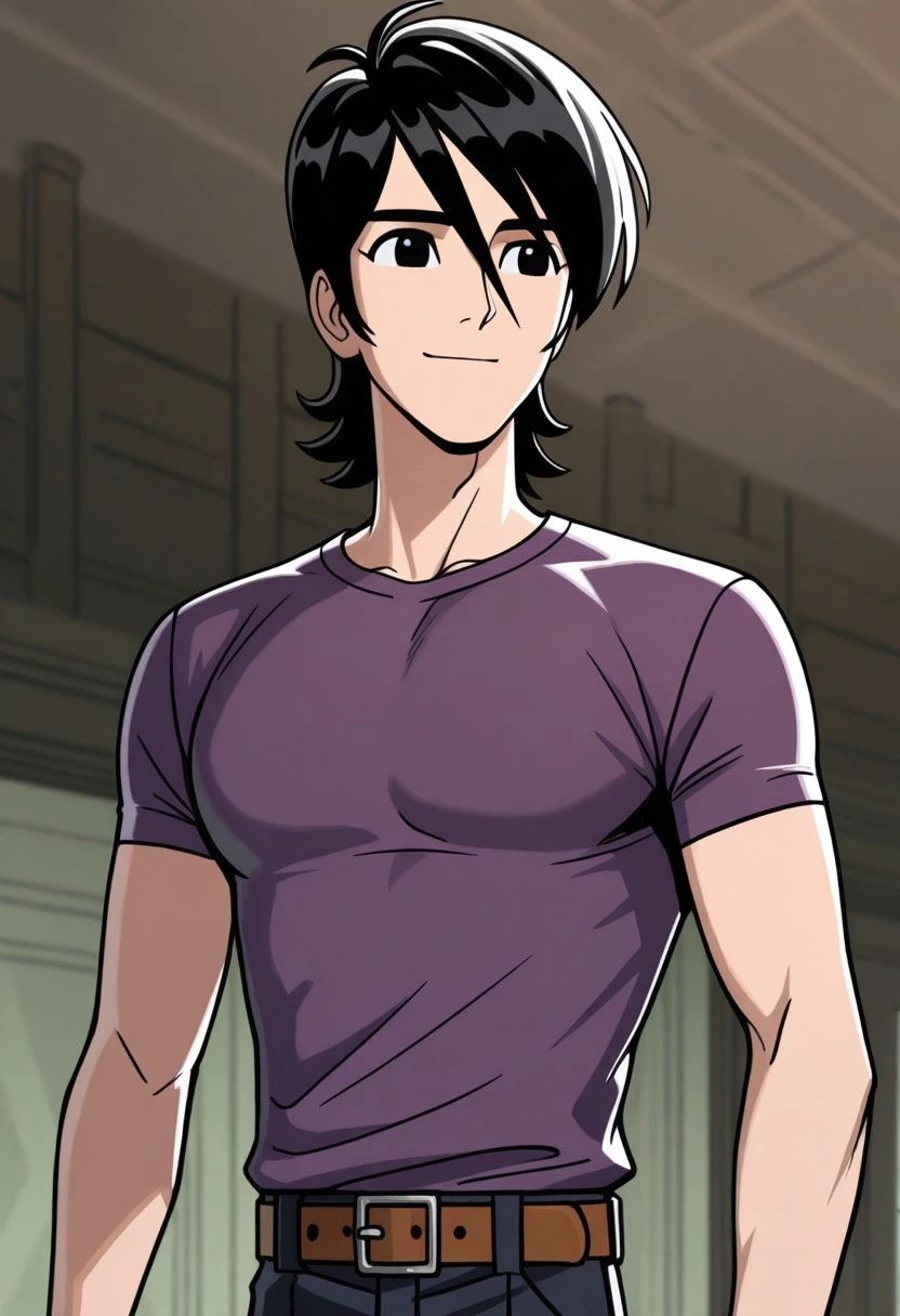 symbt_Lance,1boy,solo,black hair,black eyes,male focus,purple shirt,short sleeves,pants,belt,upper body