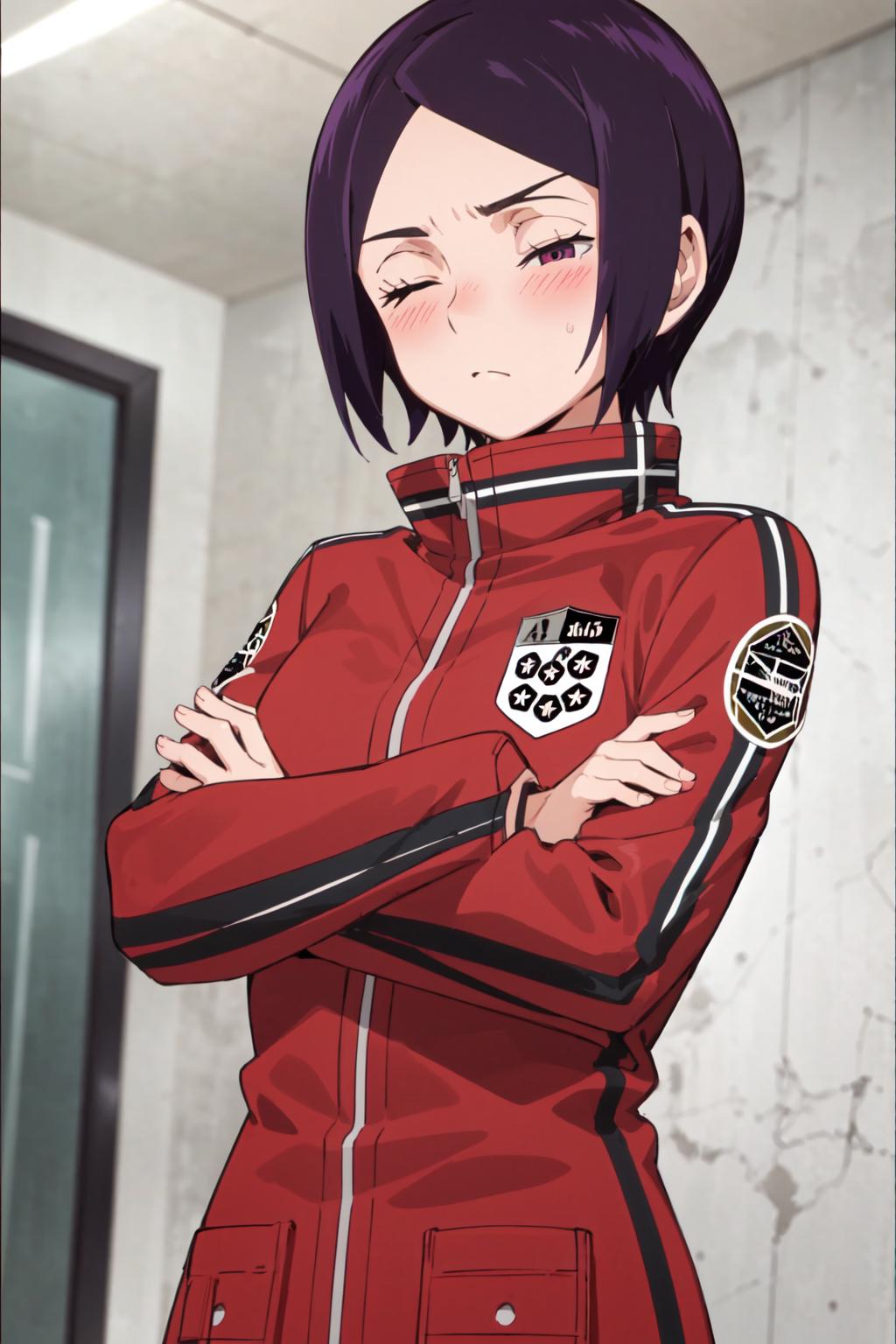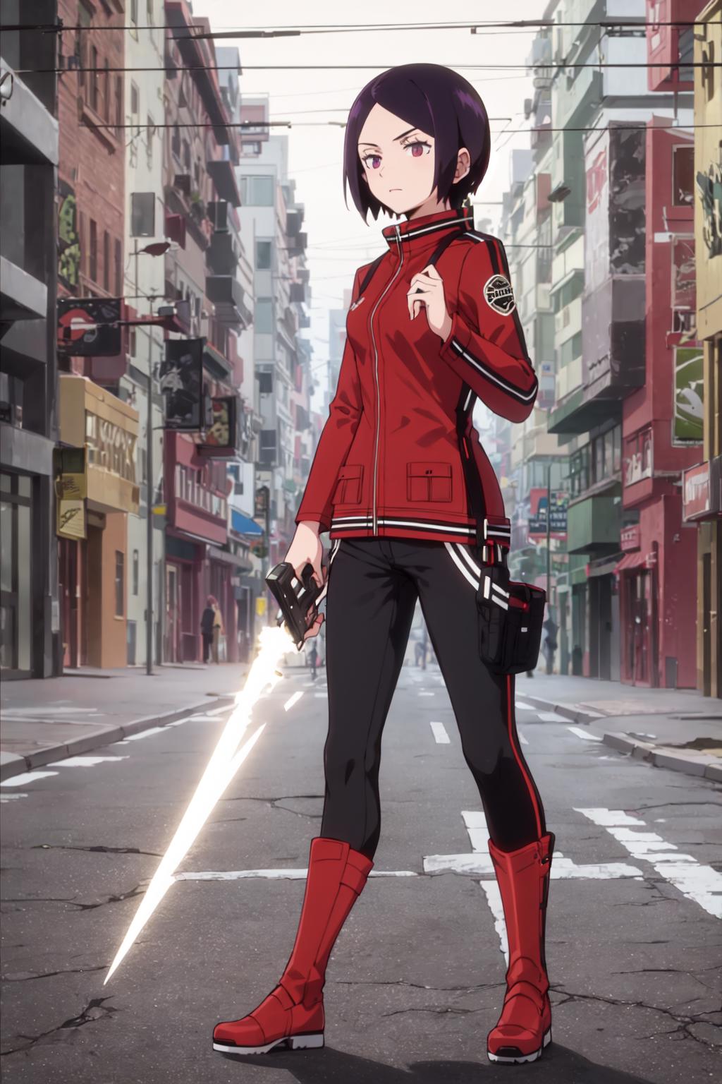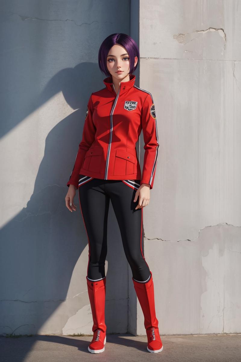 Base Outfit: red jacket, black pants, red footwear,boots