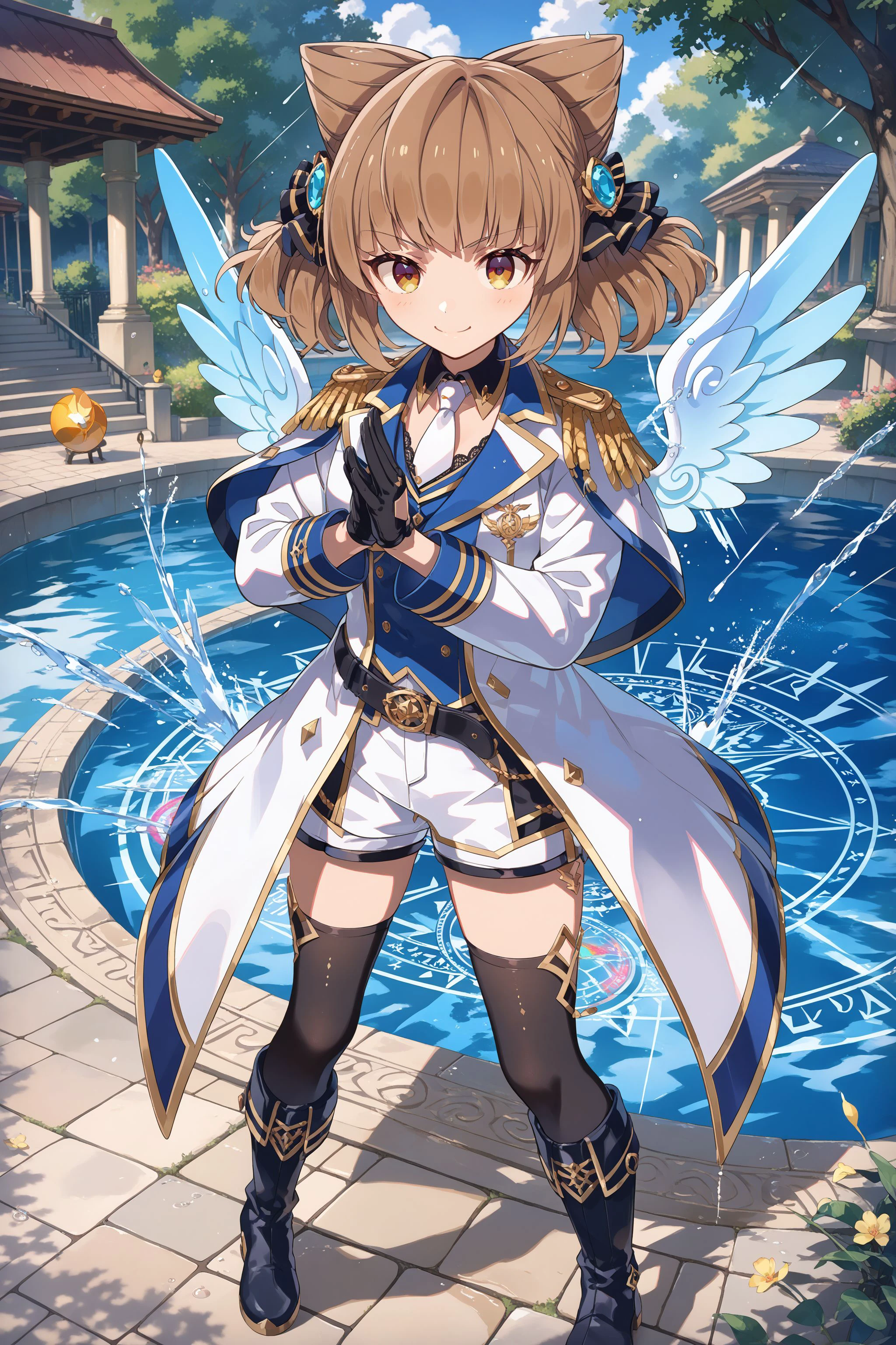 formal: white jacket, wing_collar, white_necktie, long sleeves, epaulettes, gold_trim, aiguillette, black gloves, half gloves, short shorts, white_shorts, belt, black thighhighs