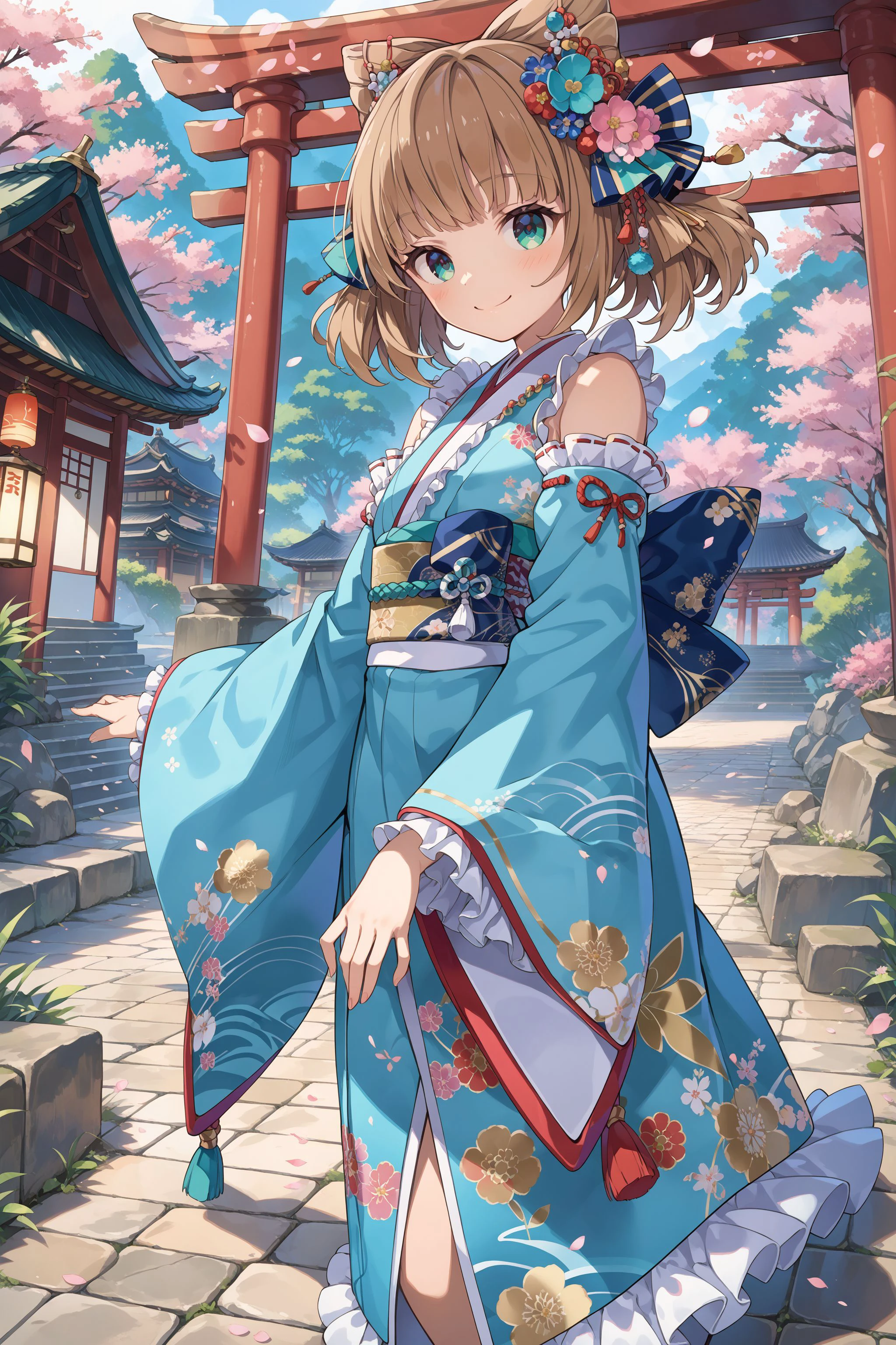 japanese cloth: japanese clothes, kimono, floral print, bare shoulders, frills, long sleeves, detached sleeves, wide sleeves, frilled_sleeves, thighlet