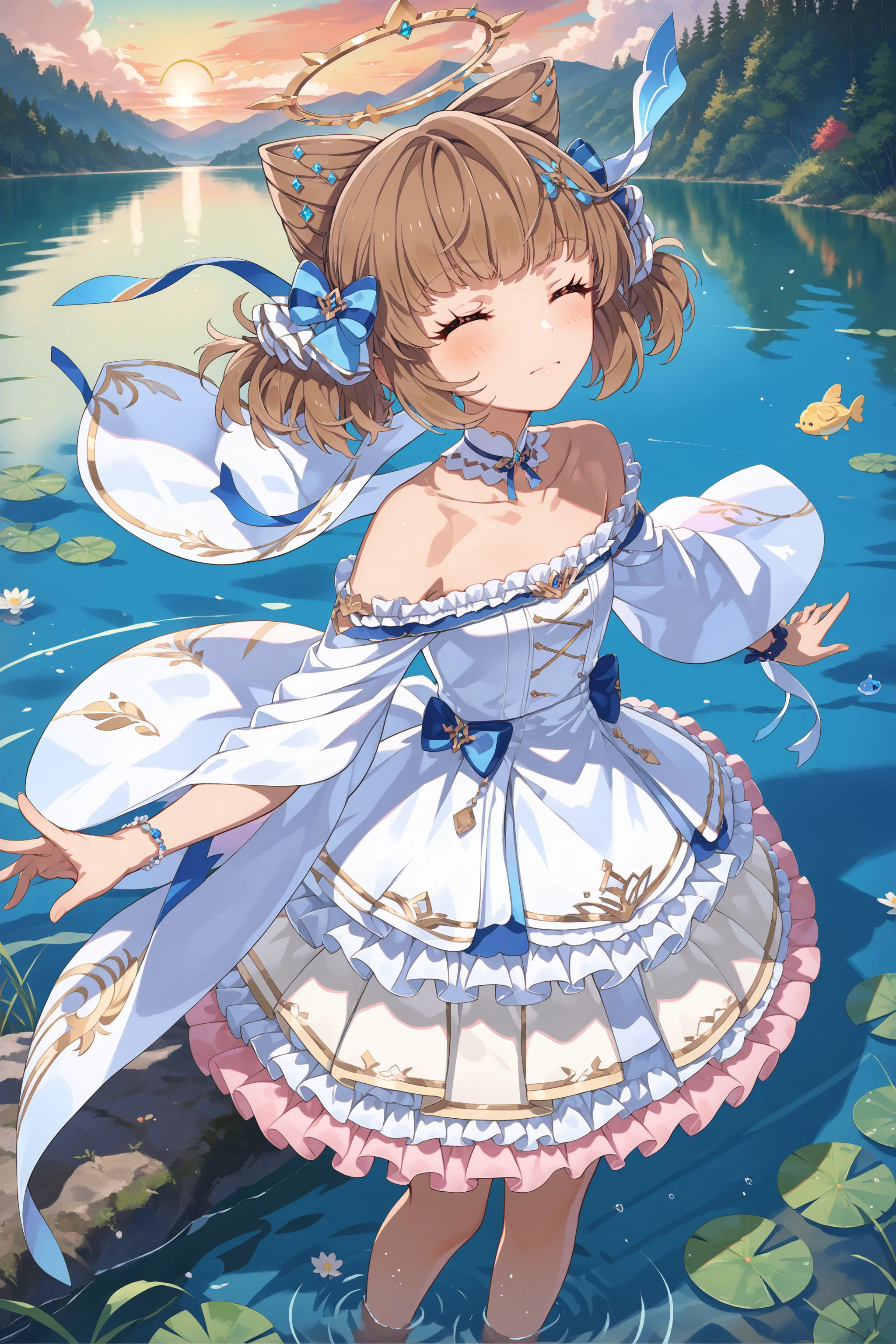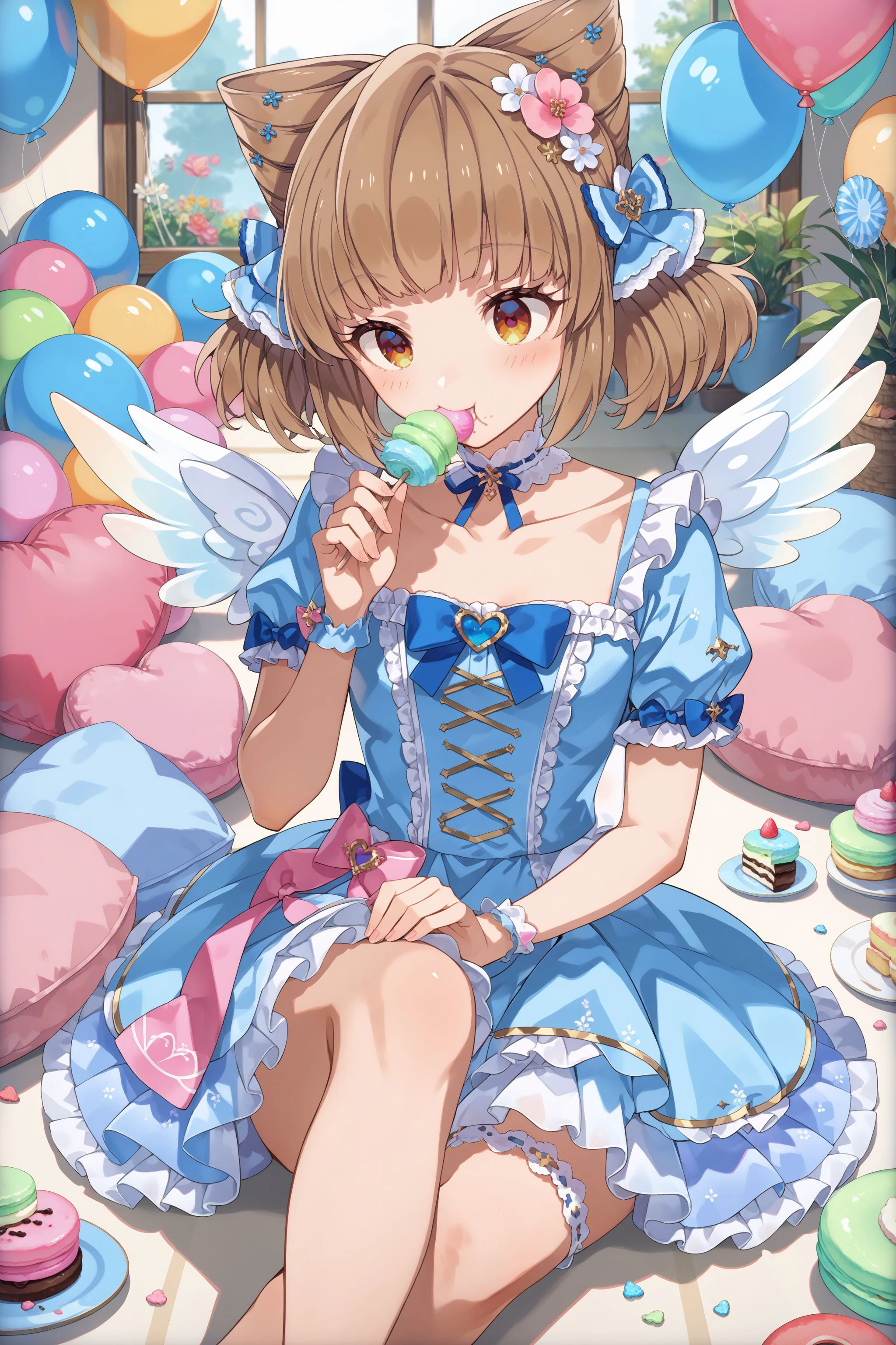 dress-b: hair flower, collarbone, pale blue dress, puffy short sleeves, ribbon, layered skirt, thighlet, mini wings