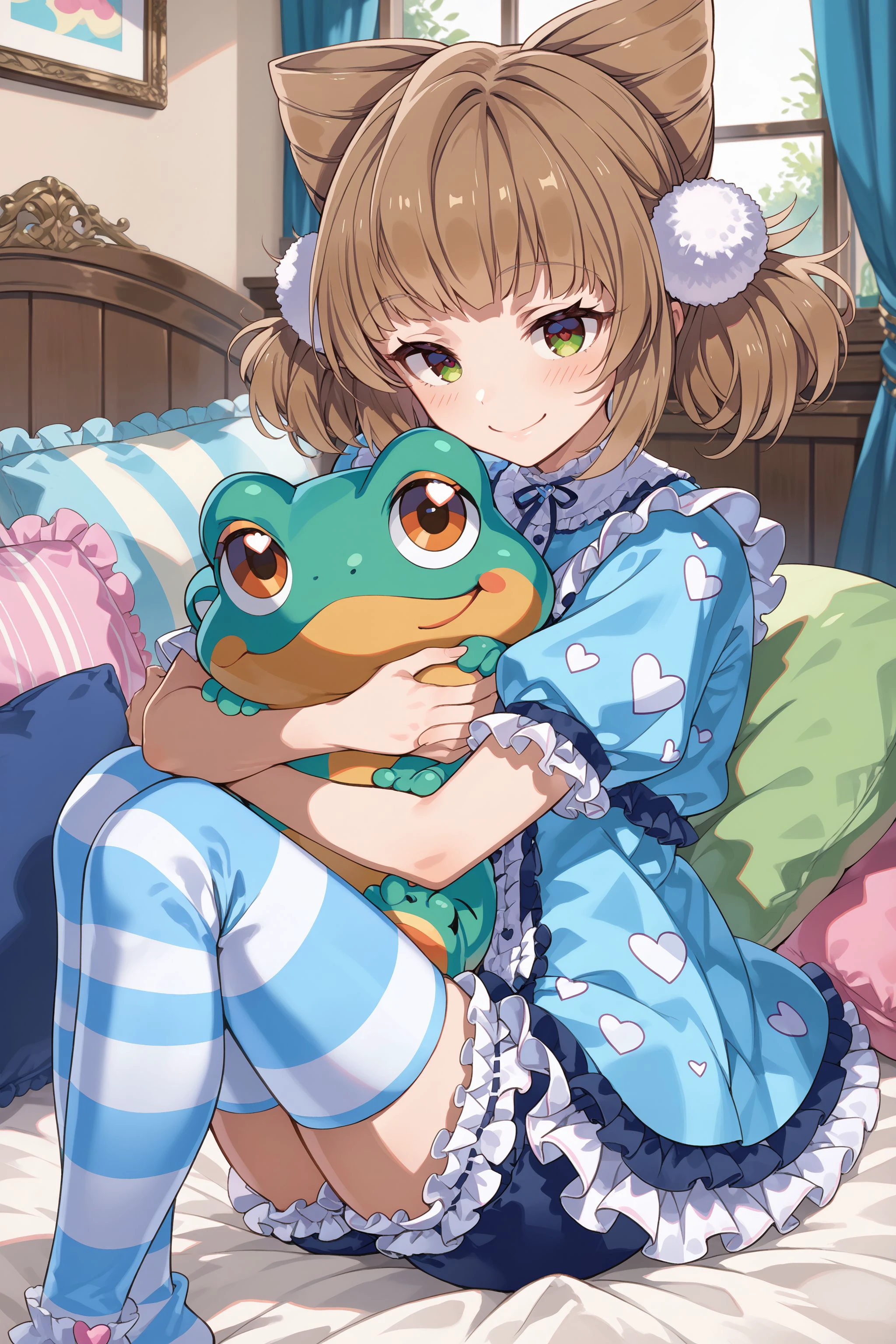 pajamas: pajamas, puffy sleeves, frilled sleeves, short sleeves, frills, striped thighhighs, pom pom \(clothes\), blue shorts, heart print, frilled shorts