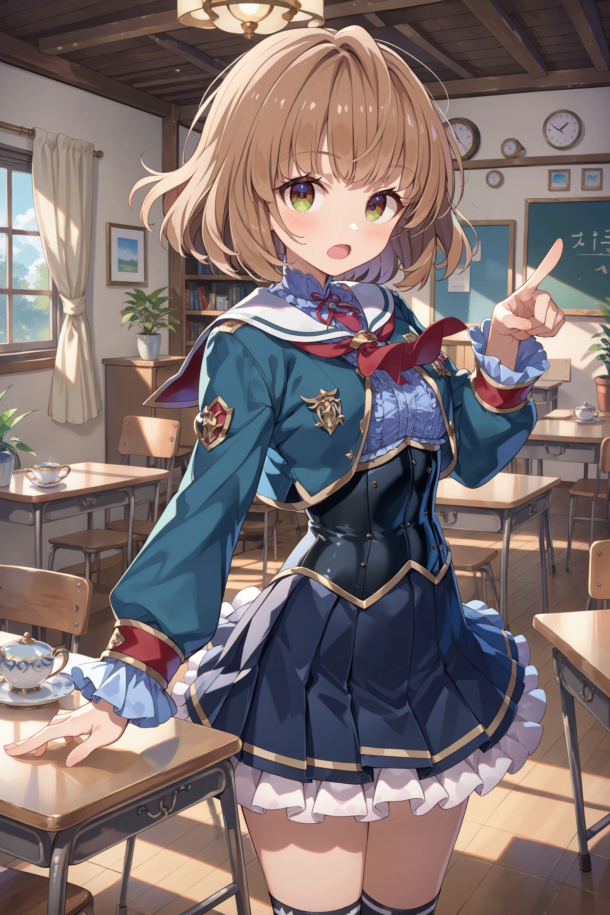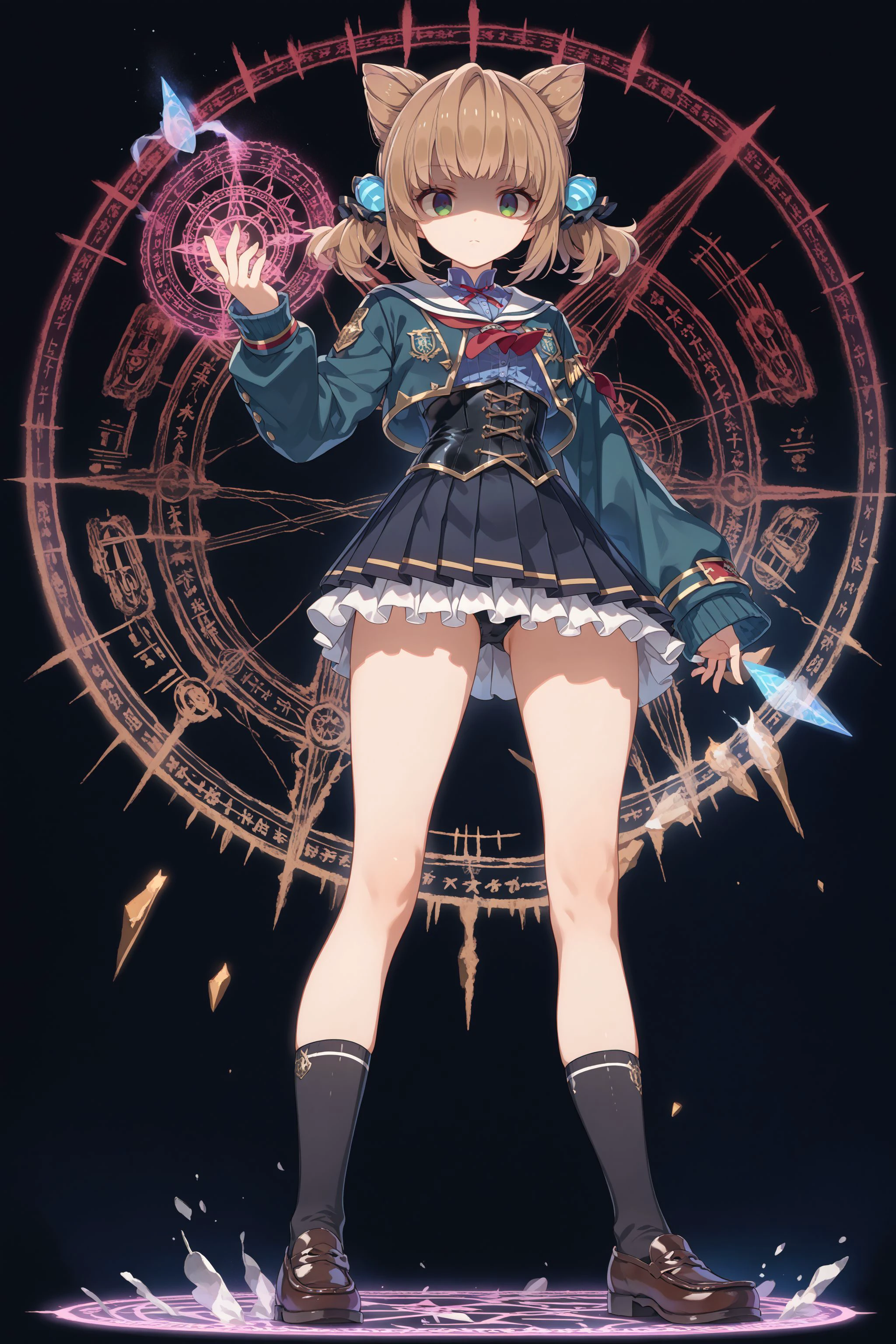 school: school uniform, green jacket, cropped jacket, red neckerchief, sleeves past wrists, blue shirt, black corset, long sleeves, frills, plated skirt, black skirt, black socks, loafers