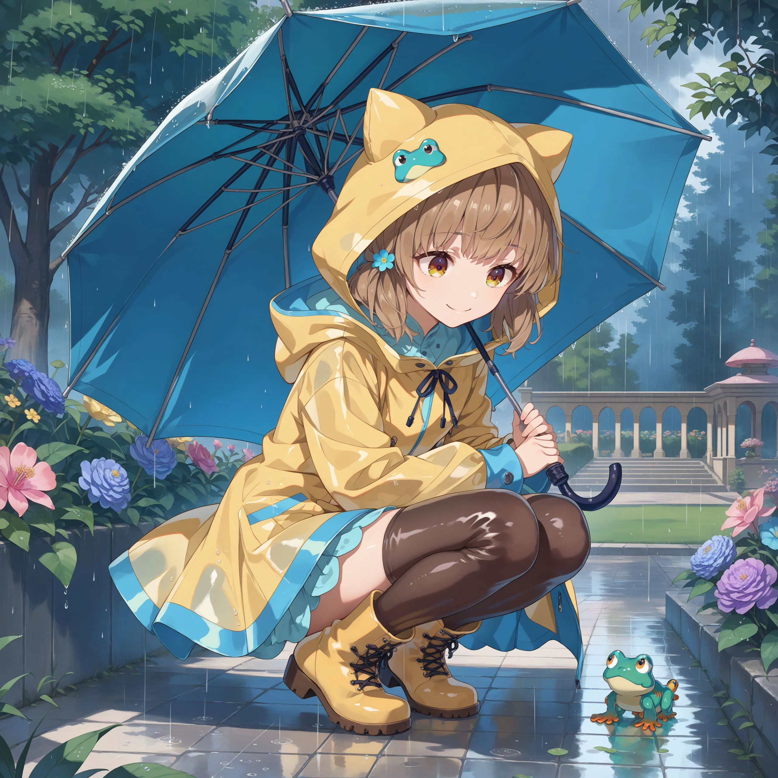 brown hair, blunt bangs, brown eyes, orange eyes, yellow eyes, small breasts,