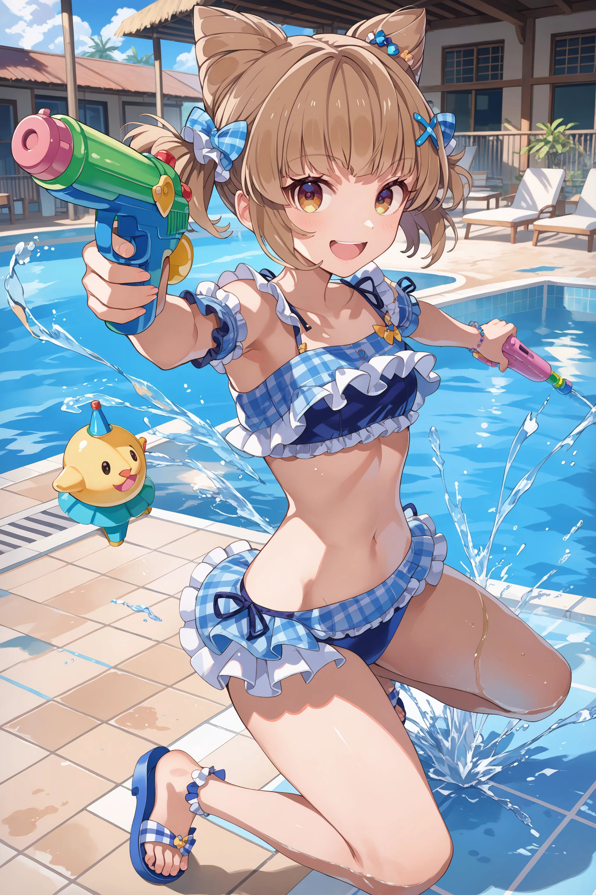bikini: blue bikini, frilled bikini, plaid bikini, short sleeves, detached sleeves, sandals