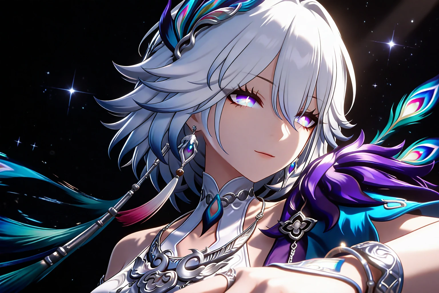 人物全身提示词:1girl, solo,white hair, light blue hair, gradient hair, short hair, bangs, purple eyes, blue eyes, gradient eyes, iridescent eyes, detailed eyes, long eyelashes, jewelry, earrings, necklace, bracelet, armlet, ring, hair ornament, peacock feather hair ornament, peacock print, dress, white dress, blue dress, halter dress, sleeveless dress, backless dress, high slit, purple shoulder armor