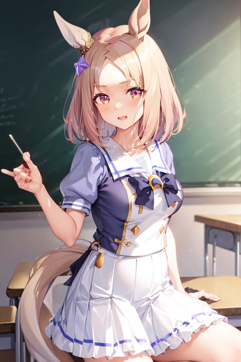 tracen school uniform, summer uniform, serafuku, puffy short sleeves, purple bowtie, horseshoe ornament, sailor collar, sailor shirt, purple shirt, white skirt, pleated skirt, frilled skirt, miniskirt, zettai ryouiki, white thighhighs, brown footwear, loafers