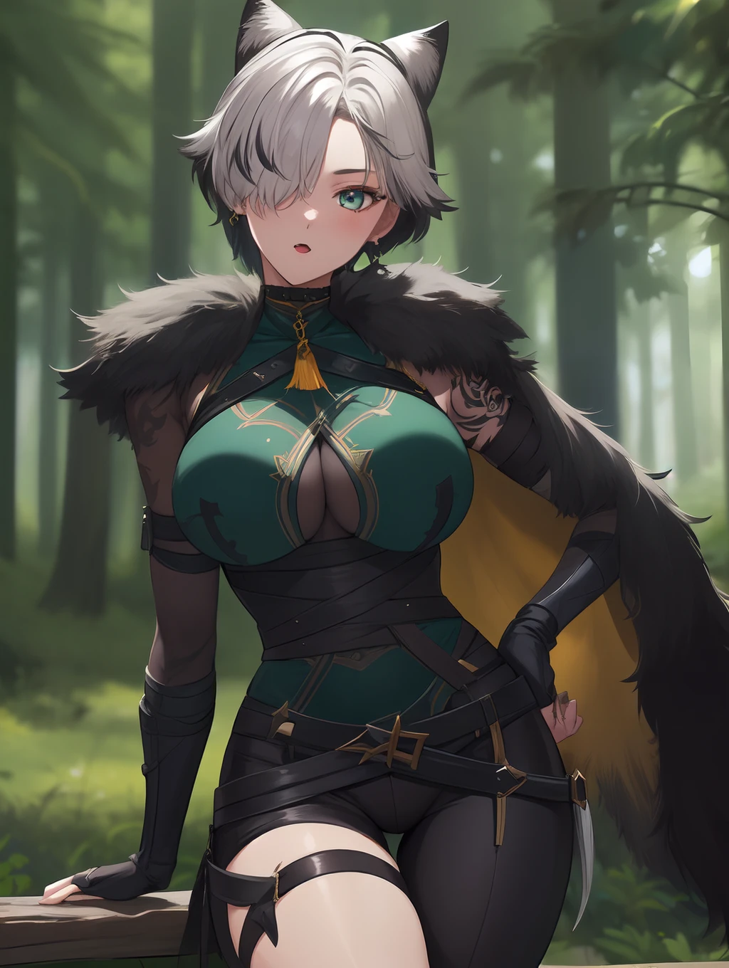Base outfit: green top, fur trim cape, , tattoos, black elbow gloves, bandage corset, black leggings, thigh, asymmetric legwear