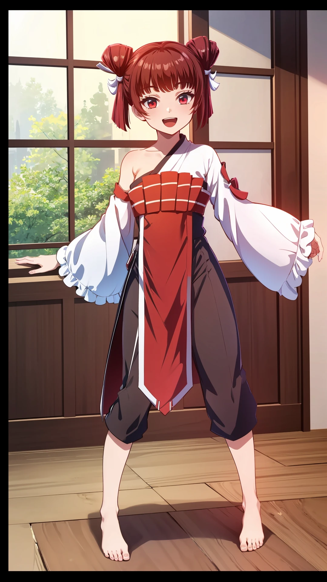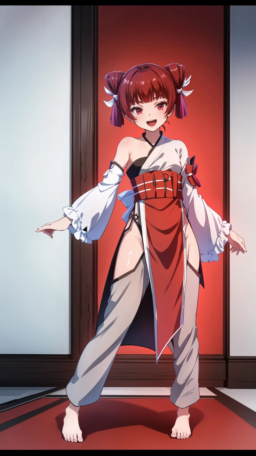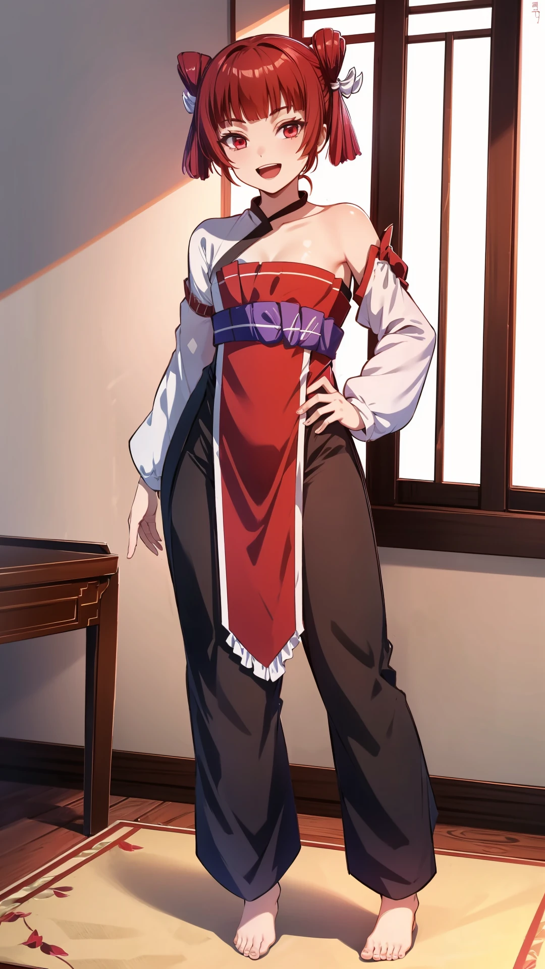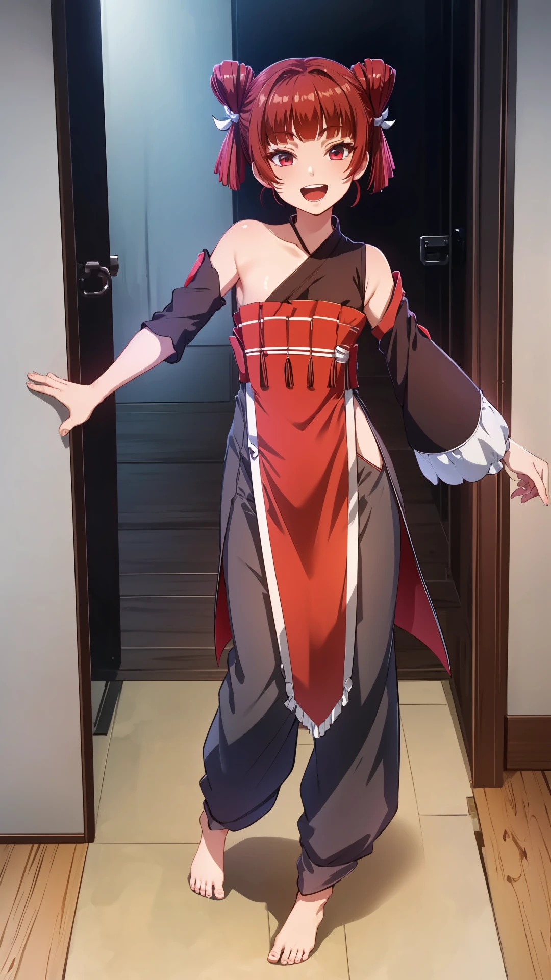 wuxingjian, 1girl, solo,red hair, open mouth, red eyes, smile,chinese clothes, looking at viewer, short hair,,double bun,twintails,bare right shoulders,sash,full body,skirt,pants,barefoot,indoors, <lora:wuxingjian_v2:0.8>稍後同步分享至 https://tensor.art/ 請不要先轉貼