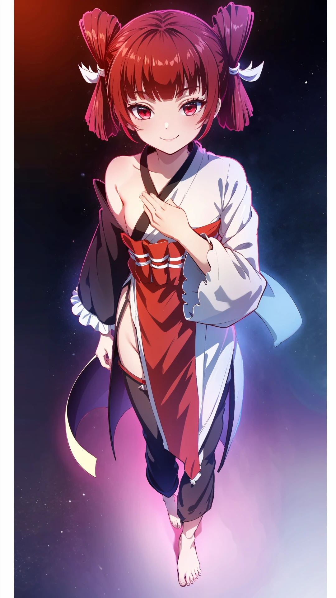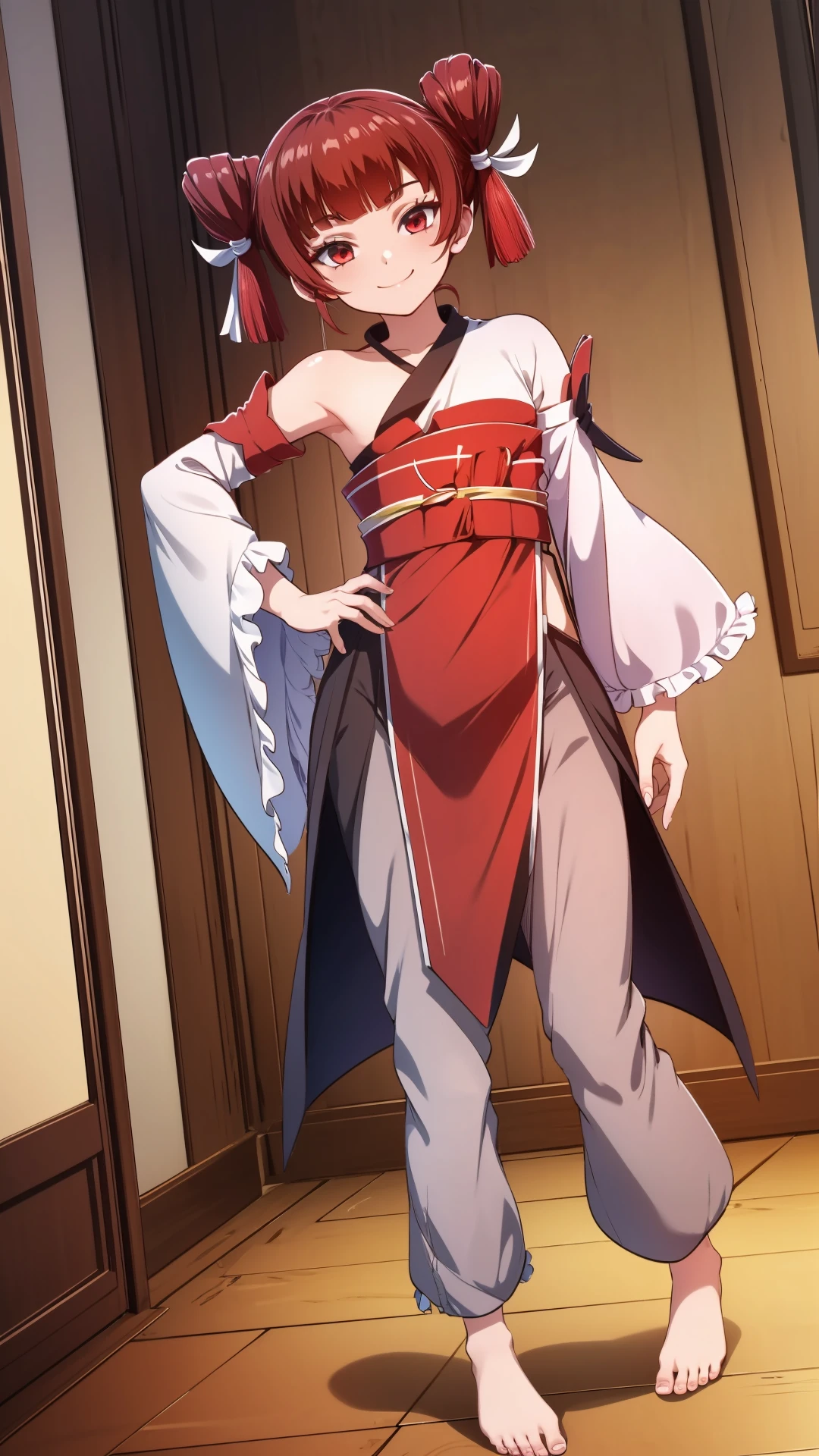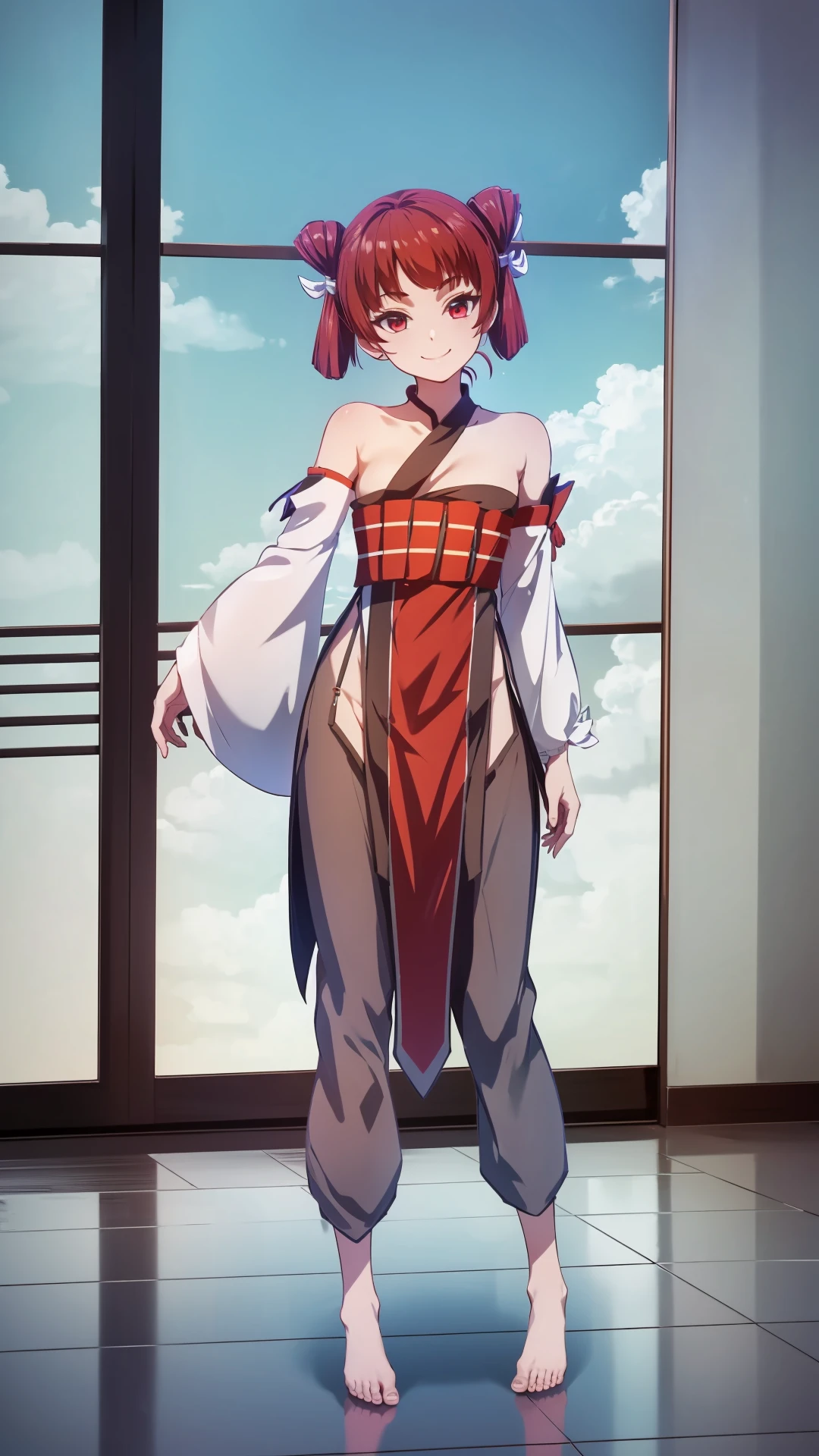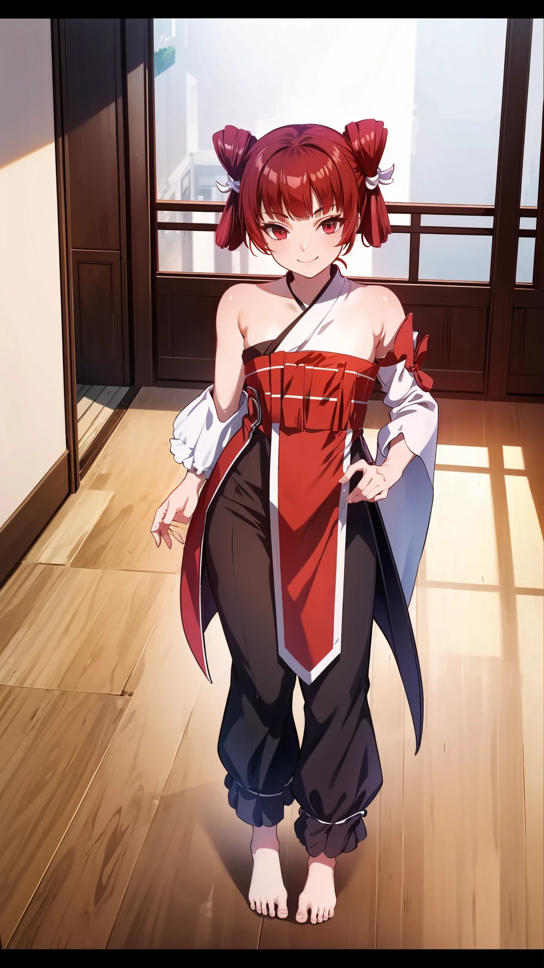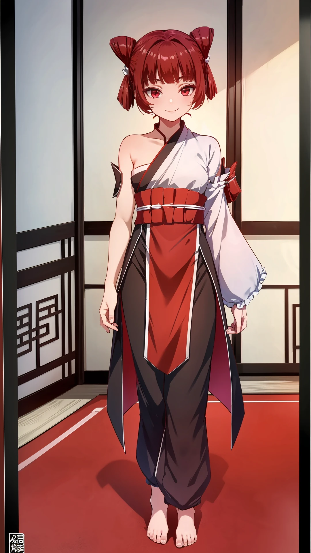 wuxingjian, 1girl, solo,red hair, open mouth, red eyes, smile,chinese clothes, looking at viewer, short hair,,double bun,twintails,bare right shoulders,sash,full body,skirt,pants,barefoot,indoors, <lora:wuxingjian_v2:0.8>稍後同步分享至 https://tensor.art/ 請不要先轉貼
