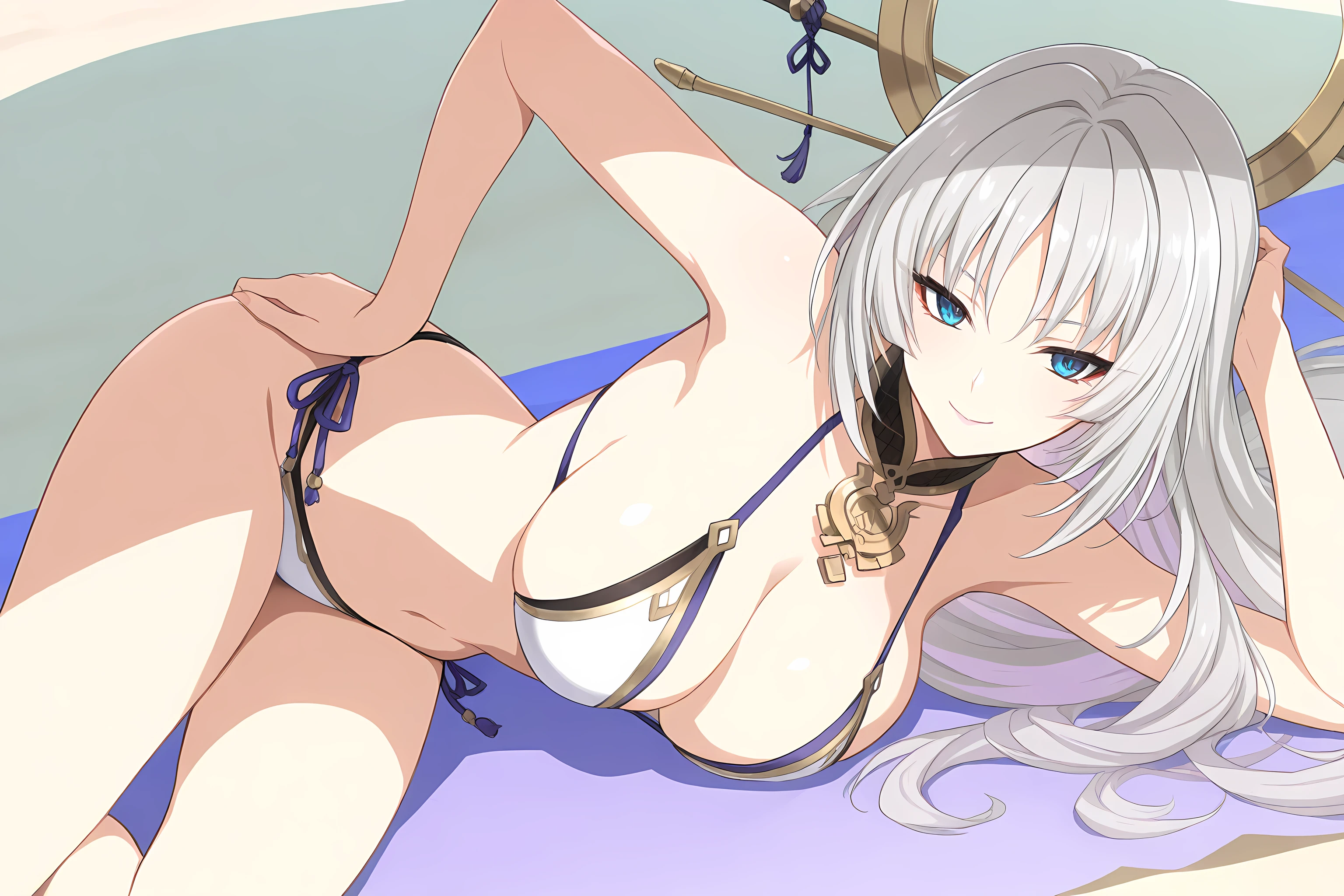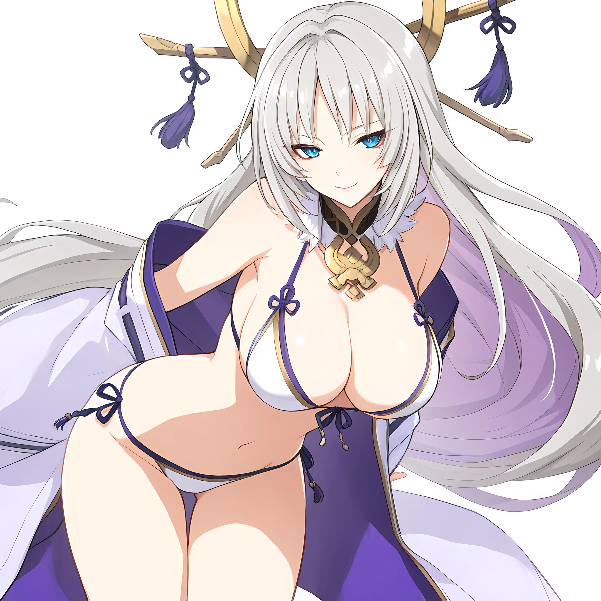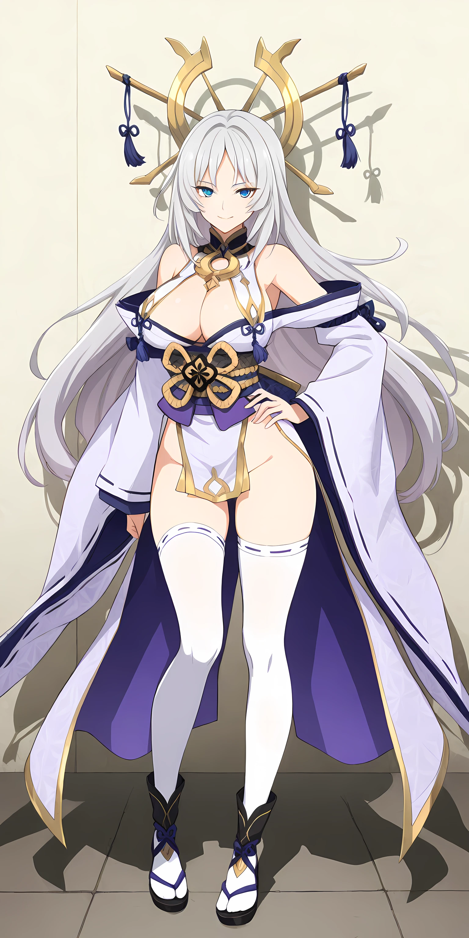Outfit tag is " thighhighs, white thighhighs, cleavage, wide sleeves, detached sleeves, japanese clothes, sash, obi, no panties, long sleeves, armpits, pelvic curtain, kimono, breasts curtain "