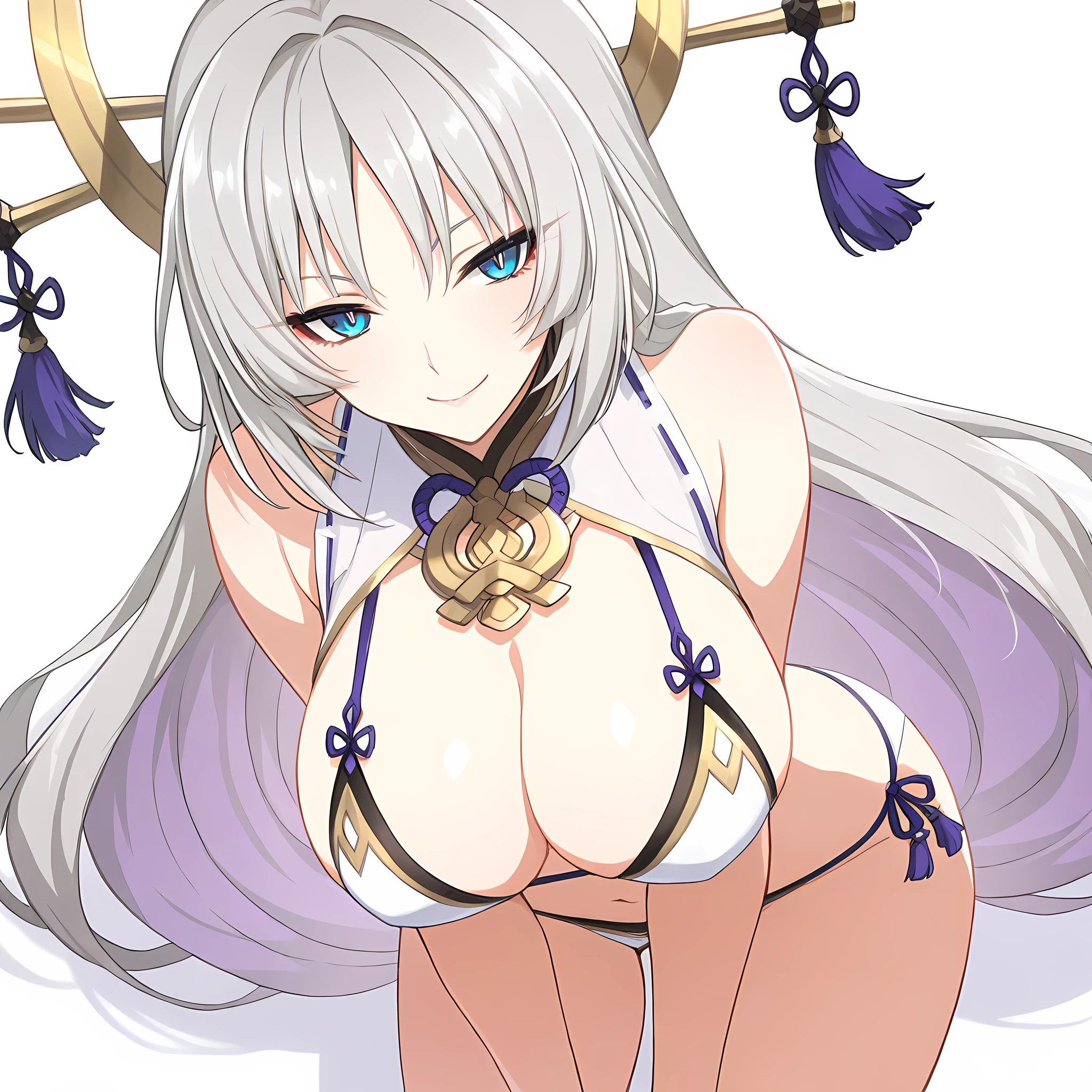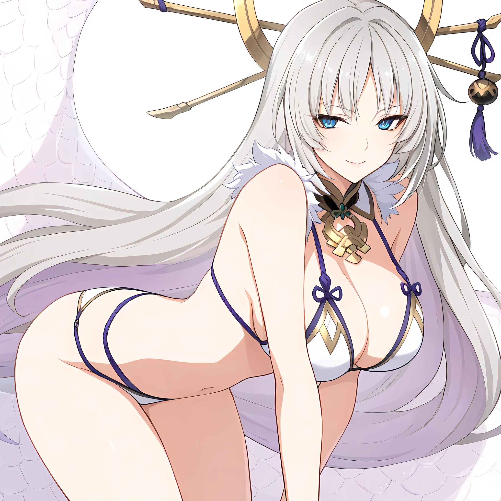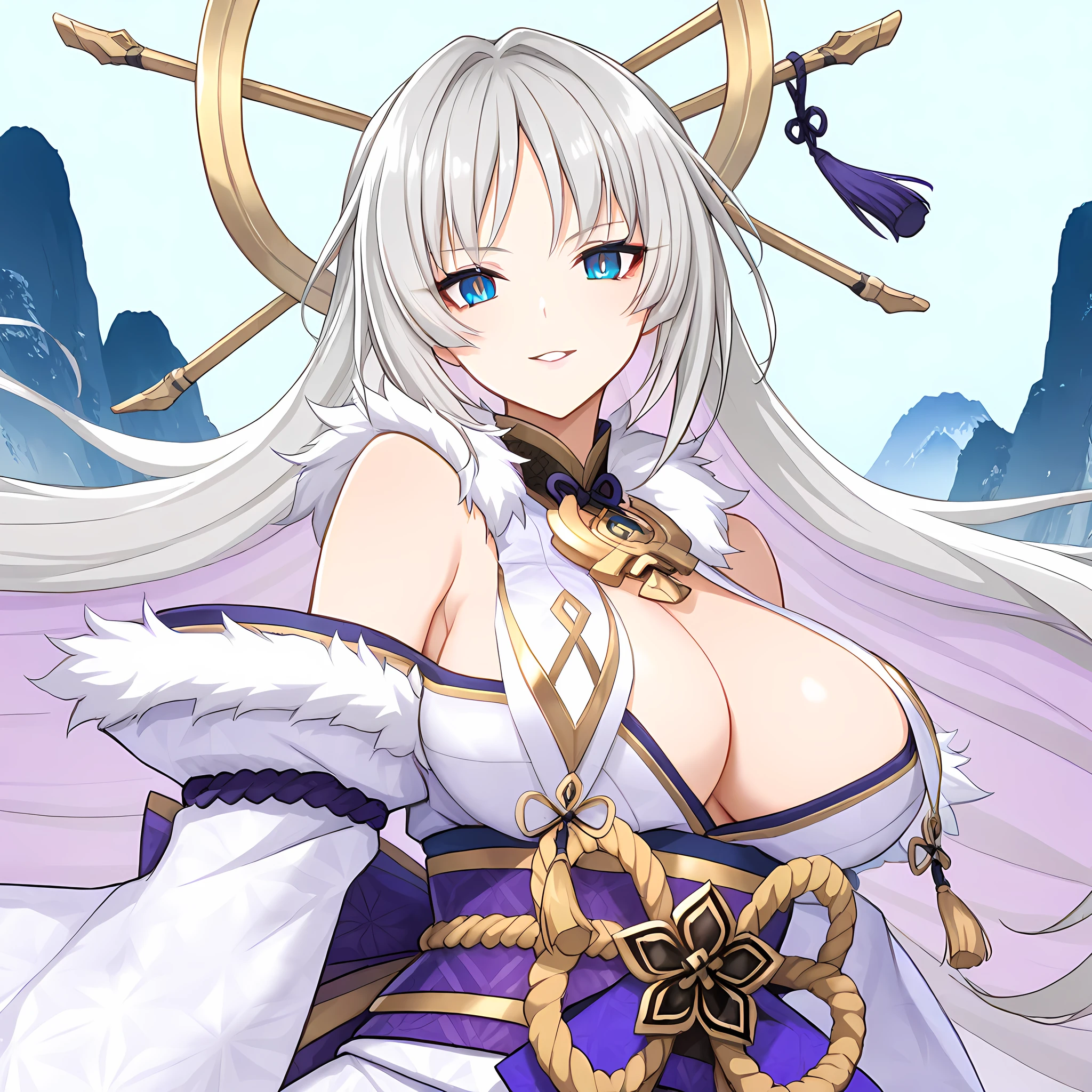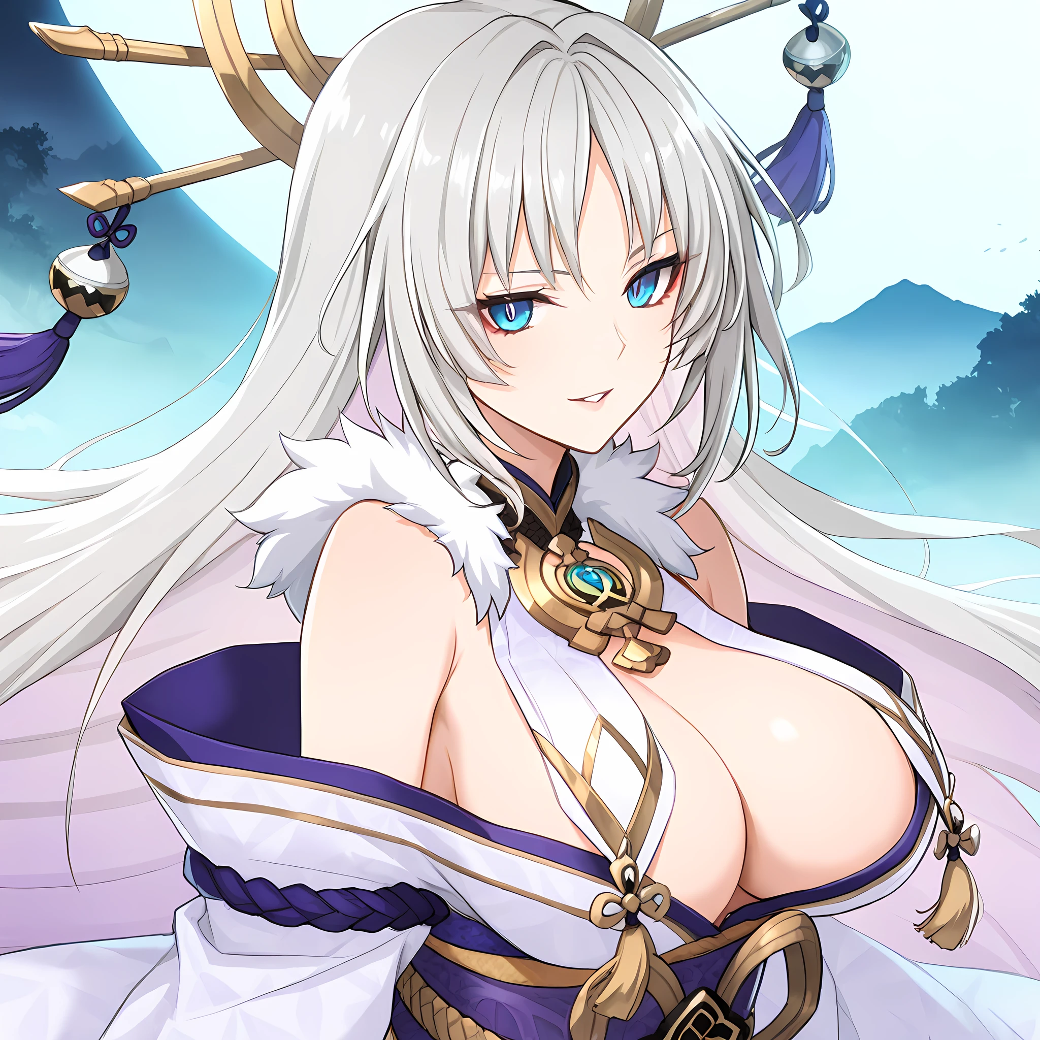 Activation tag of " yamatanoorochi, 1girl, solo, blue eyes, long hair, grey hair, bangs, large breasts, "