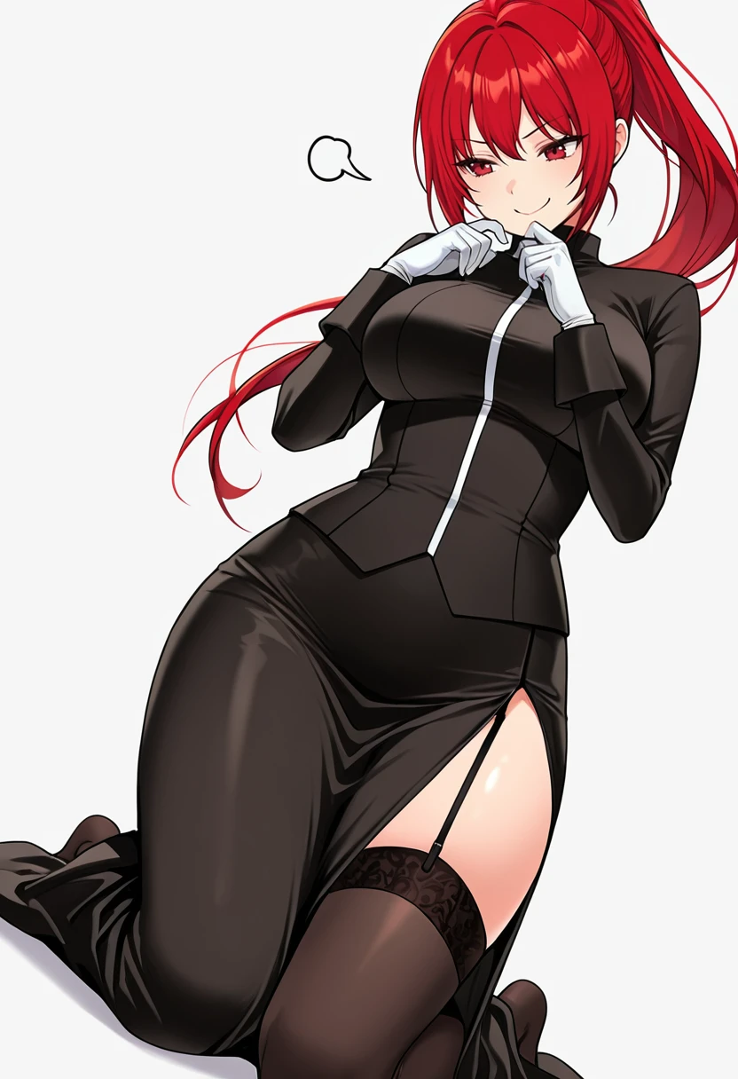 black dress, bodysuit, skirt suit,white gloves, thighhighs, garter straps,long skirt, Explanation and notes below👇