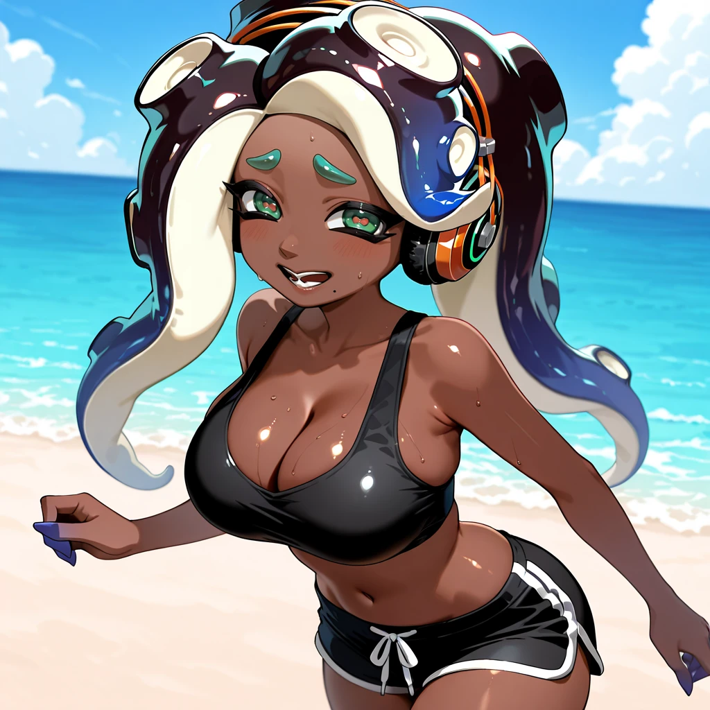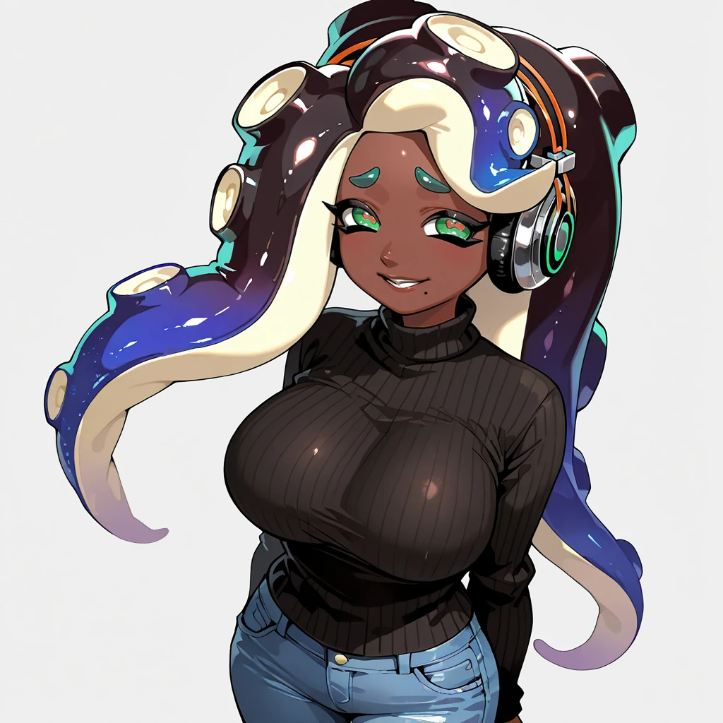 Trigger with hourglass look: MarinaSplatoon3Hourglass, 1girl, very dark skin, mole under mouth, headphones, cleavage, octarian, crop top, navel, midriff, collarbone, green eyes, suit, formal, marina (splatoon), large breasts, orange pants, fingerless black gloves, dark-skinned female, tentacle black multicolored long two-tone gradient hair, cephalopod eyes, orange jacket, suction cups, horizontal pink pupils, colored skin, open clothes, long sleeves