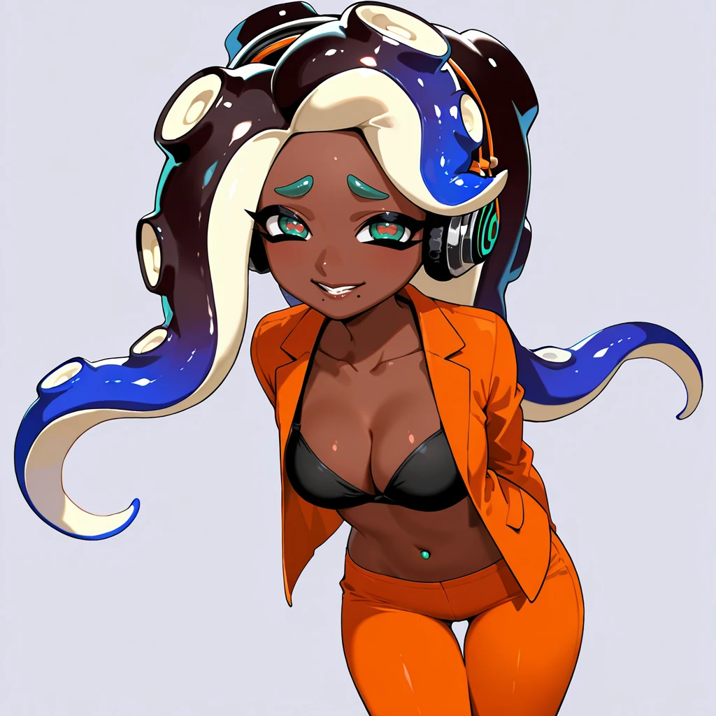 Trigger : MarinaSplatoon3, 1girl, mole under mouth, very dark skin, headphones, navel piercing, octarian, cleavage, underwear, collarbone, open jacket, shirt, bra, aqua eyes, suit, midriff, marina (splatoon), blue tentacle black purple multicolored long gradient hair, dark-skinned female, medium breasts, cephalopod eyes, suction cups, orange pants, thigh gap, open clothes, pink pupils, orange jacket, colored skin
