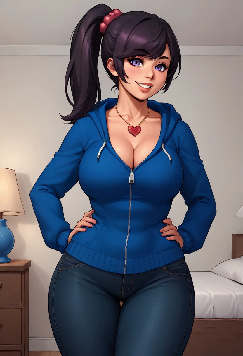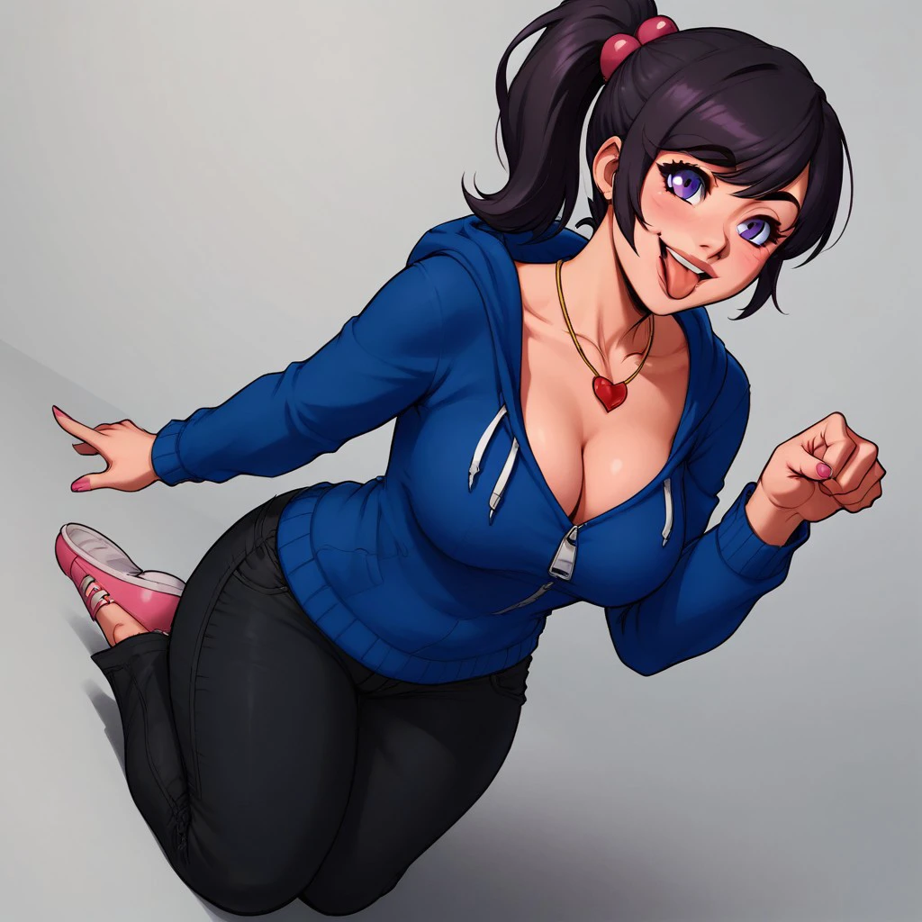 cleavage, pink footwear, blue sweater, blue hoodie, heart pendant, long black jeans