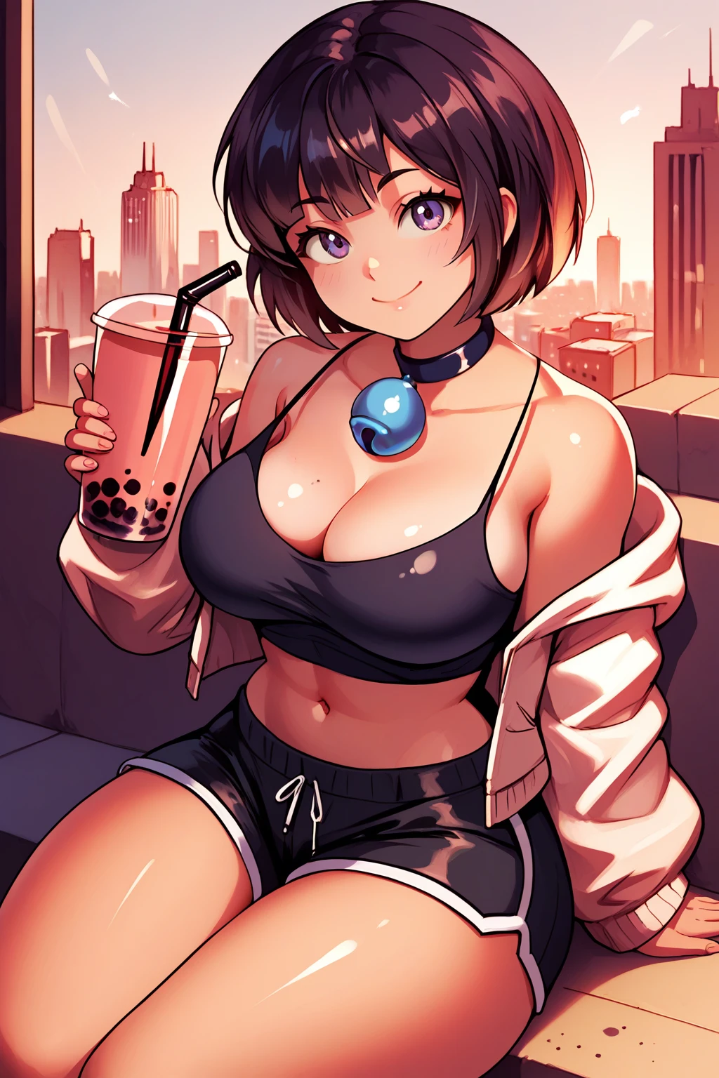 Trigger Casual : 1girl, short hair, bangs, choker with bell, open jacket, camisole, off shoulder, midriff, dolphin shorts, flip-flops