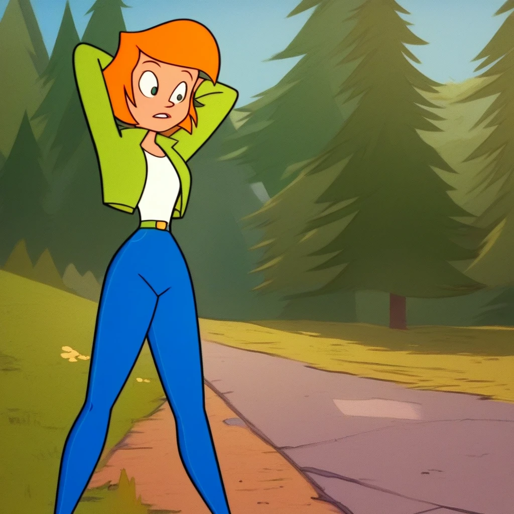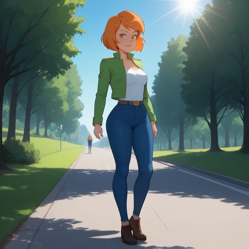 heather, orange hair, jacket, jeans