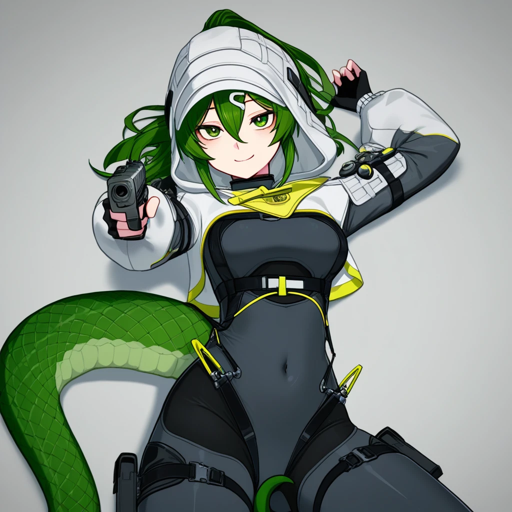 Apperance: 1girl, snake girl, medium breasts, green eyes, green hair, hair between eyes, double-parted bangs, hairclip, long hair, high ponytail, snake tail, green tail