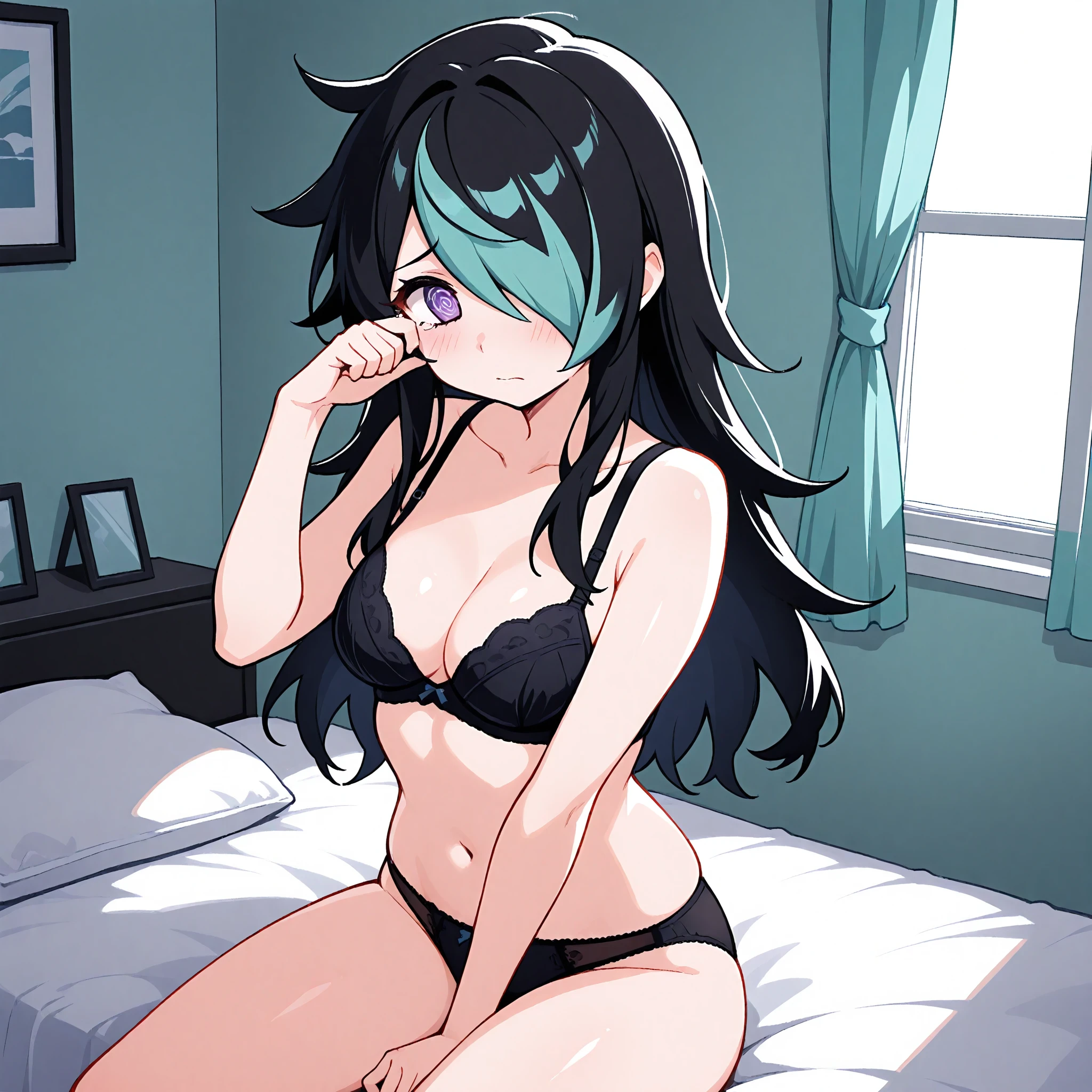 Ellie, long hair, black hair, teal highlight, one eye covered, purple eyes, spiral eyes, choker,