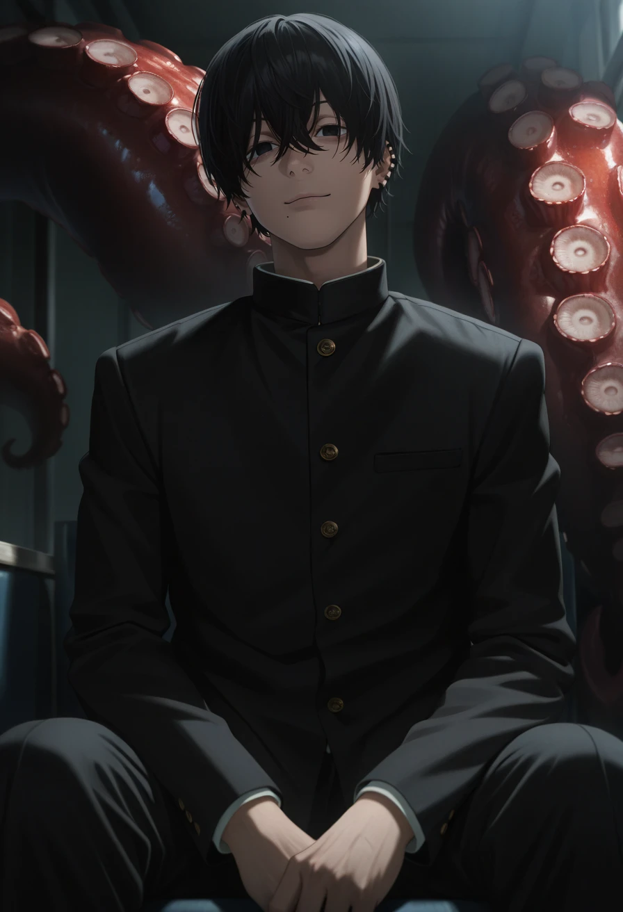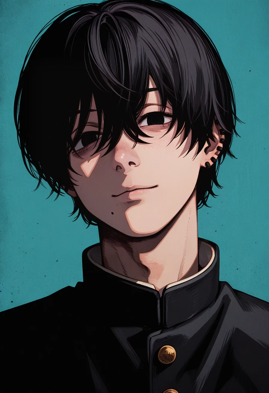1boy, yoshida hirofumi, black hair, hair between eyes, black eyes, mole under mouth, gakuran, chainsaw man,