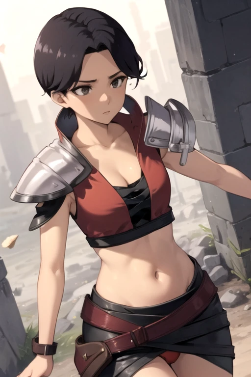 DoronaDemonQWif3, 1girl, solo, short hair, skirt, black hair, cleavage, brown eyes, medium breasts, red panties, midriff, belt, armor, black eyes, dark-skinned female, shoulder armor, pauldrons, shoulder pads