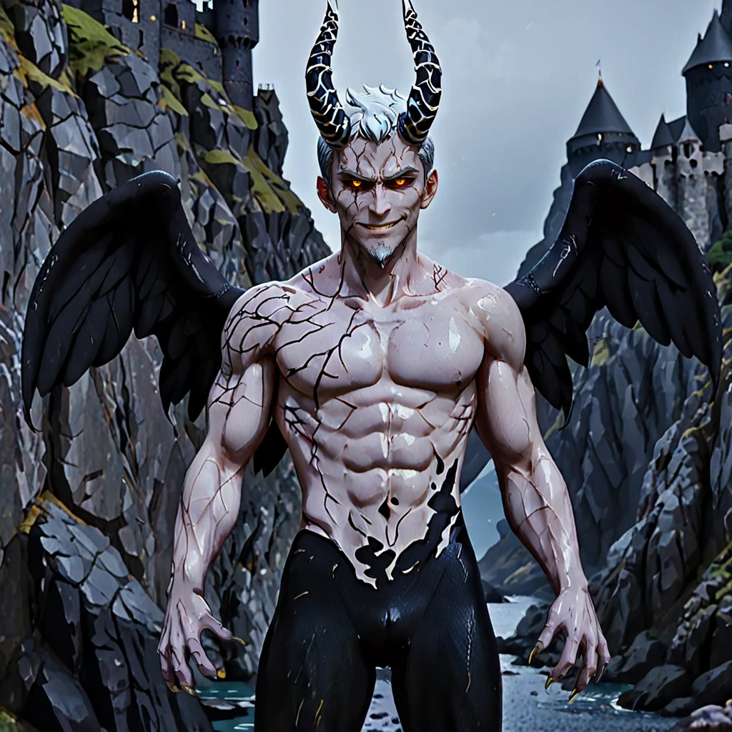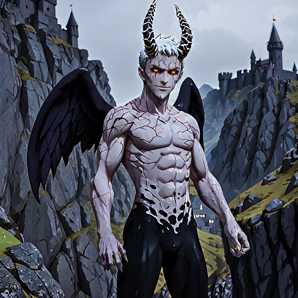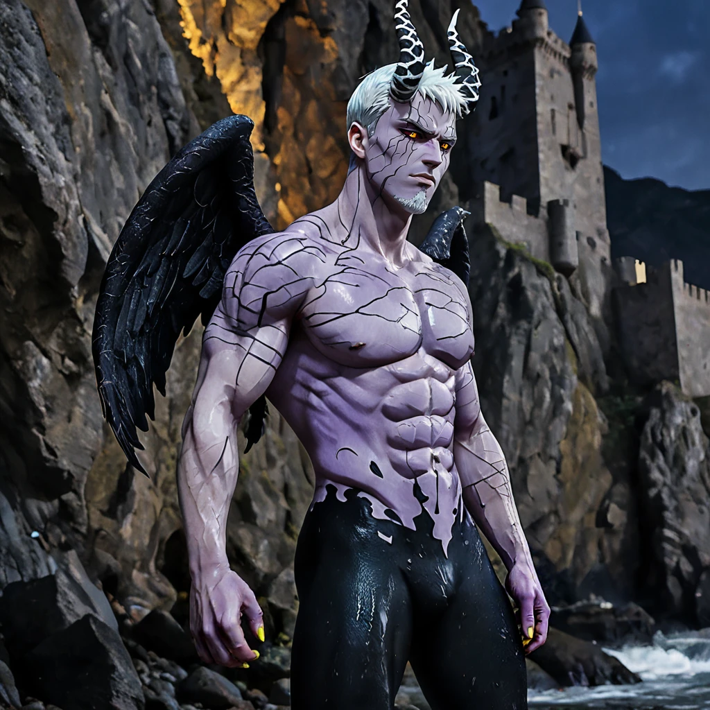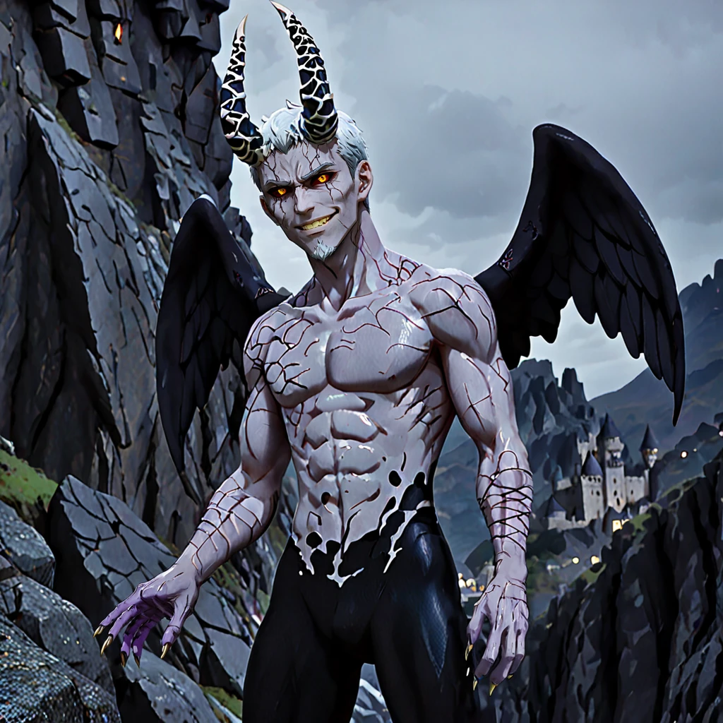 hendrickson_demonform, male, fantasy character, red eyes, red sclera, yellow pupils, black wings, black cracked skin, (purple skin:1.4), (white and black patterned horns), (extreme short white hair:1.3), small white goatee, (black legs:1.5), yellow toenails and fingernails