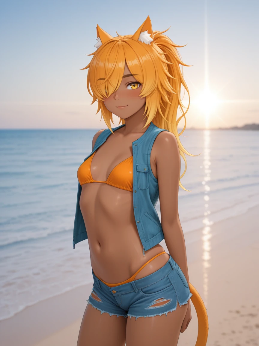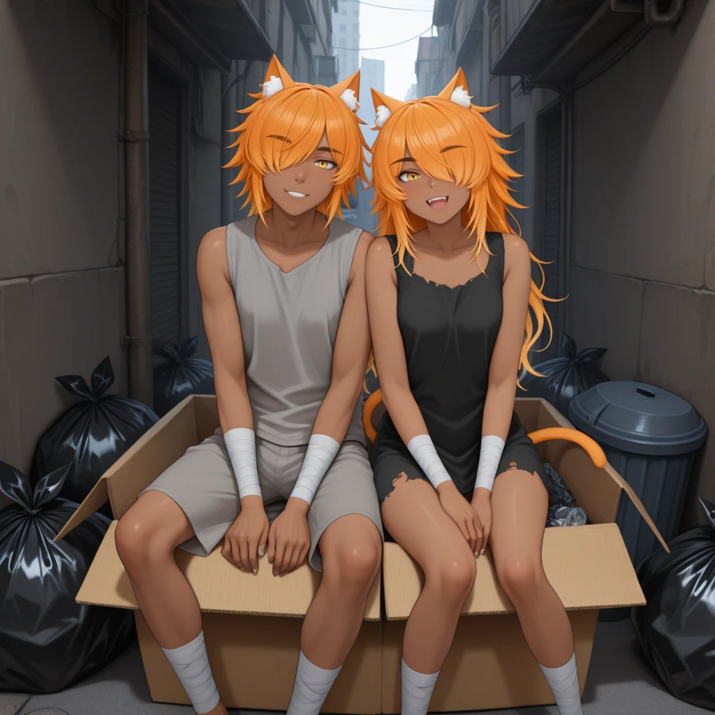 KiTwin, 1boy, medium hair, Orange Hair, gradient hair, yellow hair, yellow eyes, animal ears, cat ears, cat tail, dark-skinned male, thick eyebrows, hair over one eye, messy hair, ,bandaged arm,grey shirt, sleeveless, grey shorts, torn clothes, bandaged legs, collarbone,Use Adetailer for better face results.