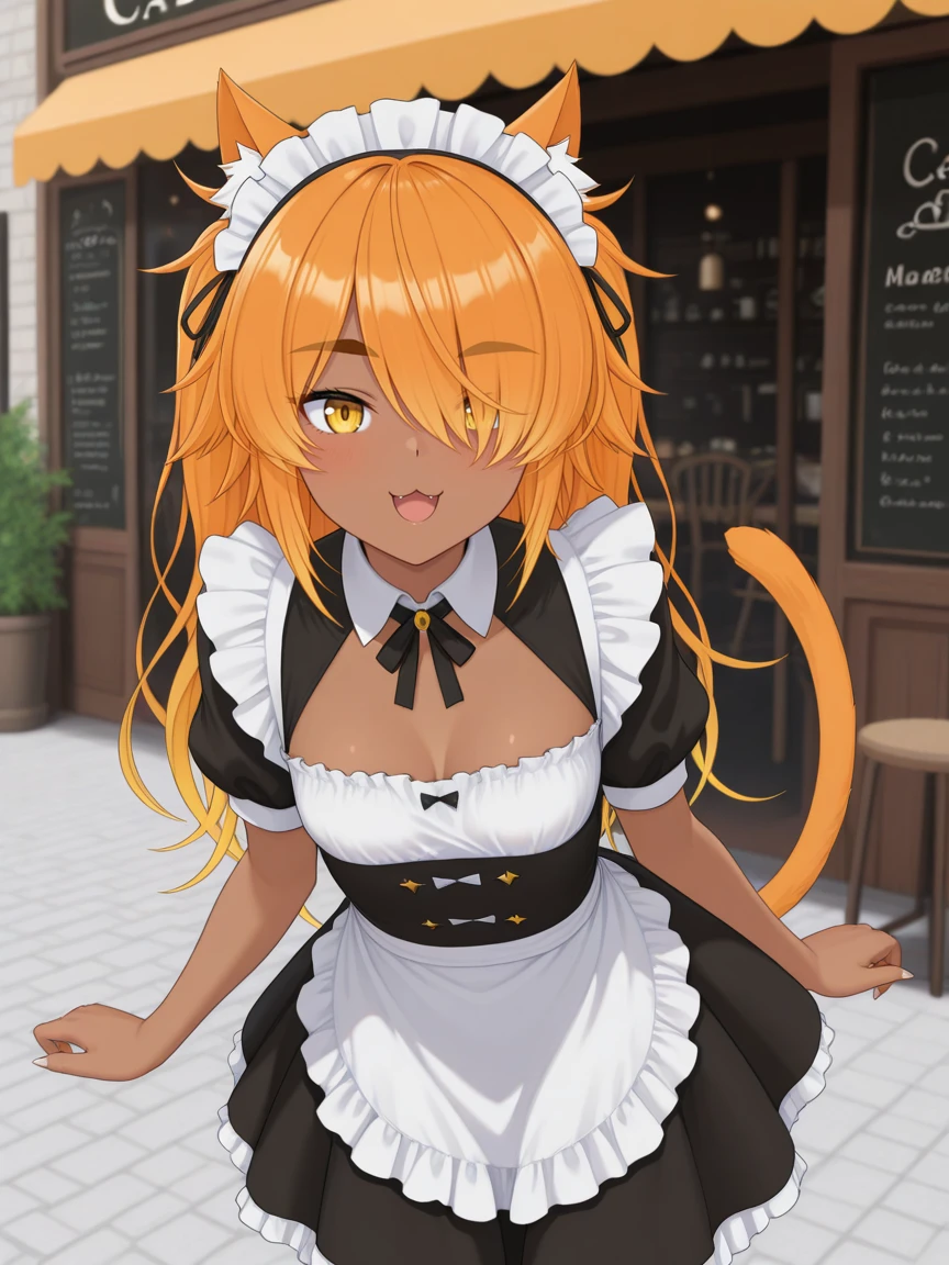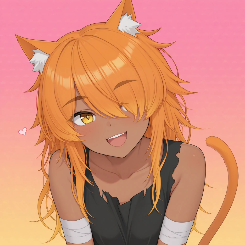 MiTwin, Orange Hair, gradient hair, yellow hair, yellow eyes, animal ears, cat ears, cat tail, cat girl, dark-skinned female, thick eyebrows, hair over one eye, messy hair, long hair,bandaged arm,black dress, sleeveless, torn clothes, bandaged legs, collarbone,To prompt for Ki