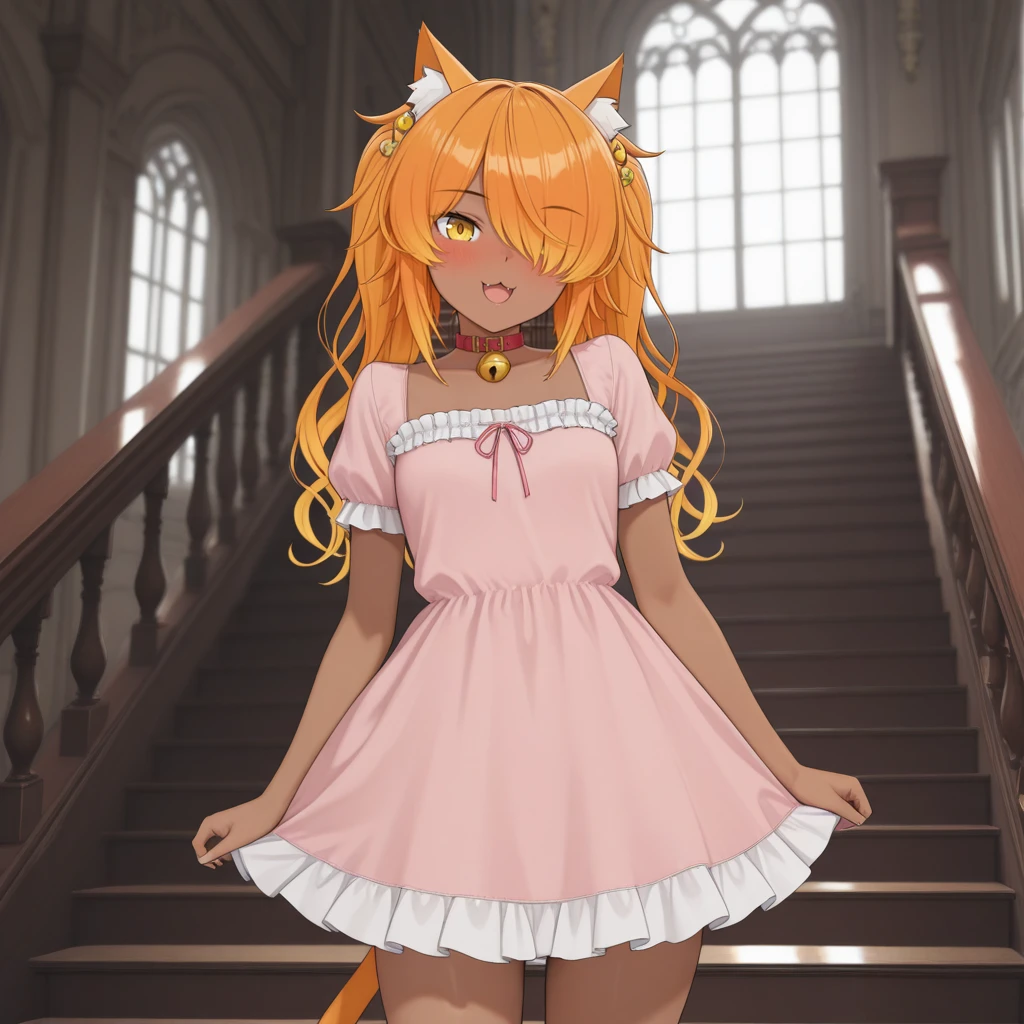 MiTwin, Orange Hair, gradient hair, yellow hair, yellow eyes, animal ears, cat ears, cat tail, cat girl, dark-skinned female, thick eyebrows, hair over one eye, messy hair, long hair,bandaged arm, black dress, sleeveless, torn clothes, bandaged legs, collarbone,