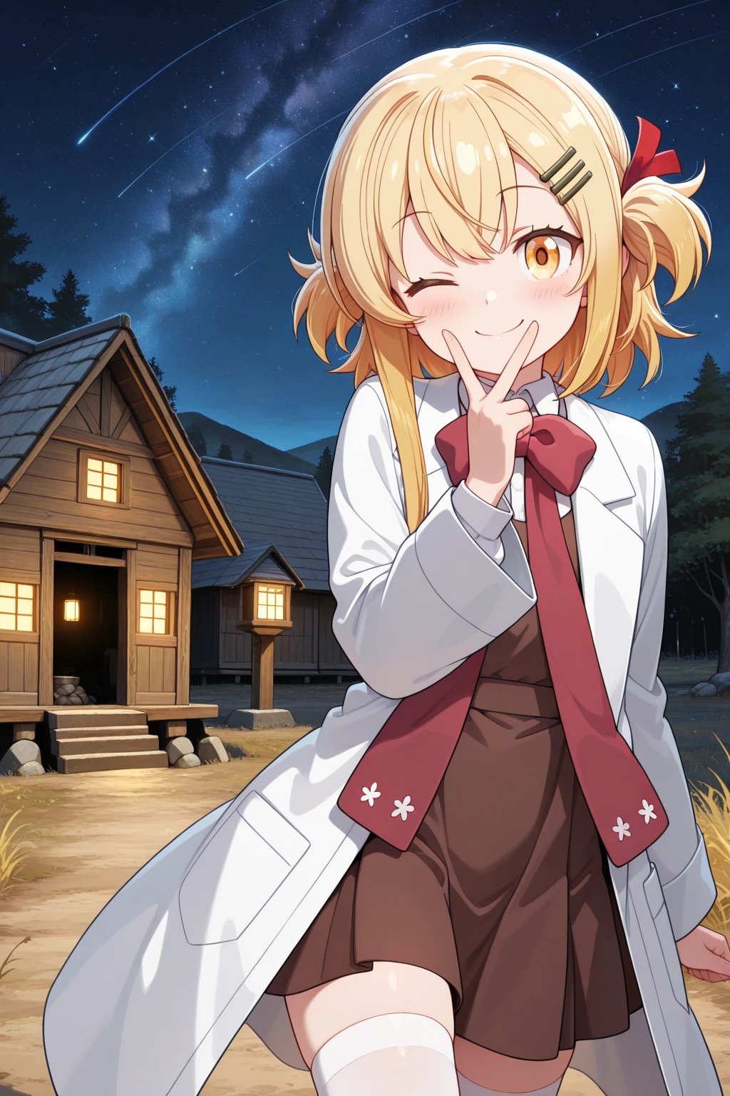 トリガーワード:Null_Default_Costume, blonde hair, short hair, two side up, red hair ribbon, green hairclip, bangs, yellow eyes, white shirt, collared shirt, red bowtie, brown vest, white labcoat, long sleeves, brown skirt, pleated skirt, white thighhighs, zettai ryouiki