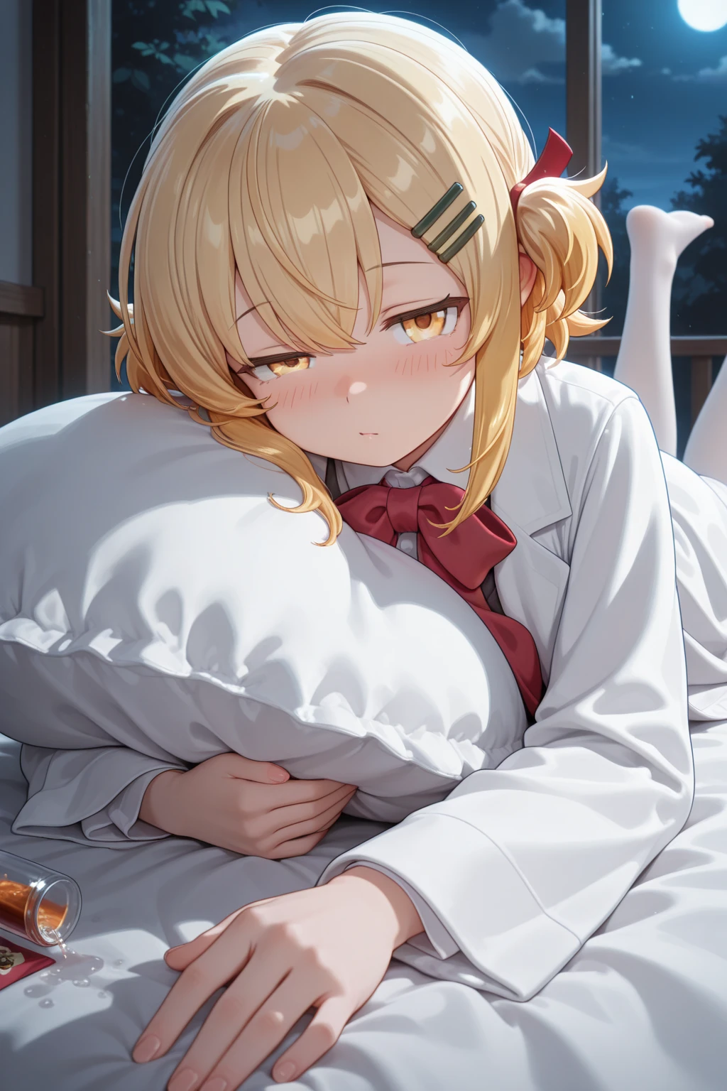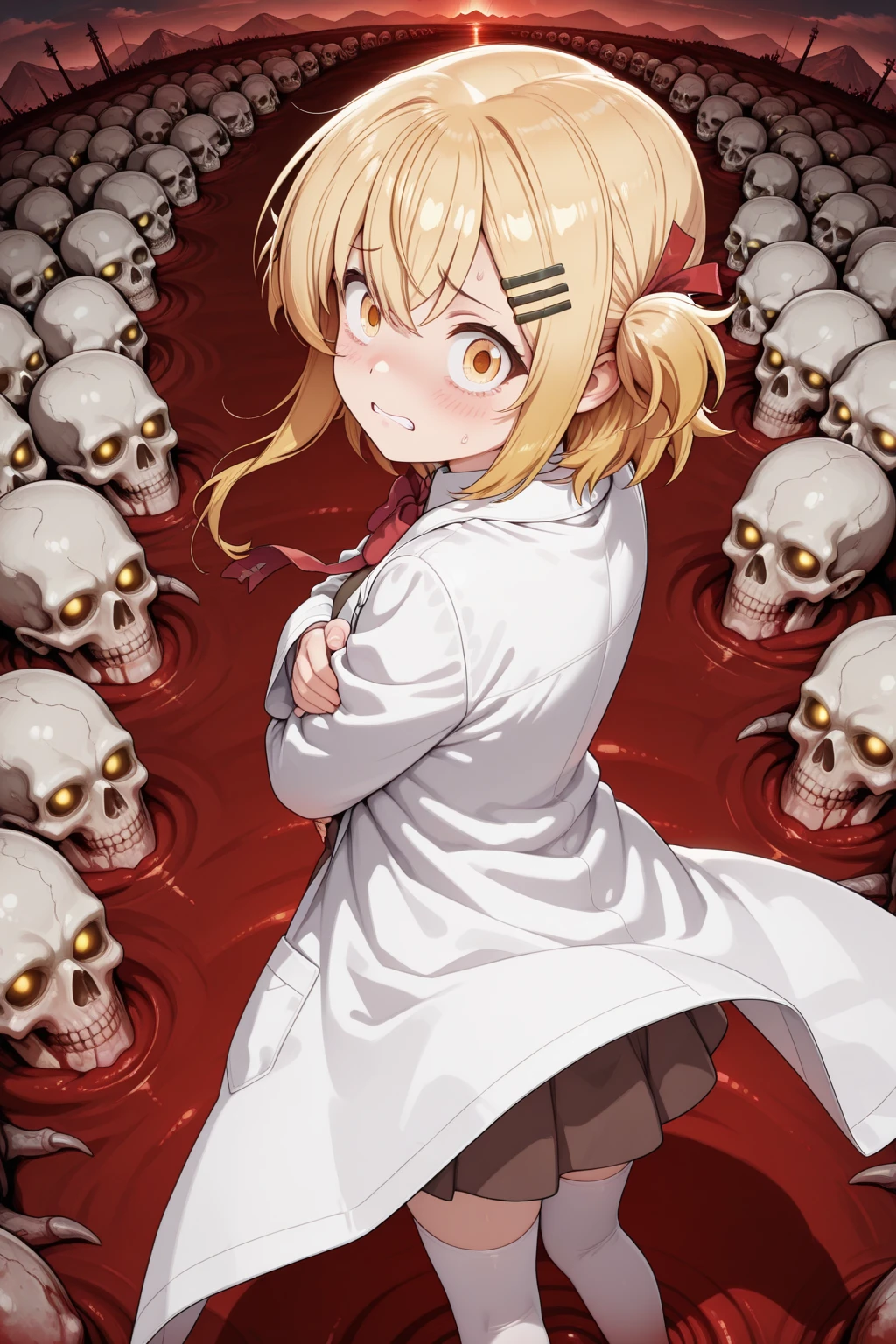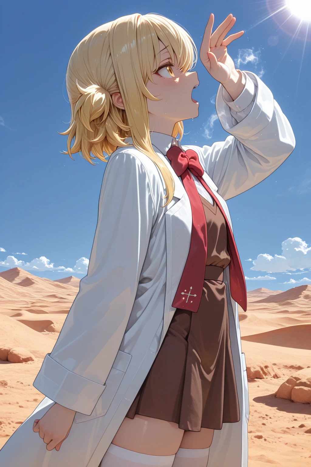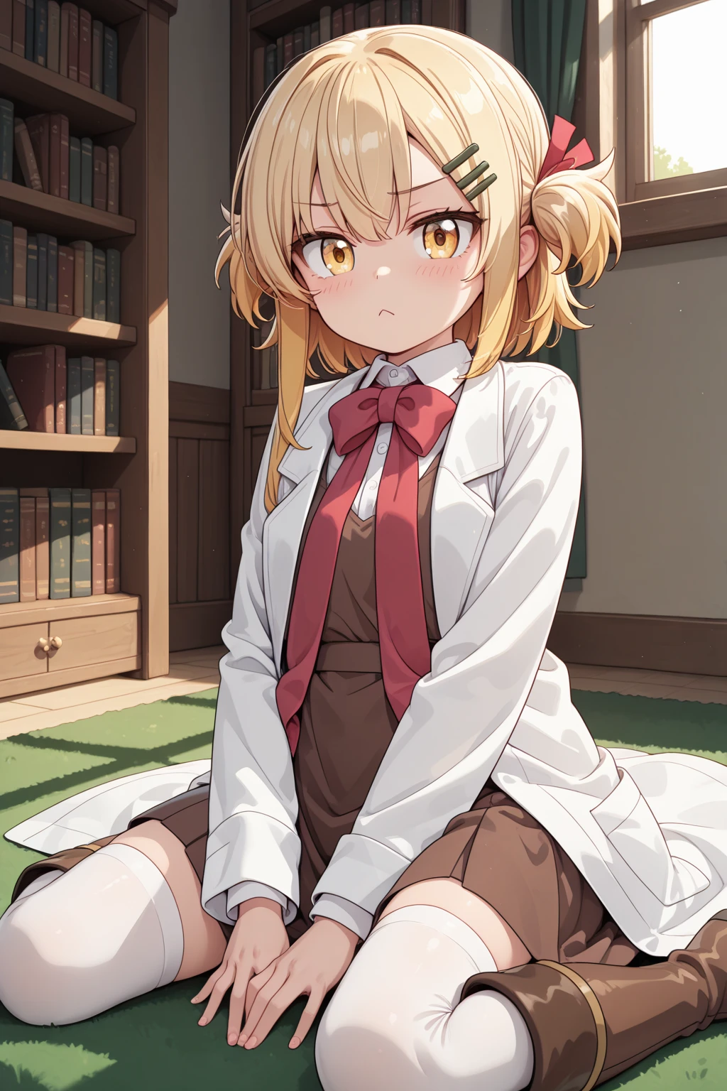 Null_Default_Costume, blonde hair, short hair, two side up, red hair ribbon, green hairclip, bangs, yellow eyes, white shirt, collared shirt, red bowtie, brown vest, white labcoat, long sleeves, brown skirt, pleated skirt, white thighhighs, zettai ryouiki