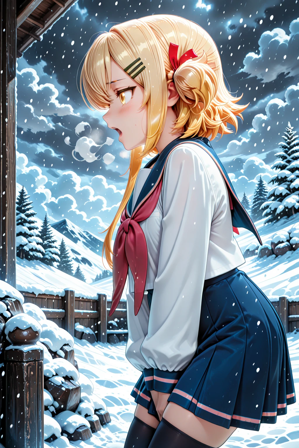 トリガーワード:Null_School_Uniform, blonde hair, short hair, two side up, red hair ribbon, green hairclip, bangs, yellow eyes, school uniform, serafuku, white blouse, sailor collar, red neckerchief, long sleeves, blue skirt, pleated skirt, black thighhighs, zettai ryouiki