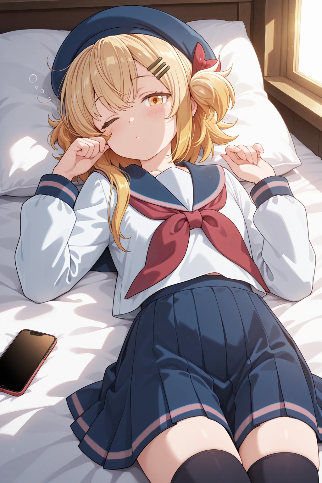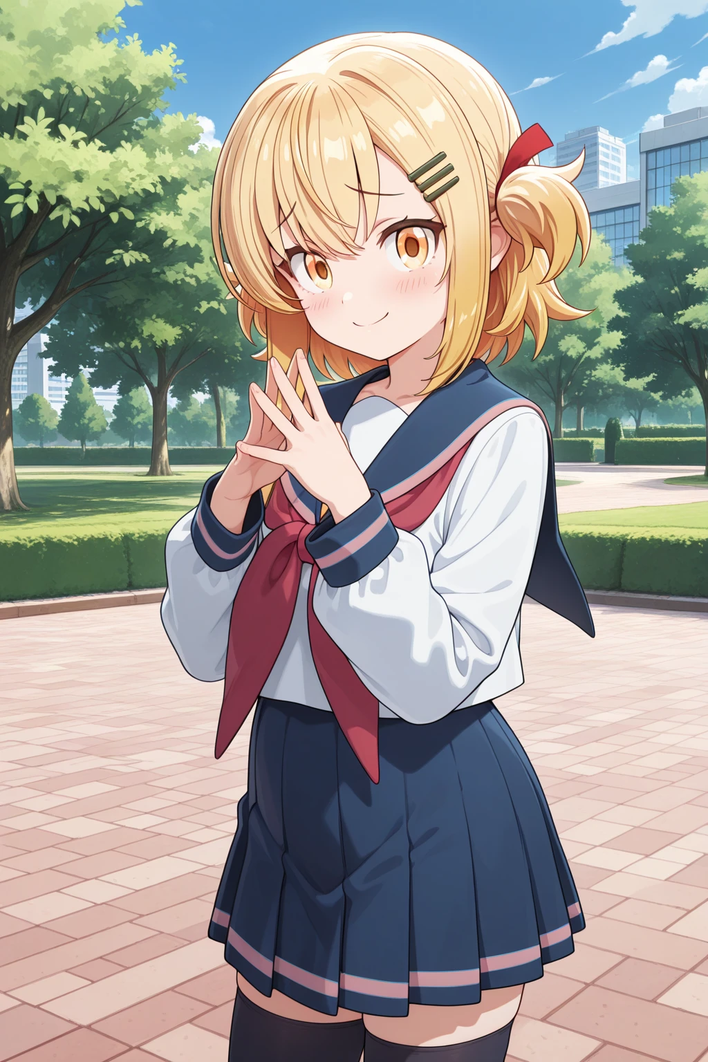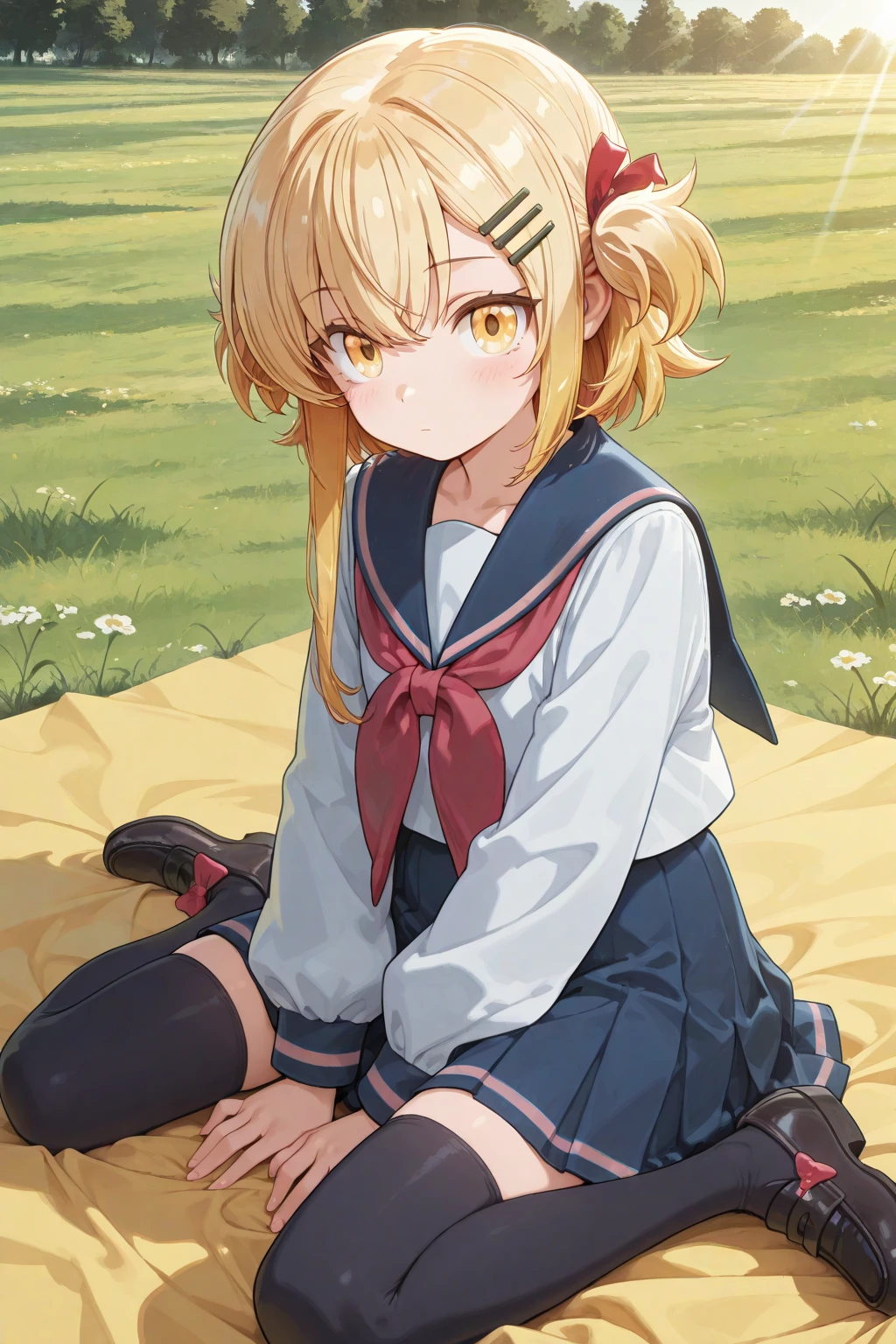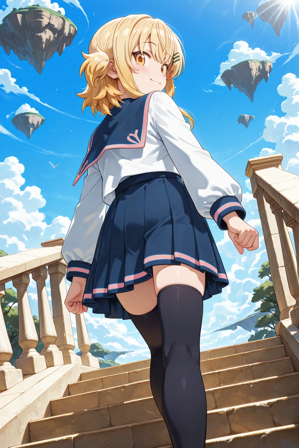 Trigger word: Null_School_Uniform, blonde hair, short hair, two side up, red hair ribbon, green hairclip, bangs, yellow eyes, school uniform, serafuku, white blouse, sailor collar, red neckerchief, long sleeves, blue skirt, pleated skirt, black thighhighs, zettai ryouiki