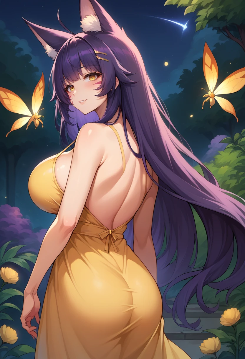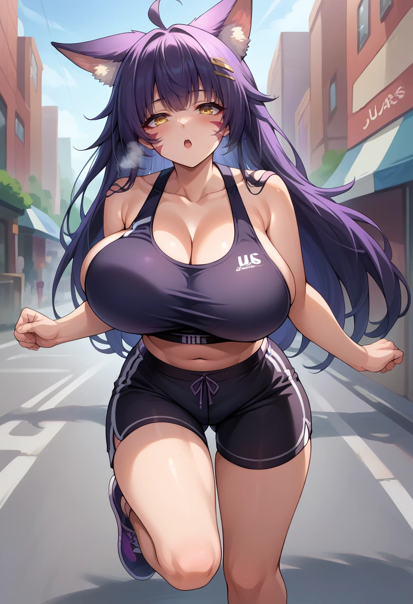 jelomusashirq, large breasts, purple hair, hairclip, yellow eyes, animal ears, facial mark, detached collar, magatama necklace, arm strap, asymmetrical gloves, tube top, slingshot swimsuit, fishnets, crotch zipper, thighhighs