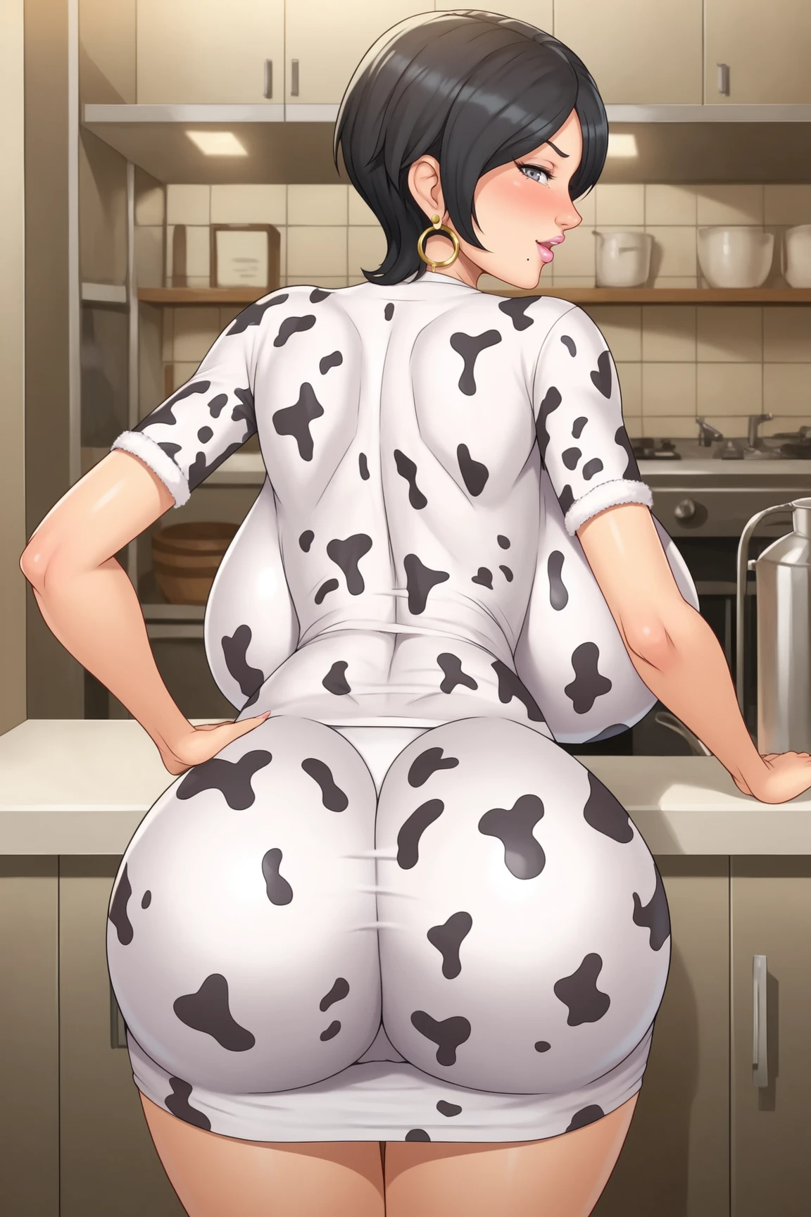 MMegamoundsMFGXL, mature female, pink lips, mole on face, grey eyes, black hair, short hair, parted bangs, yellow earrings, huge breasts, collarbone, cleavage, areola slip, cow print, white dress, short sleeves, short dress, white high heels, shoes