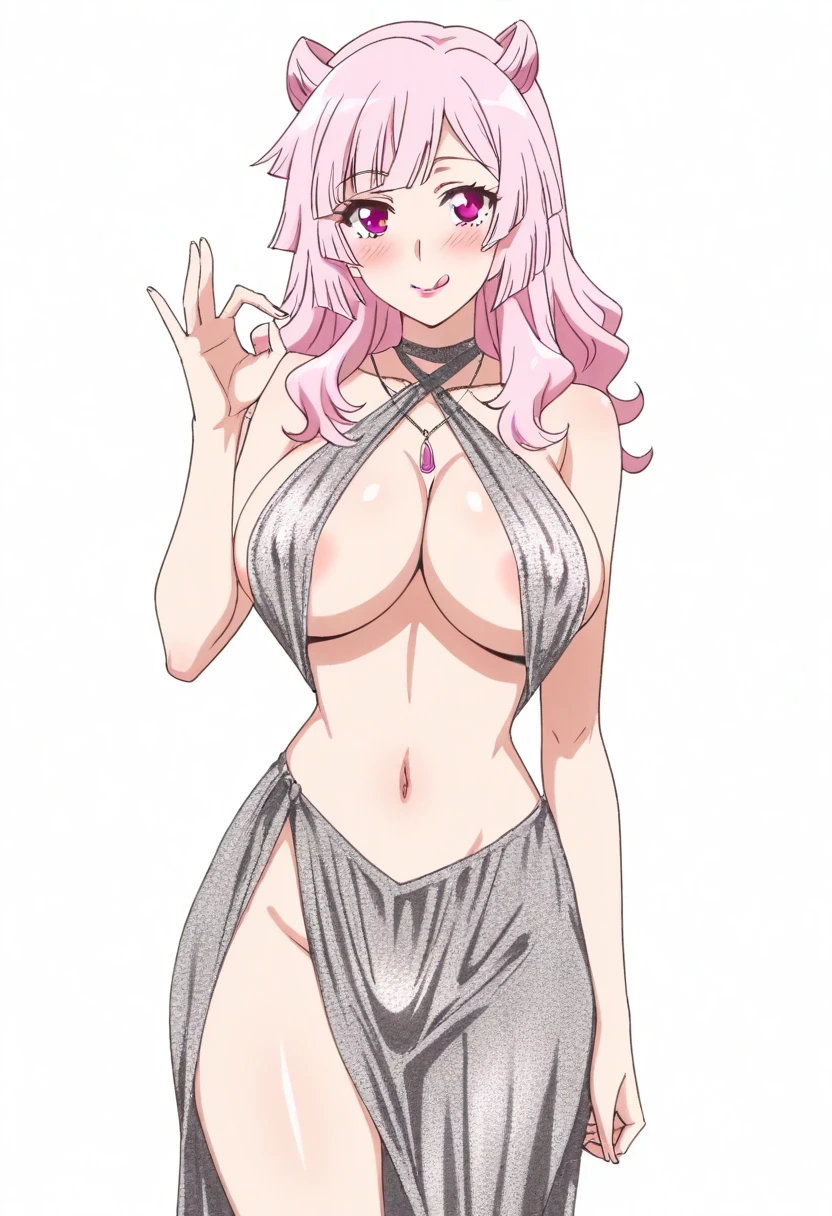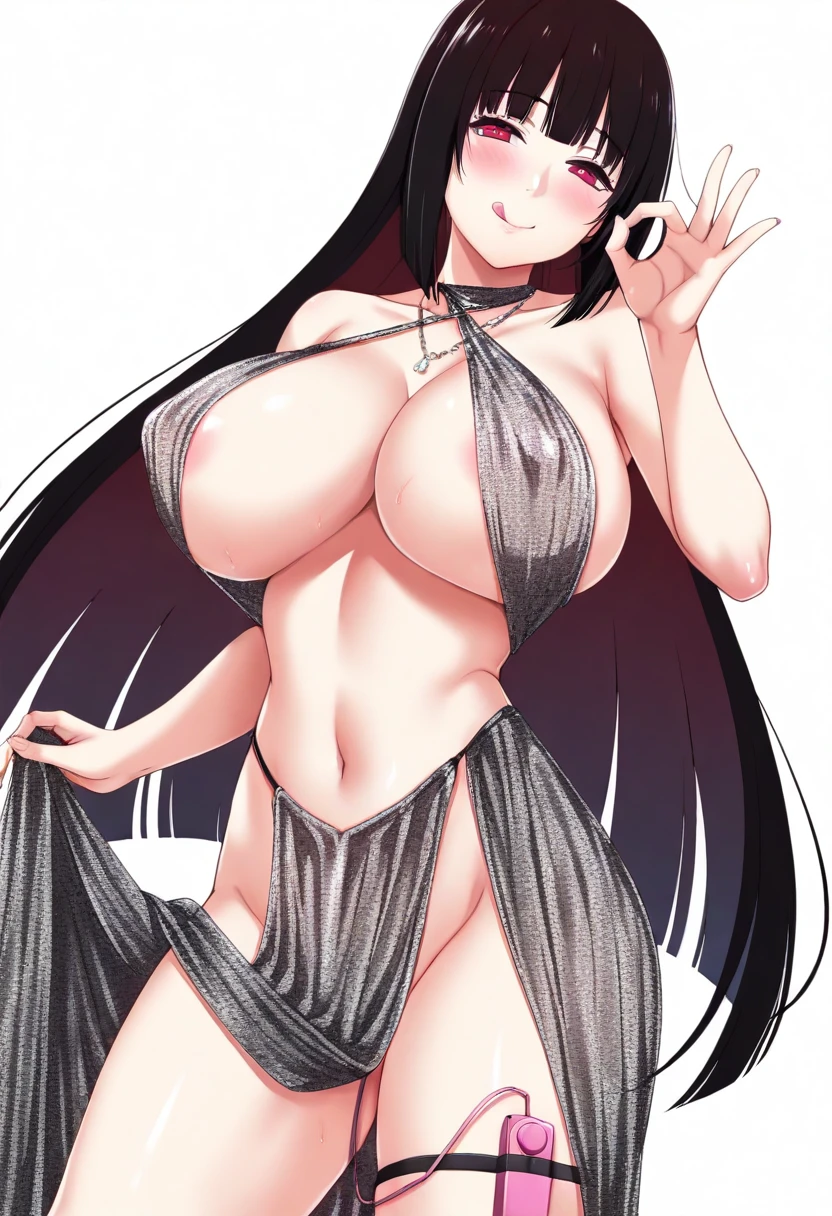 <lora:jac_natsu_kuro24:0.8>, dress,black dress,halter dress,silver dress,evening gown, pelvic curtain,revealing clothes,jewelry,necklace, criss-cross halter,halterneck, navel,cleavage,covered nipples,stomach,collarbone,plunging neckline,bare shoulders, areola slip,no panties,no bra,nipples,