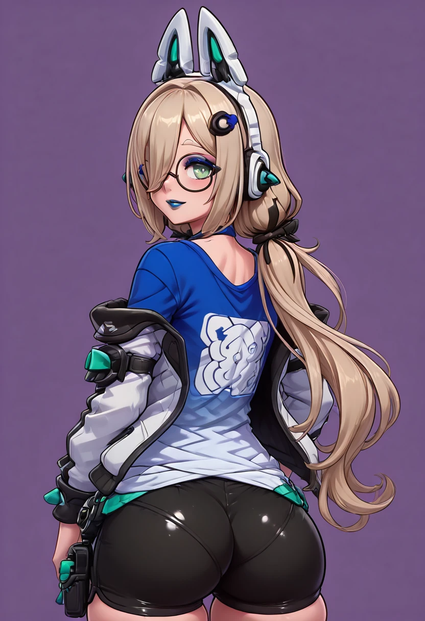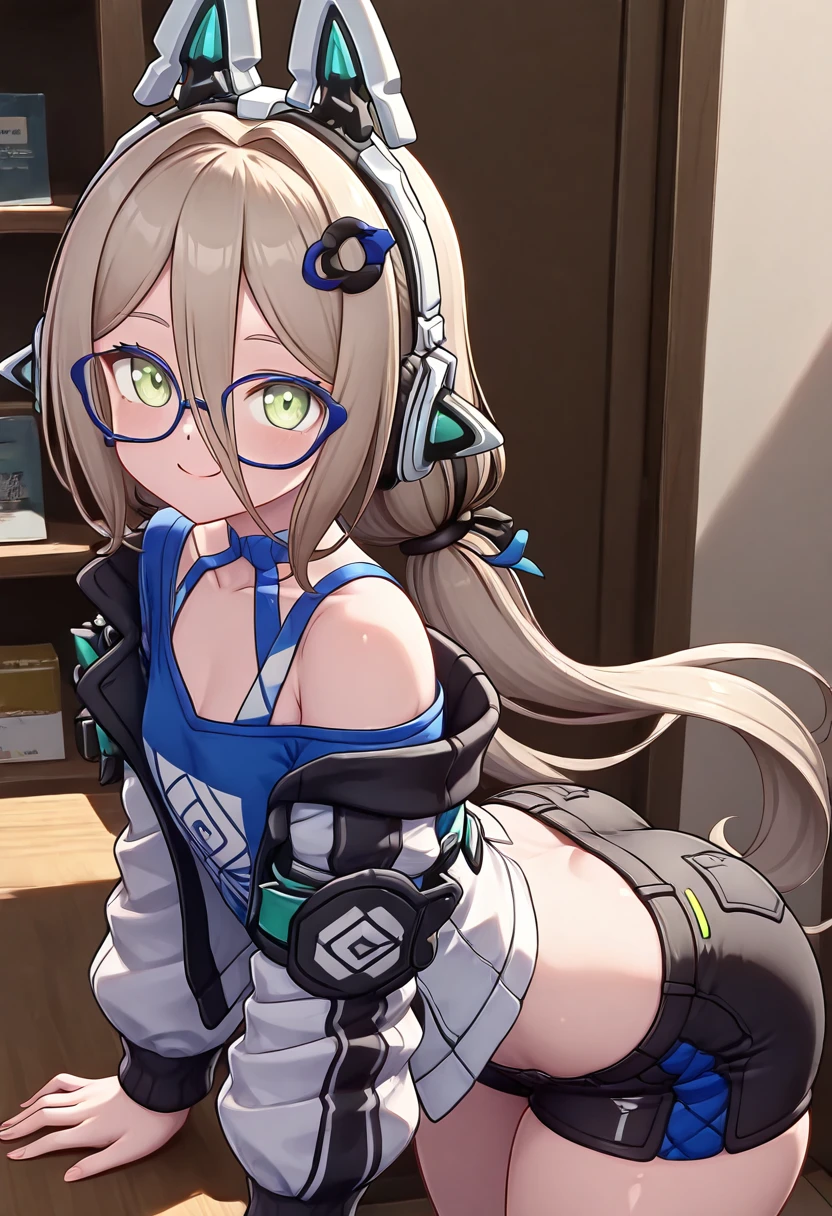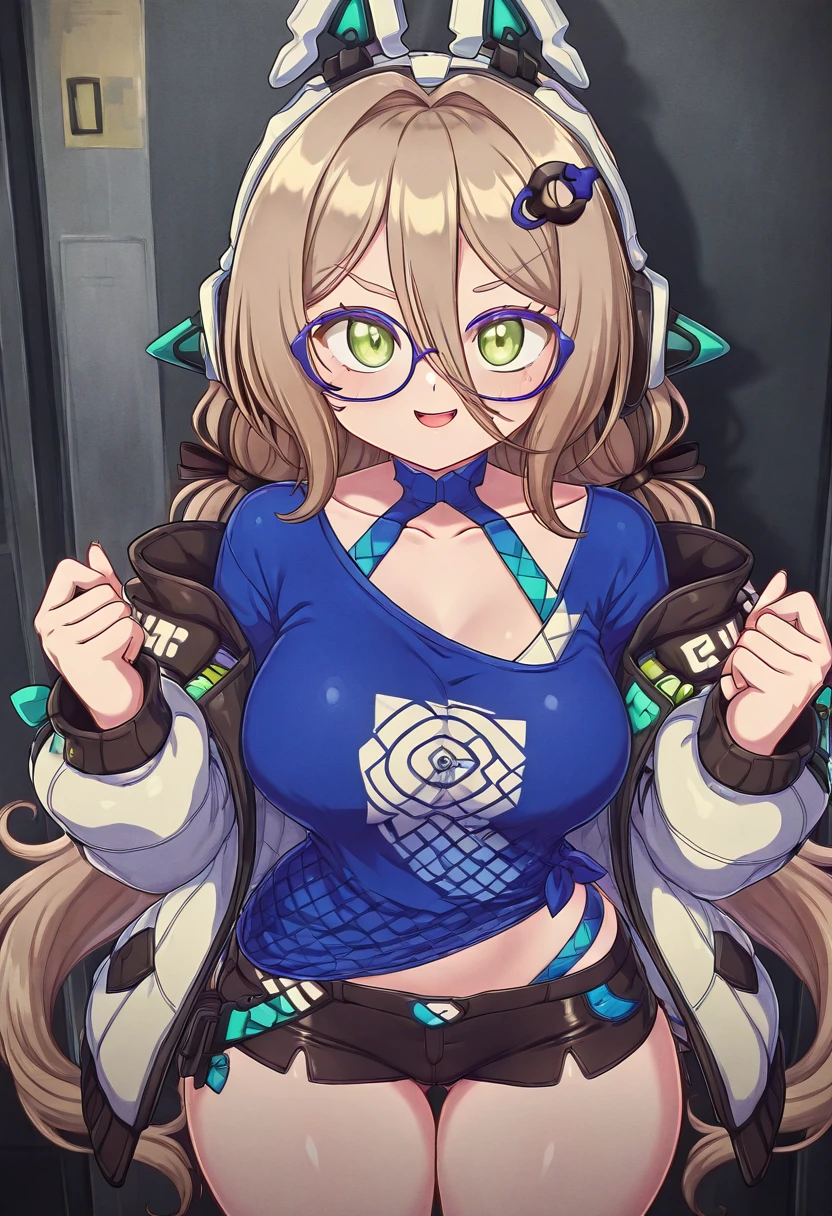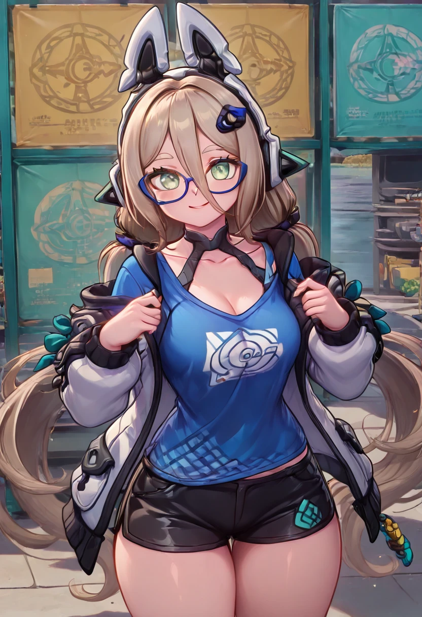 zzMimika, green eyes, light brown hair, long hair, low twintails, bangs, hair ornament, fake animal ears, animal ear headphones, glasses, , blue shirt, black shorts, short shorts,