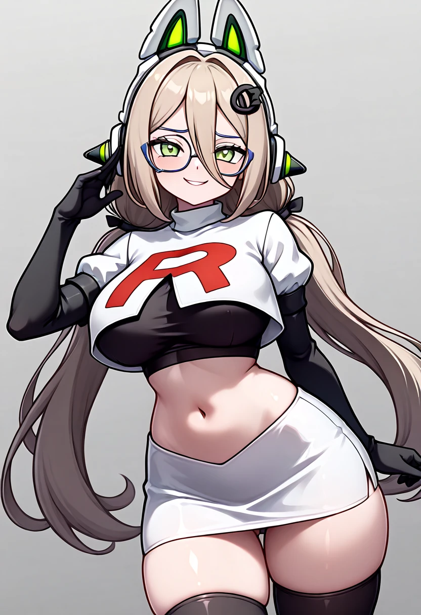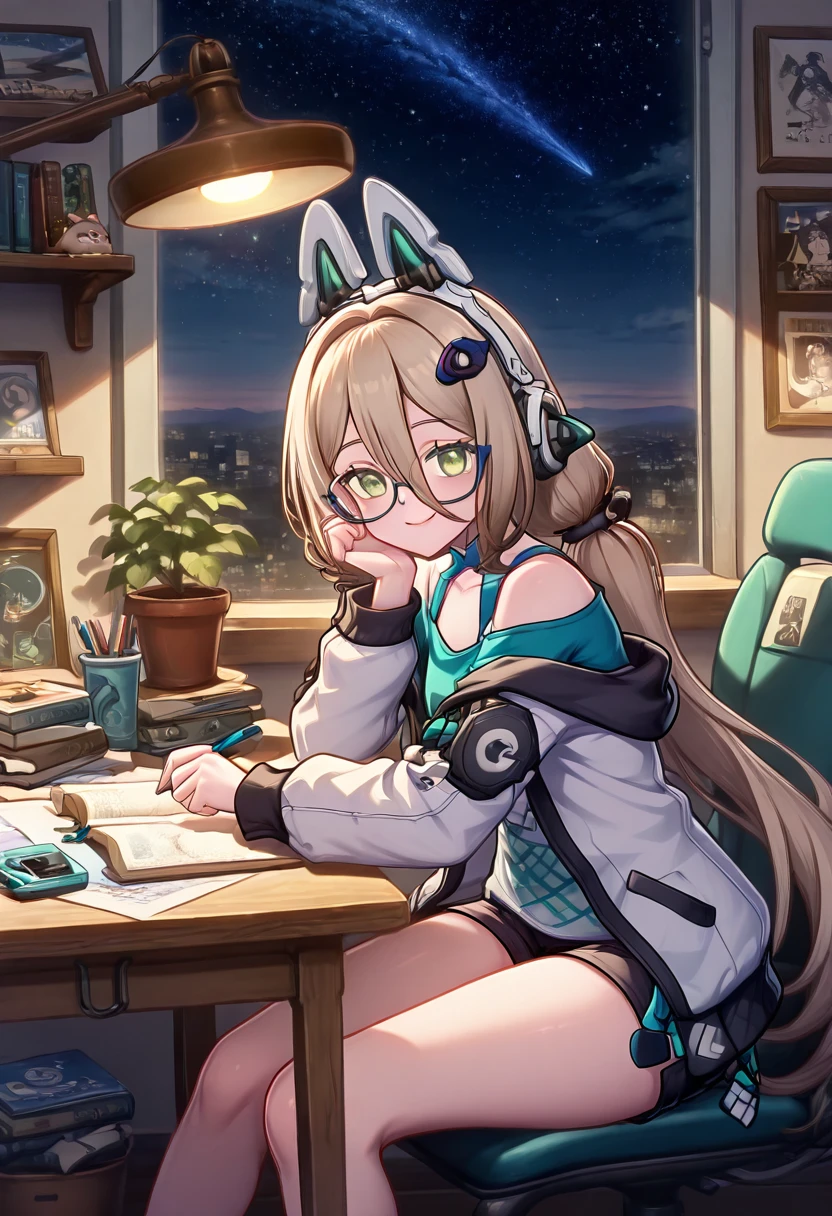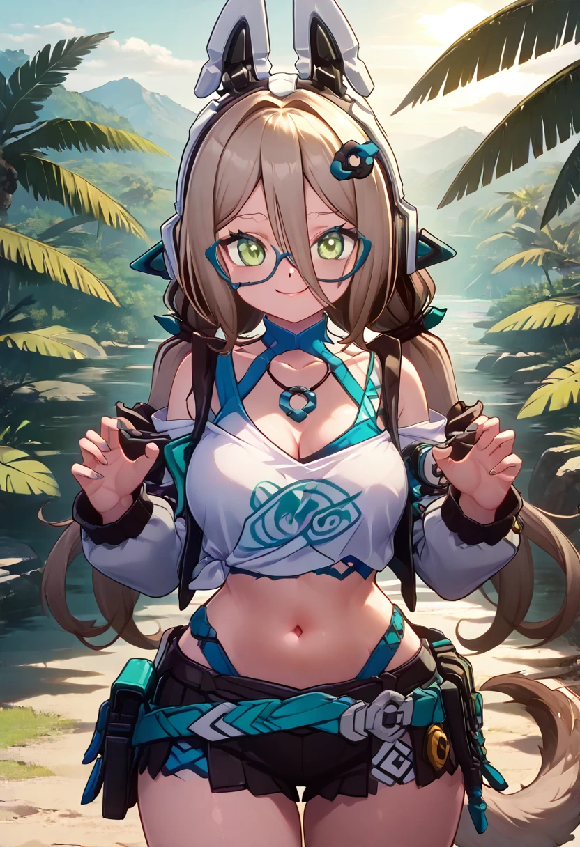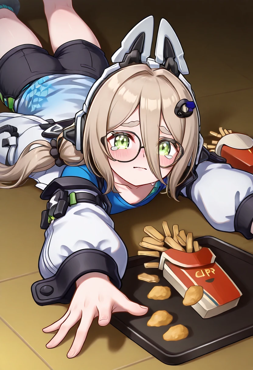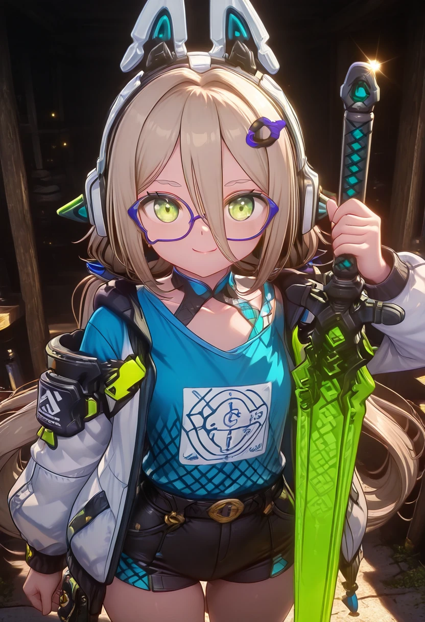 zzMimika, green eyes, light brown hair, long hair, low twintails, bangs, hair ornament, fake animal ears, animal ear headphones, glasses, , blue shirt, black shorts, short shorts,