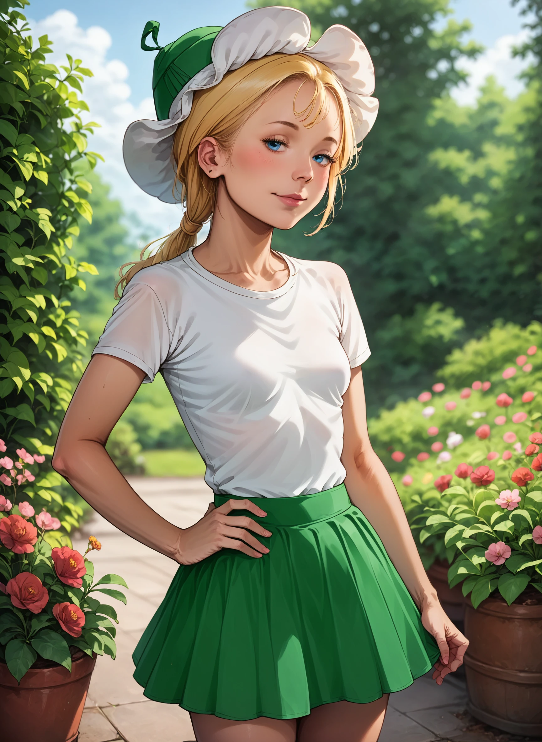 Additional tags: [white|green] tulip hat, white shirt, green skirt