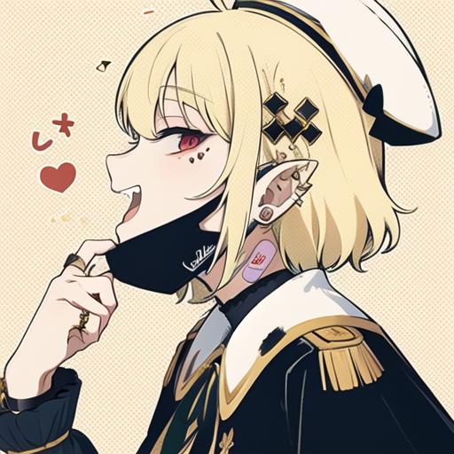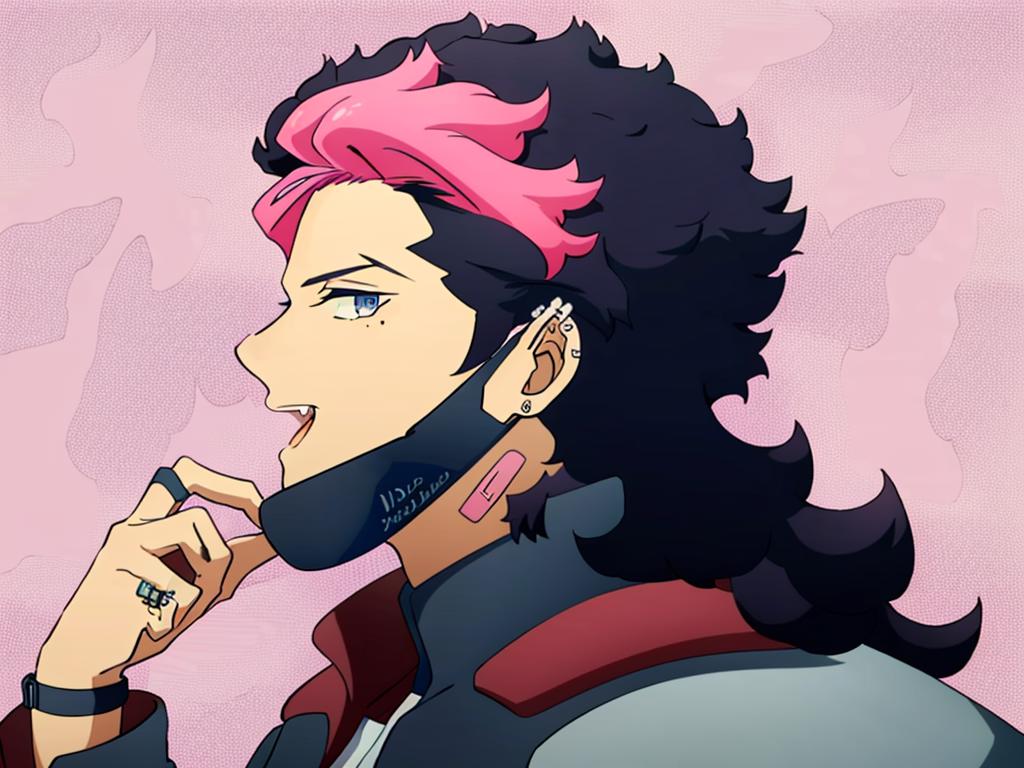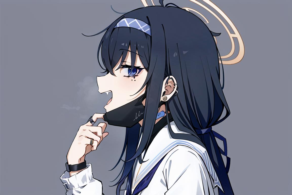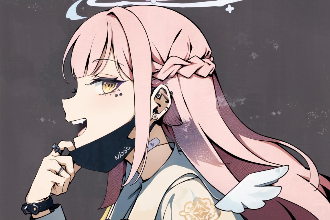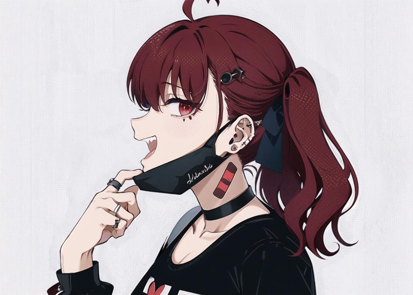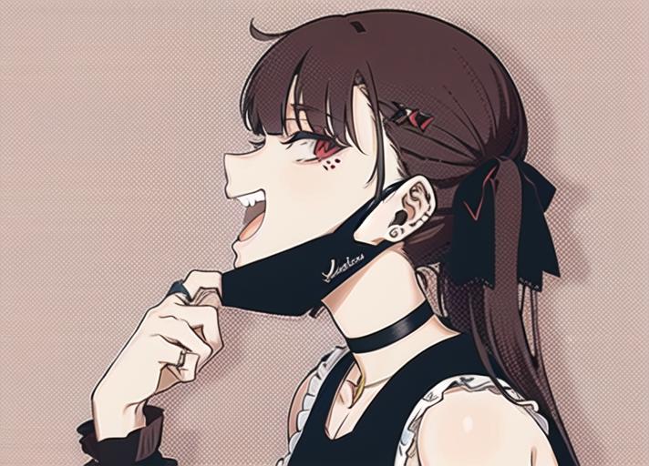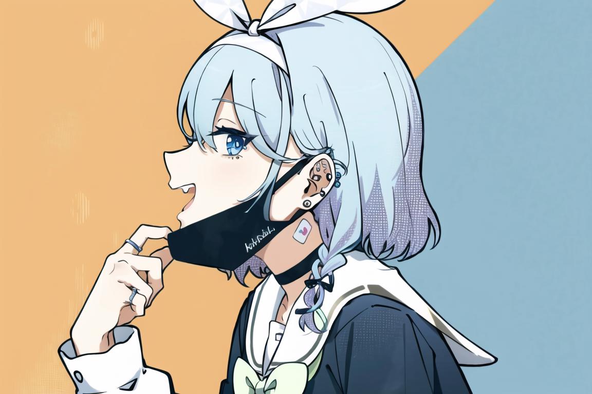 recommended prompt: vampire, looking at viewer, smile, open mouth, from side, mask, piercing, ring, ear piercing, bandaid, simple background, watch, mouth mask, wristwatch, stud earrings, halftone, mask pull, jirai kei
