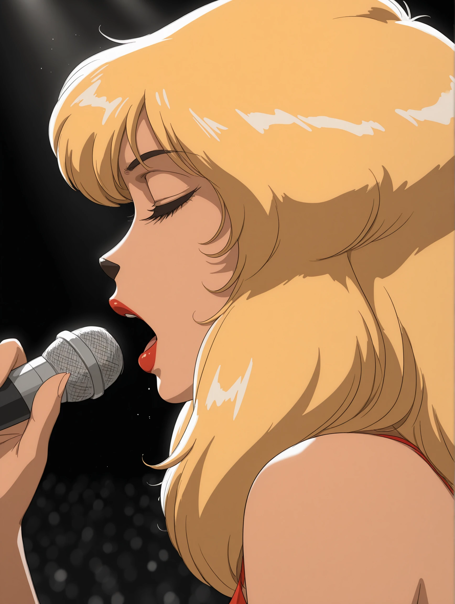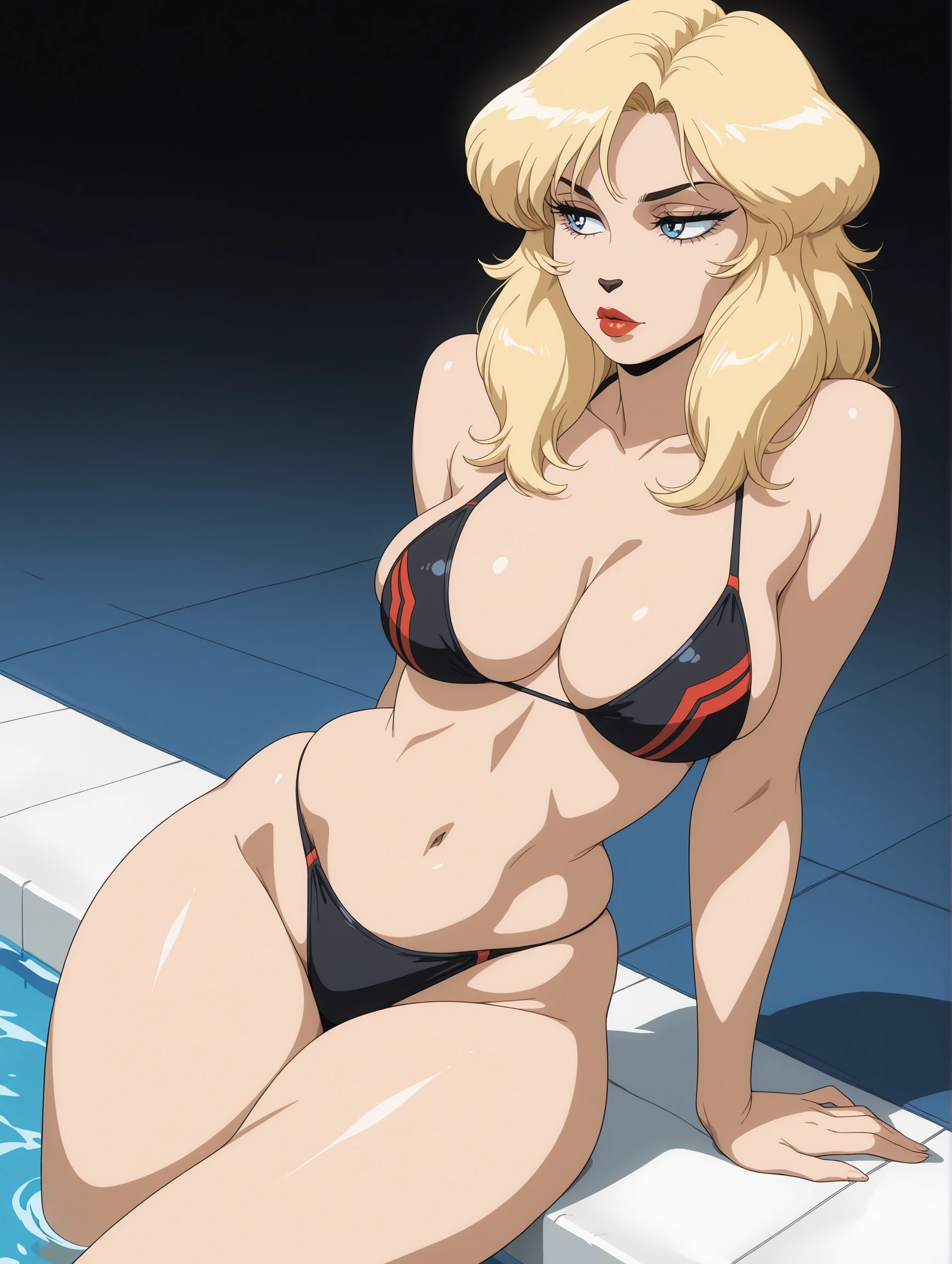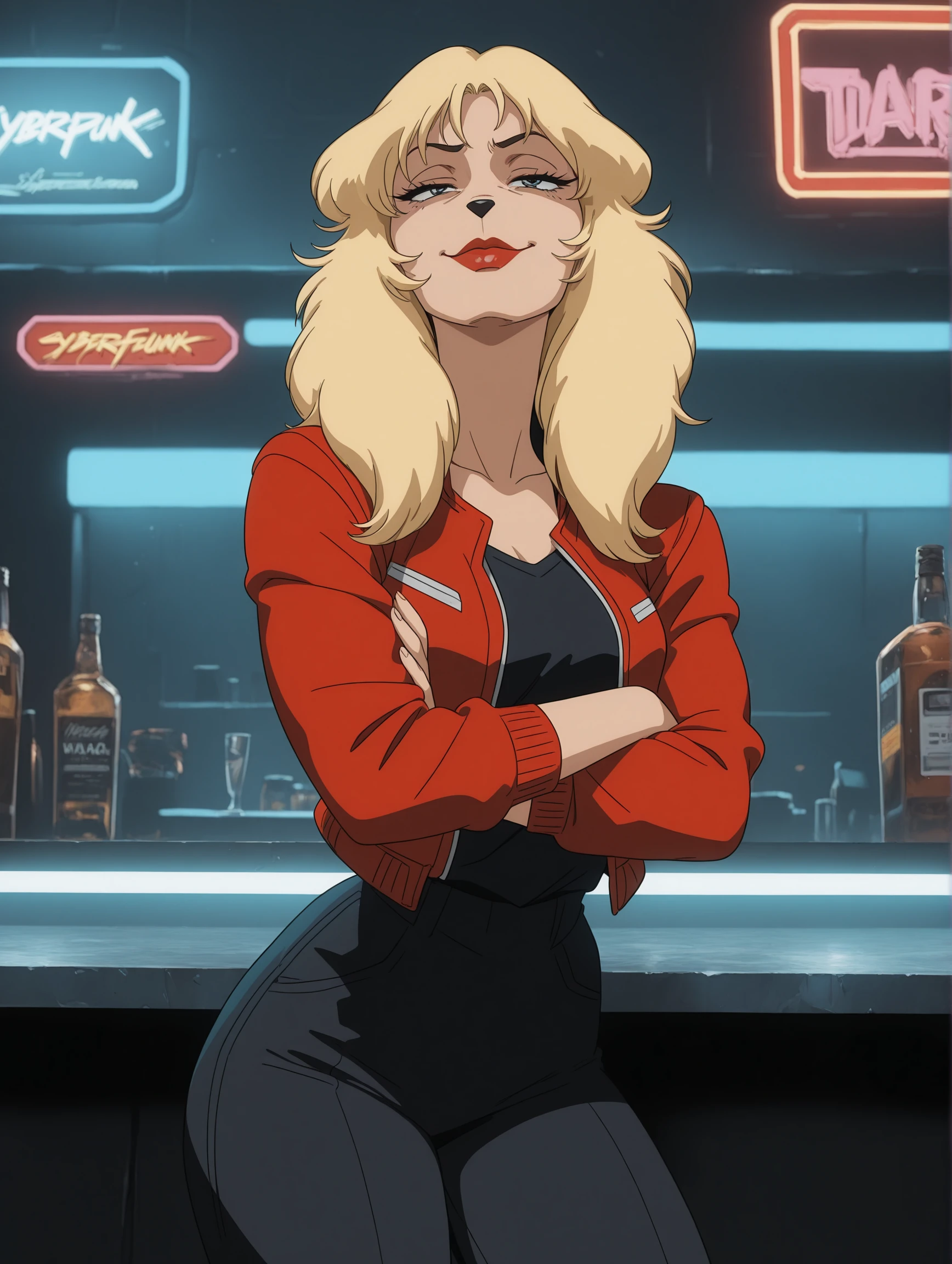 blonde hair, red lips, animal nose, blue eyes,