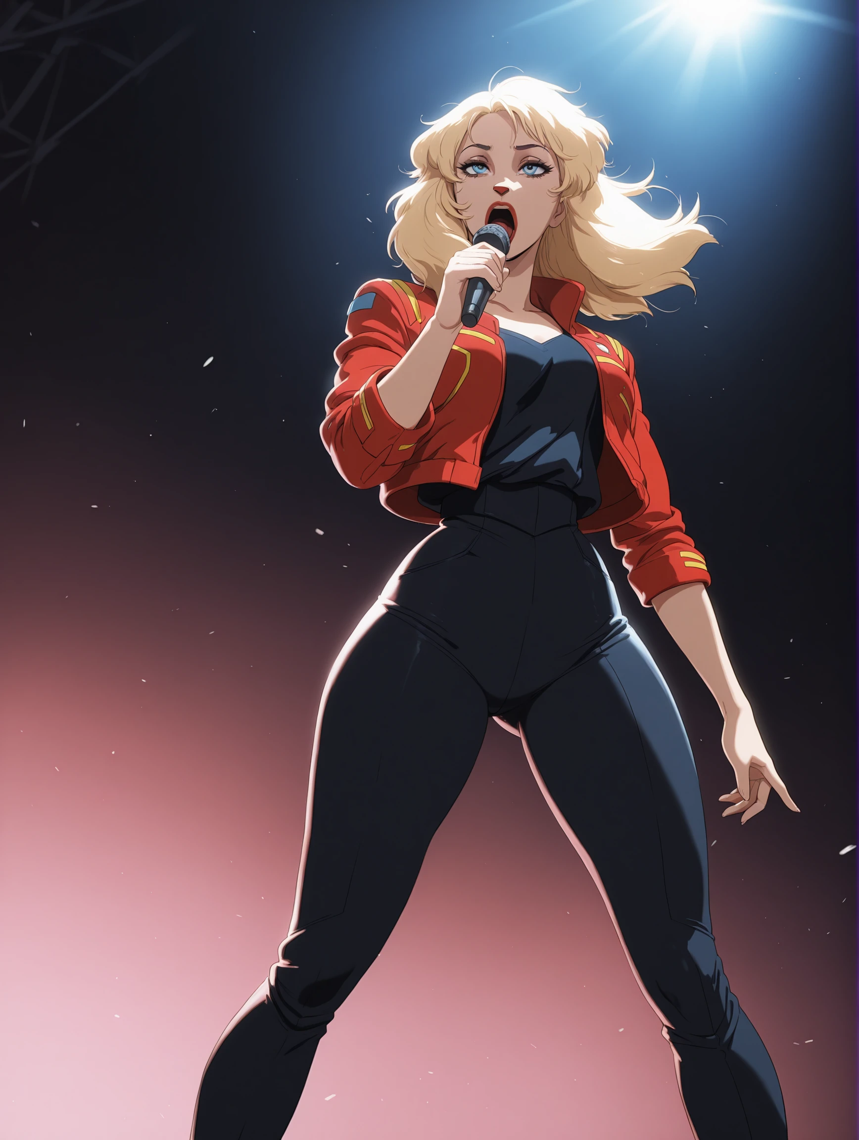 red jacket, black pants,