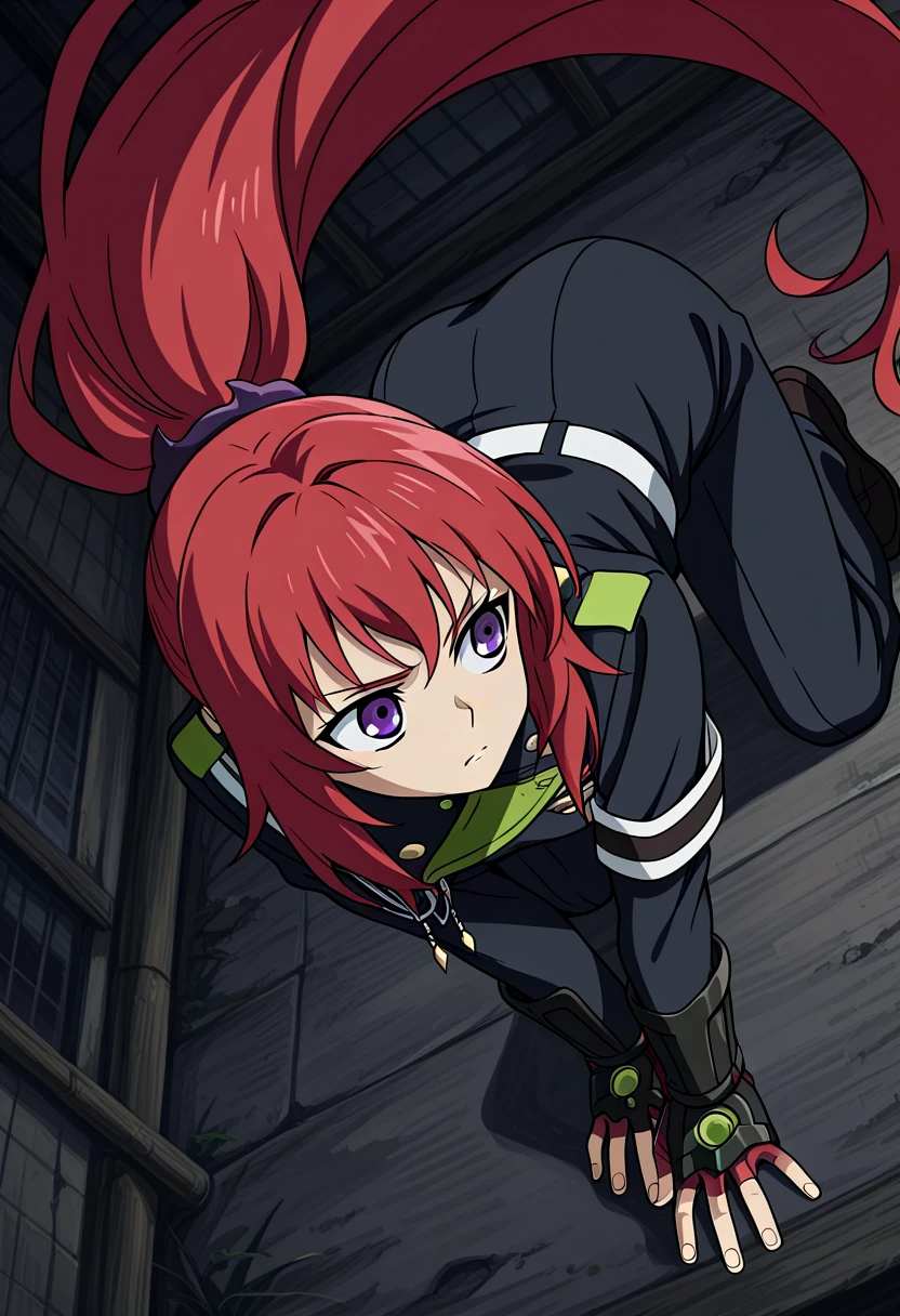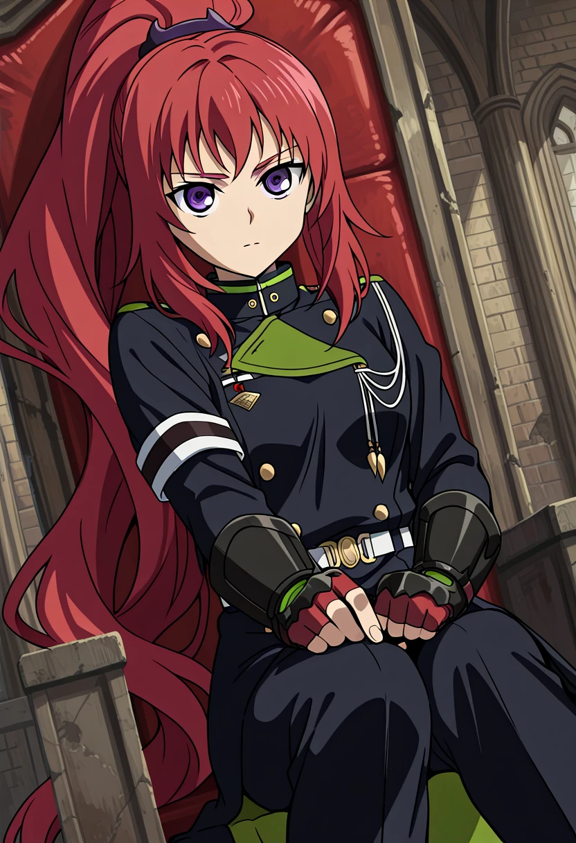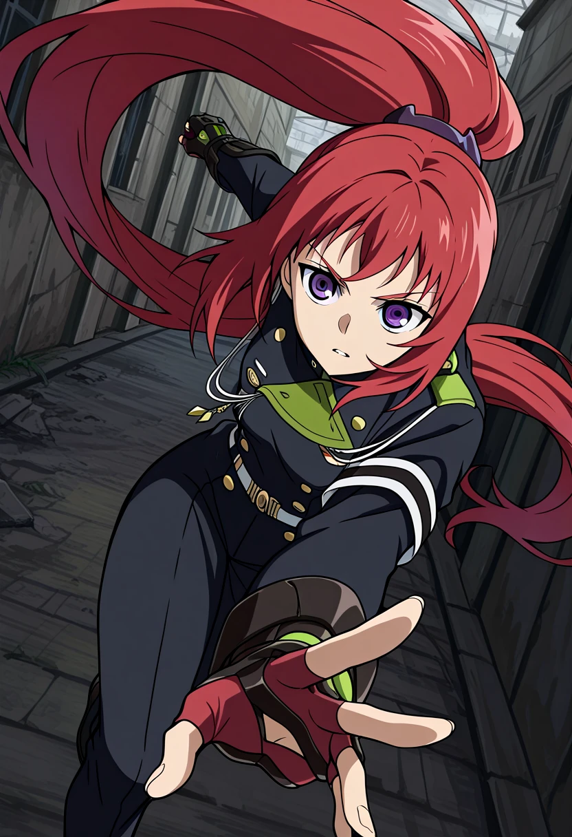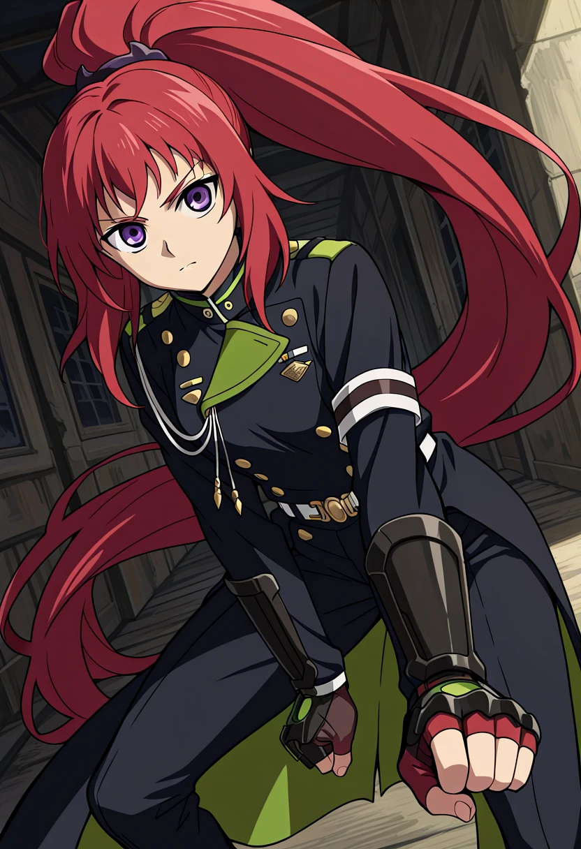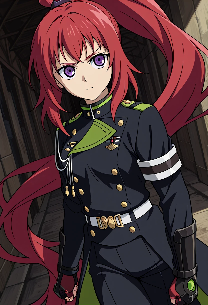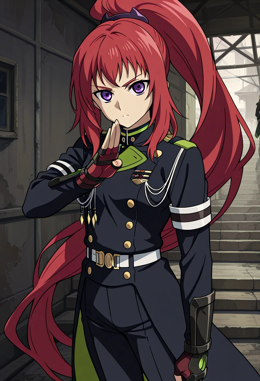 1girl, mito jujo, vampire slayer uniform, red hair, purple eyes, ponytail,