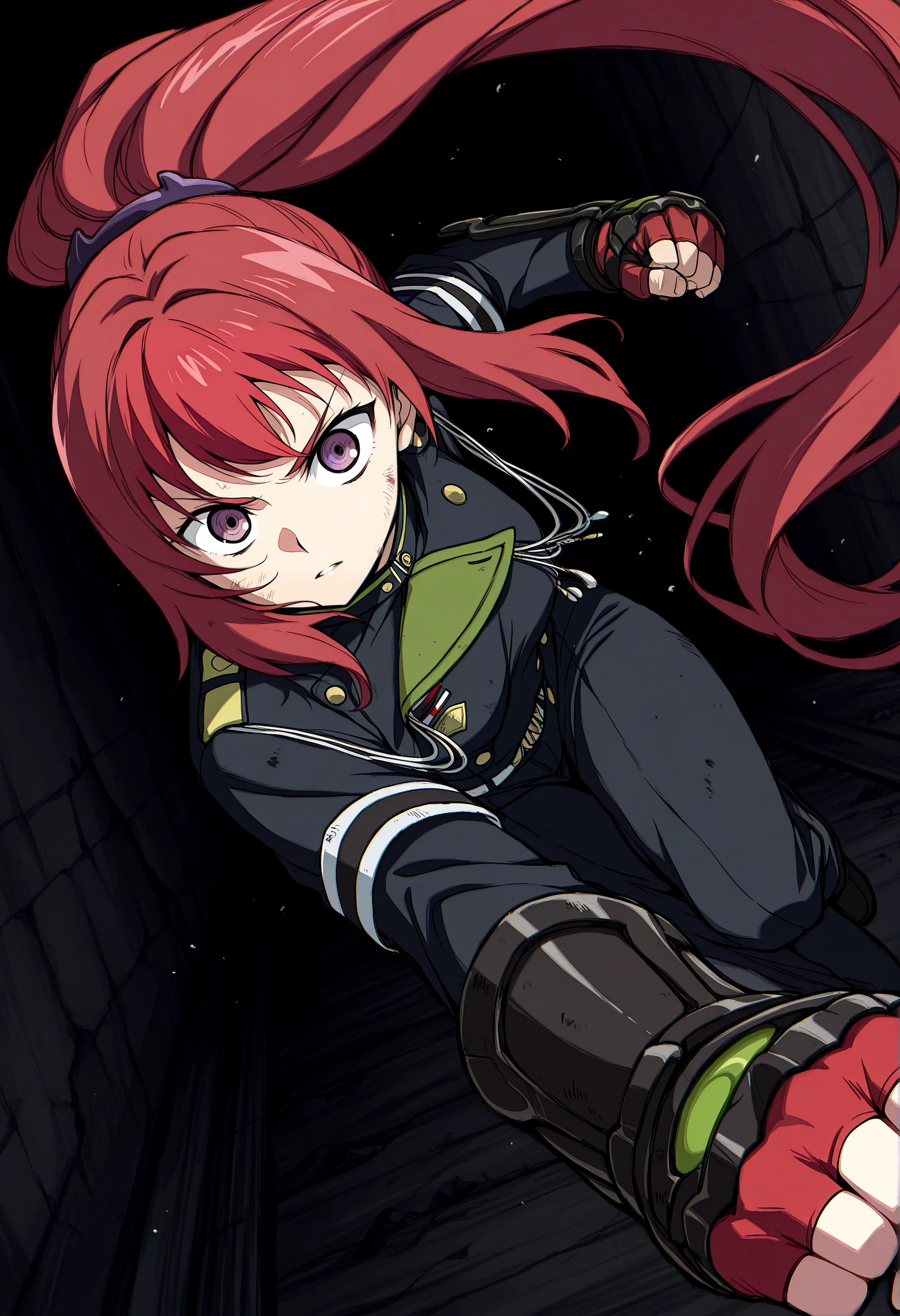The trigger words are:1girl, mito jujo, vampire slayer uniform, red hair, purple eyes, ponytail