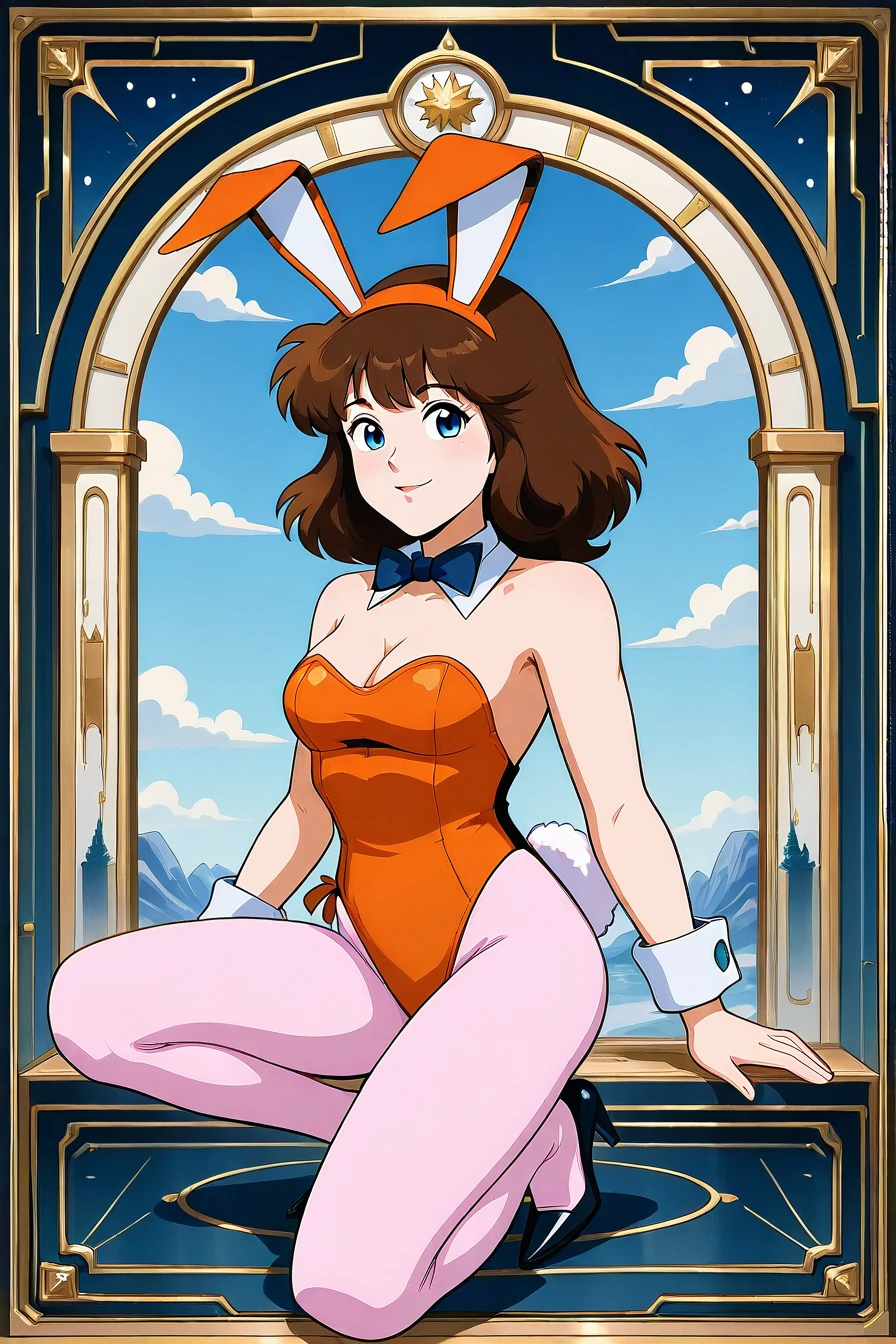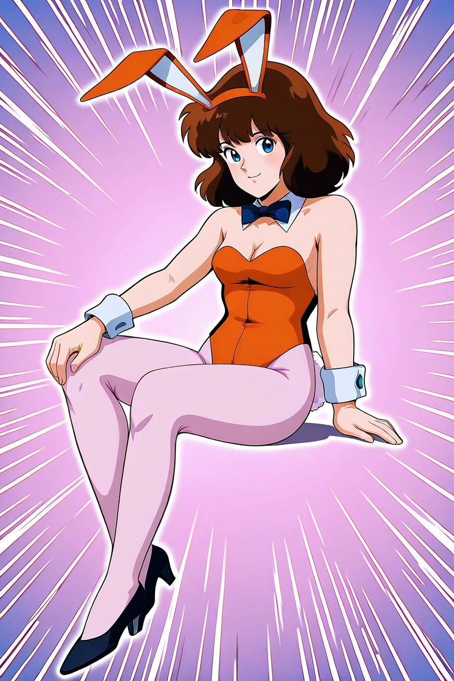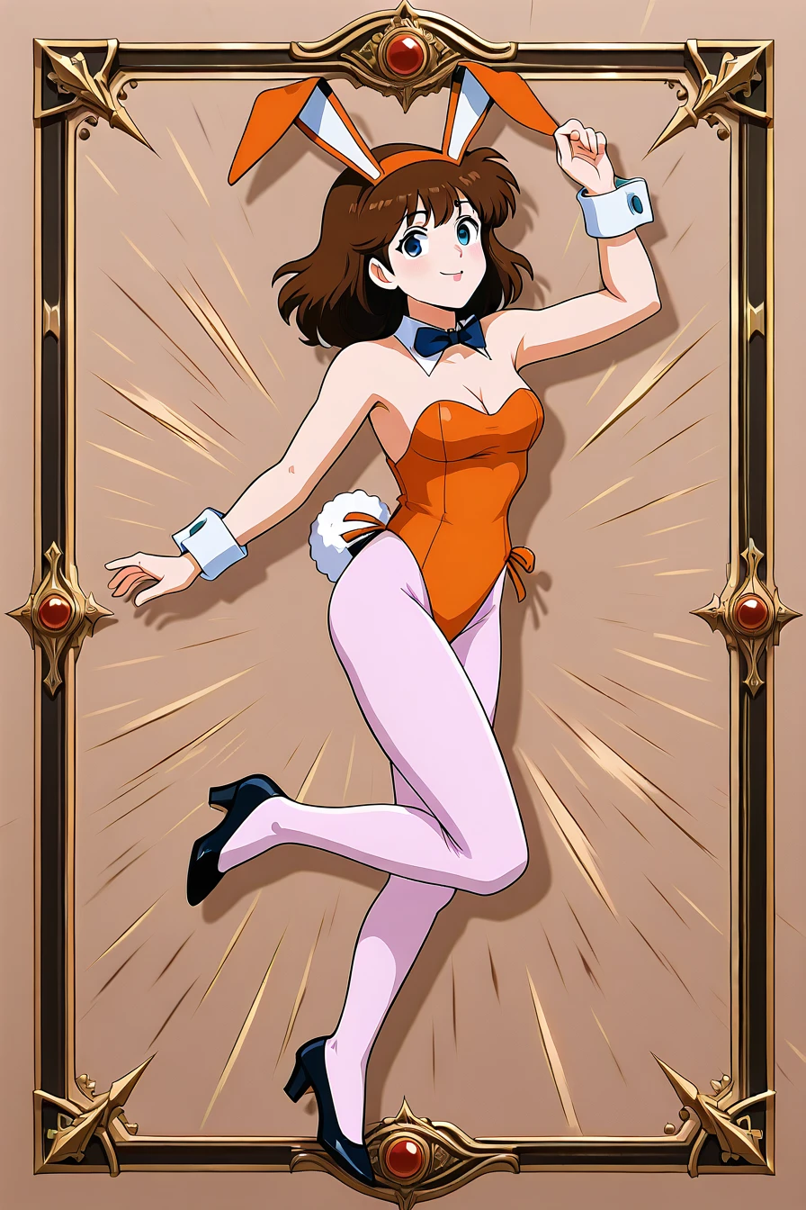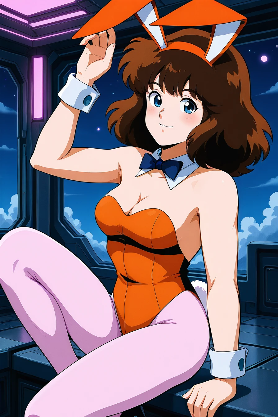 DaiconGirl, bunny girl, 1980s anime, short brown hair, blue eyes,orange sleeveless leotard, pink pantyhose, blue bowtie, white cuffs, white collar, black heels, bunny ears, vintage Gainax