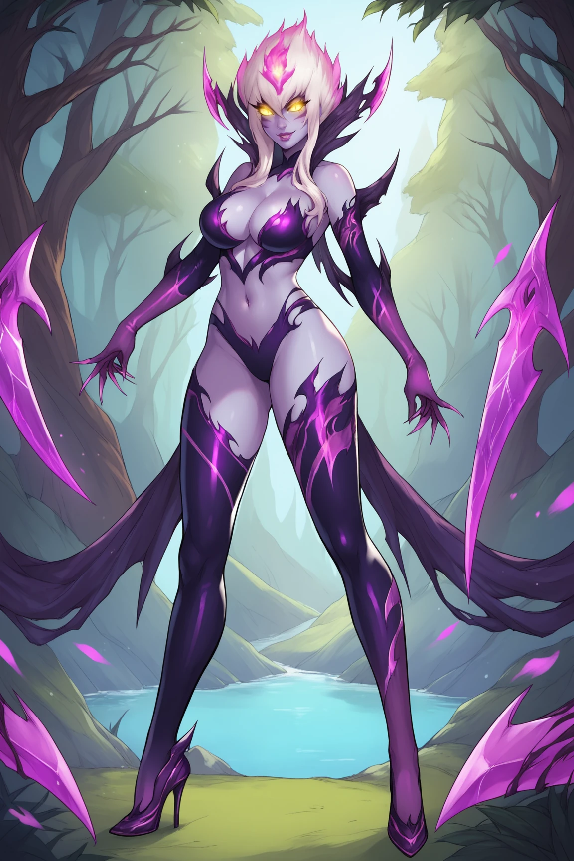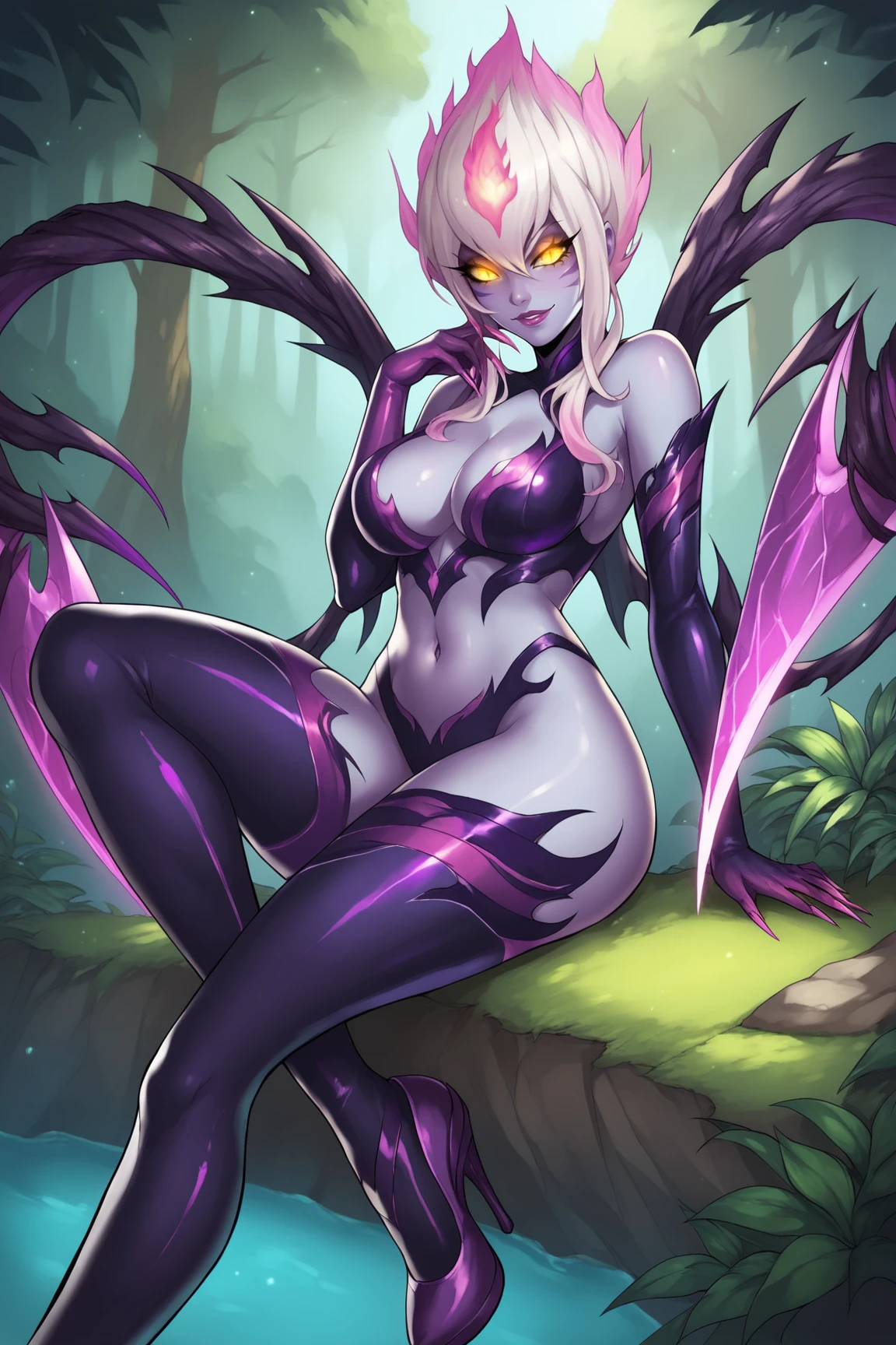 EvelynnLoLXL, black slit pupils, facial mark, purple lips, yellow eyes, glowing eyes, white hair, colored hair, pink flame hair, hair between eyes, sidelocks, bangs, purple skin, colored skin, large breasts, bare shoulders, bodysuit, cleavage, navel, elbow gloves, purple claws, thighhighs, high heels, weapon wings, two weapon