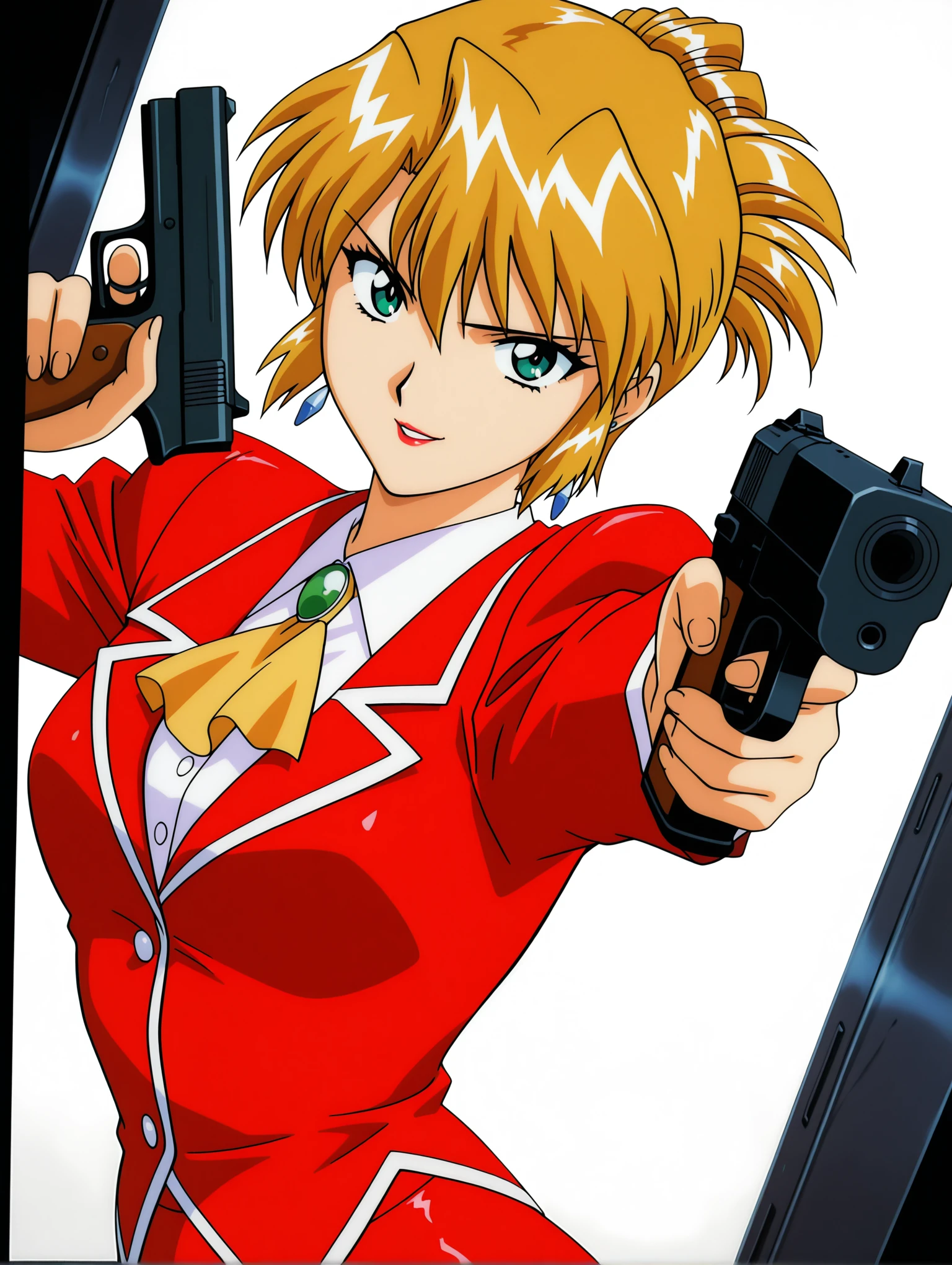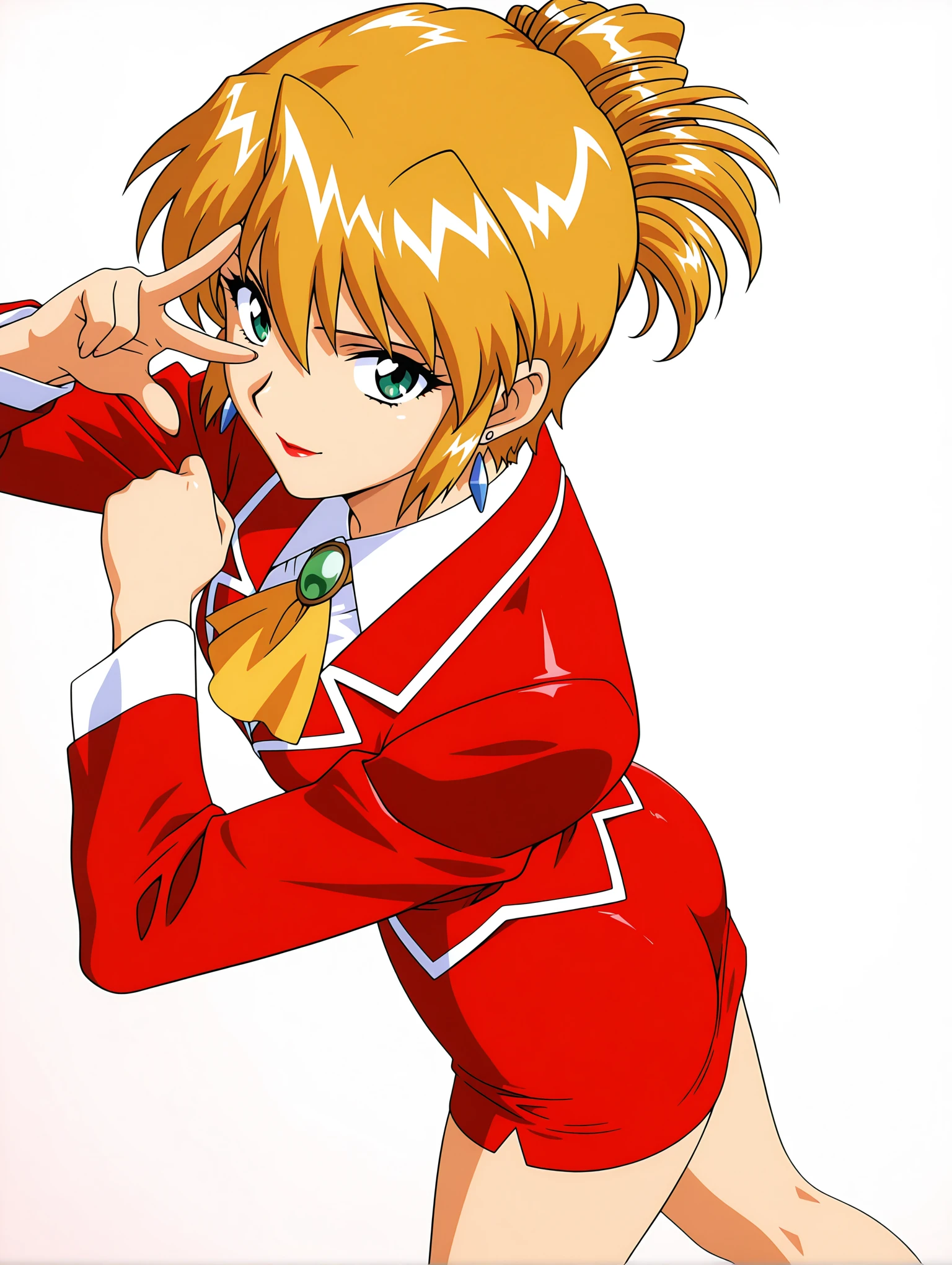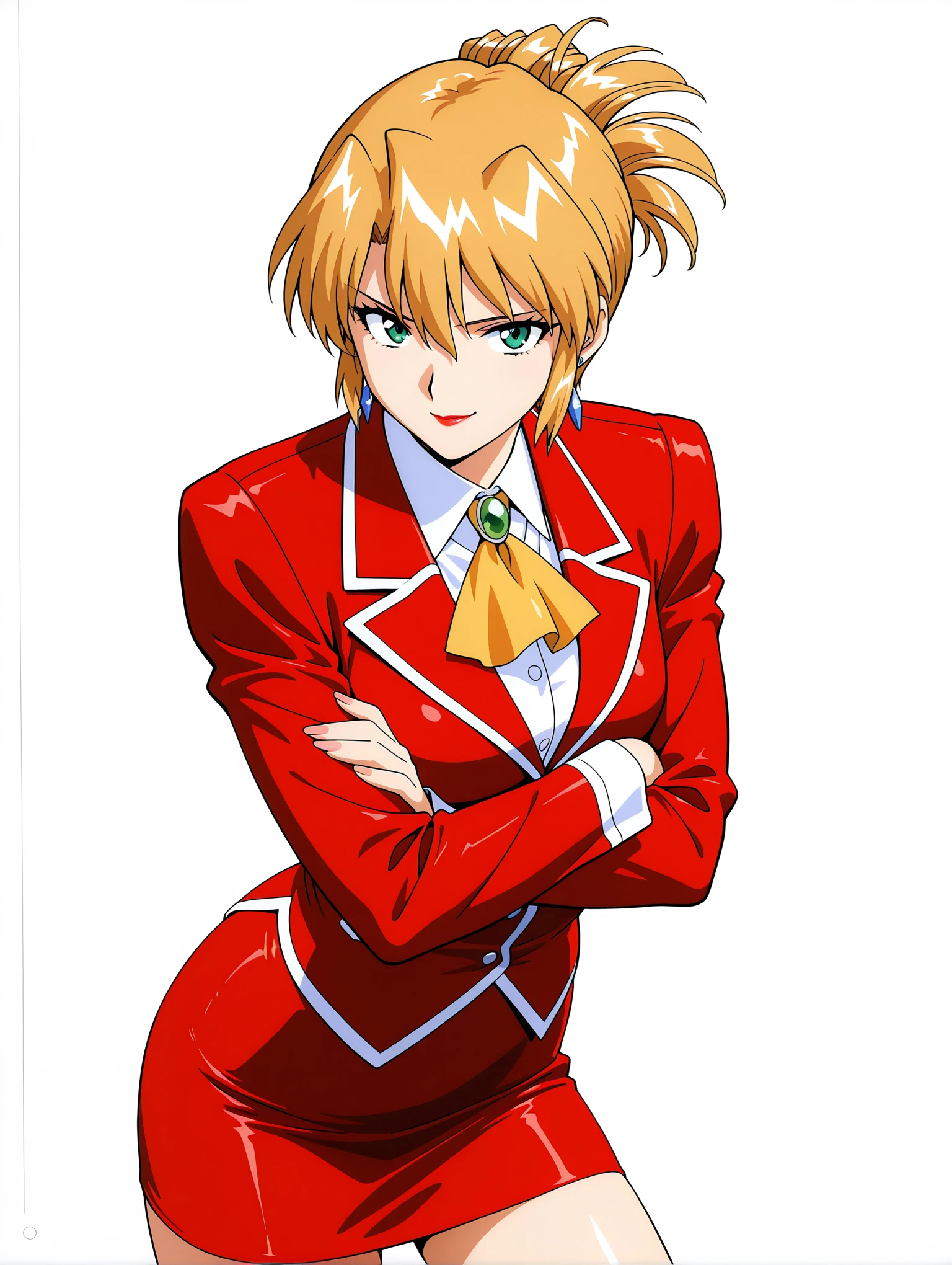 a_clothes,brooch,white shirt,red jacket,long sleeves,yellow ascot,red pencil mini skirt,red high heels,