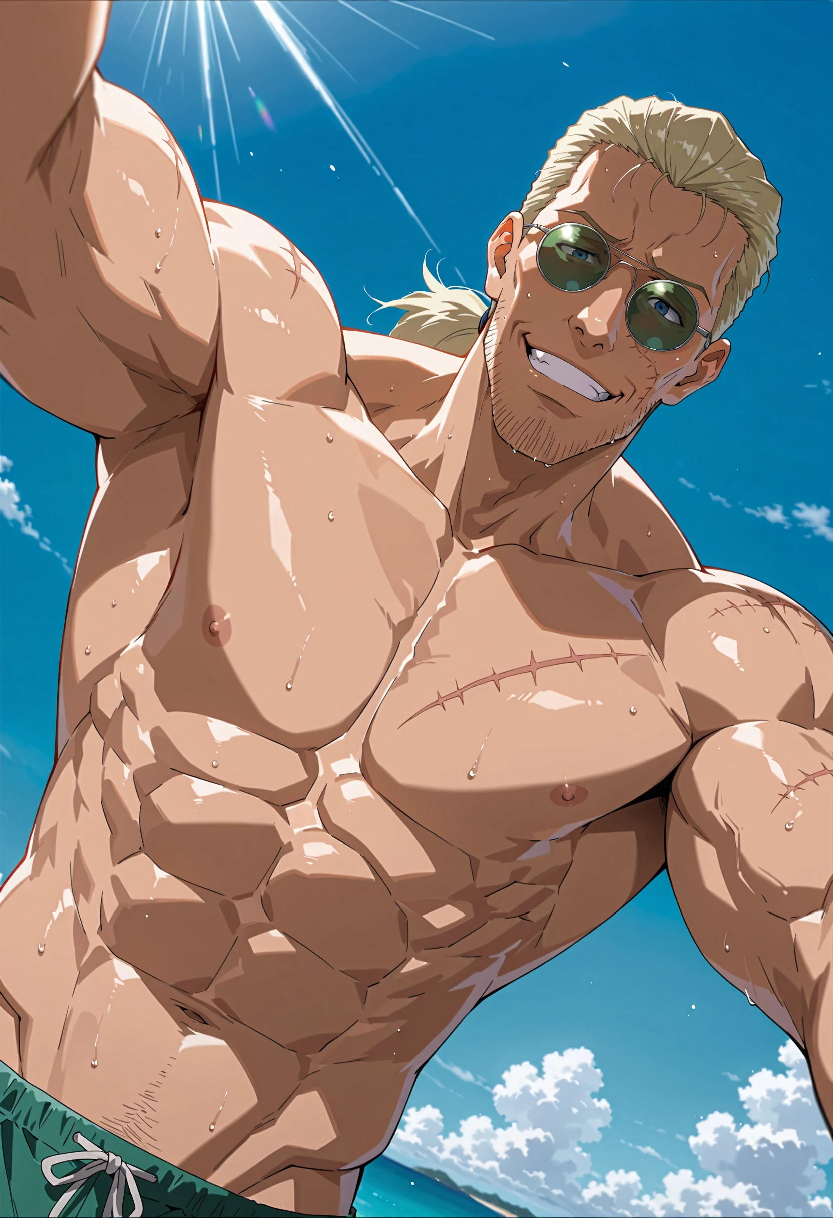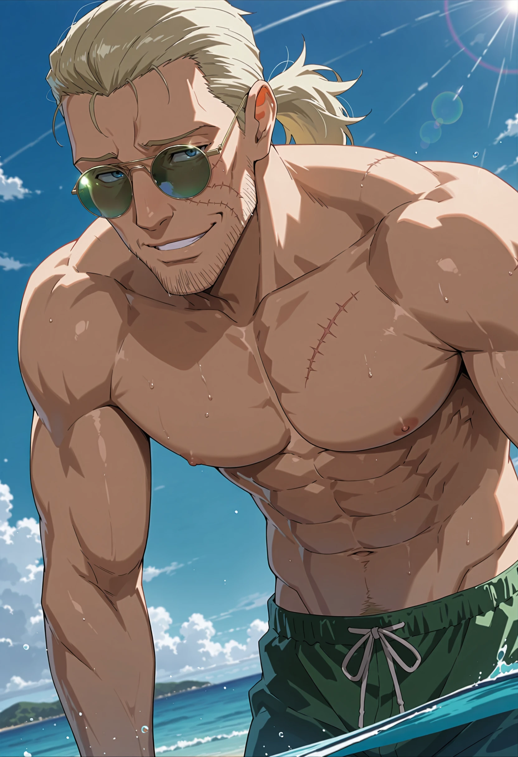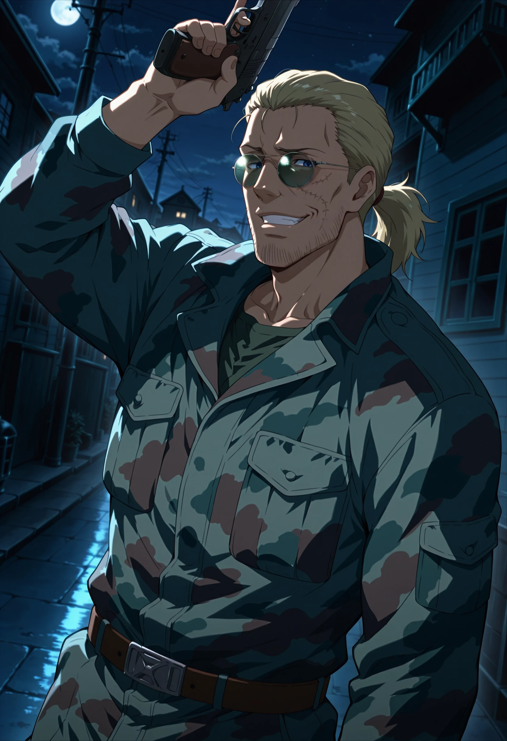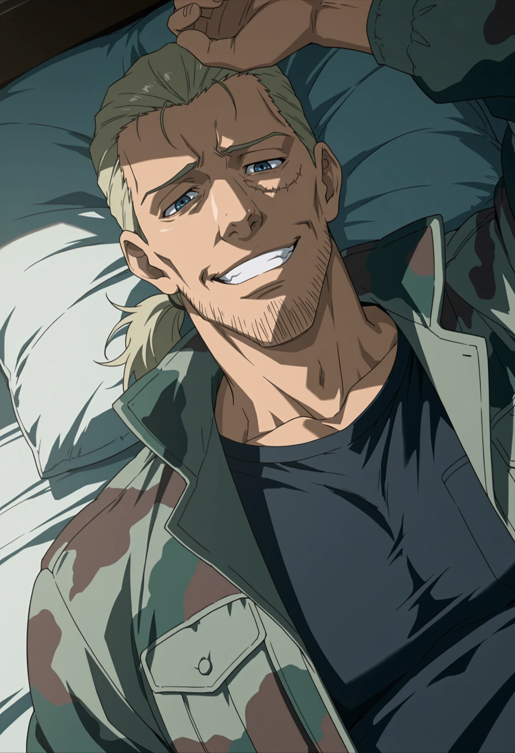 blonde hair, ponytail, blue eyes, stitch scar on face, stubble, military uniform, camouflage jacket, black t-shirt